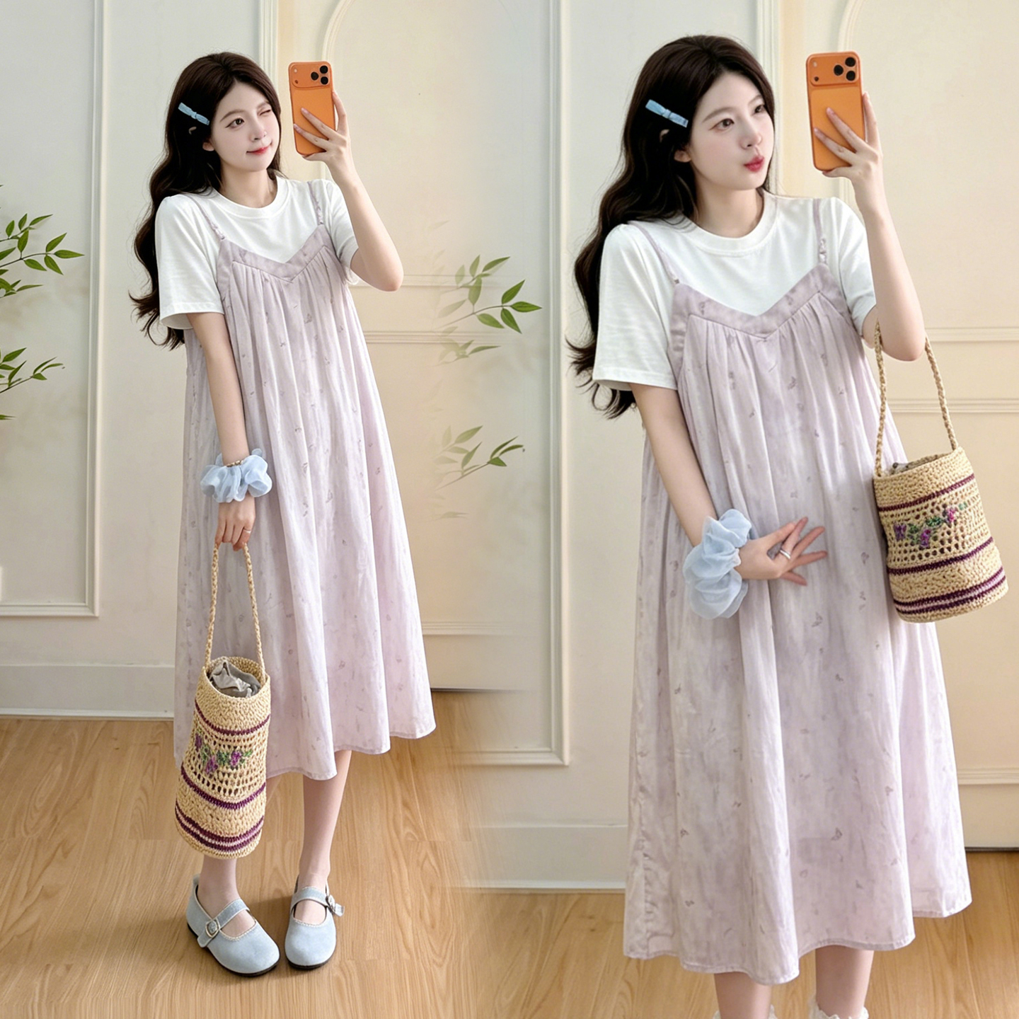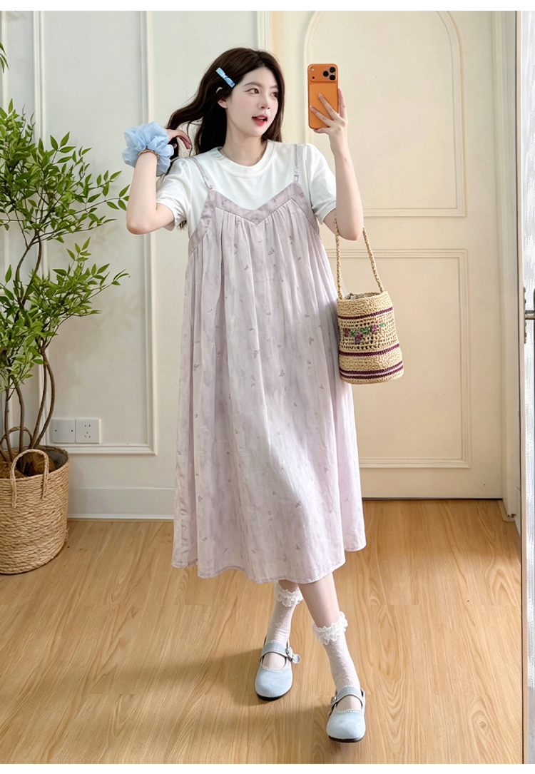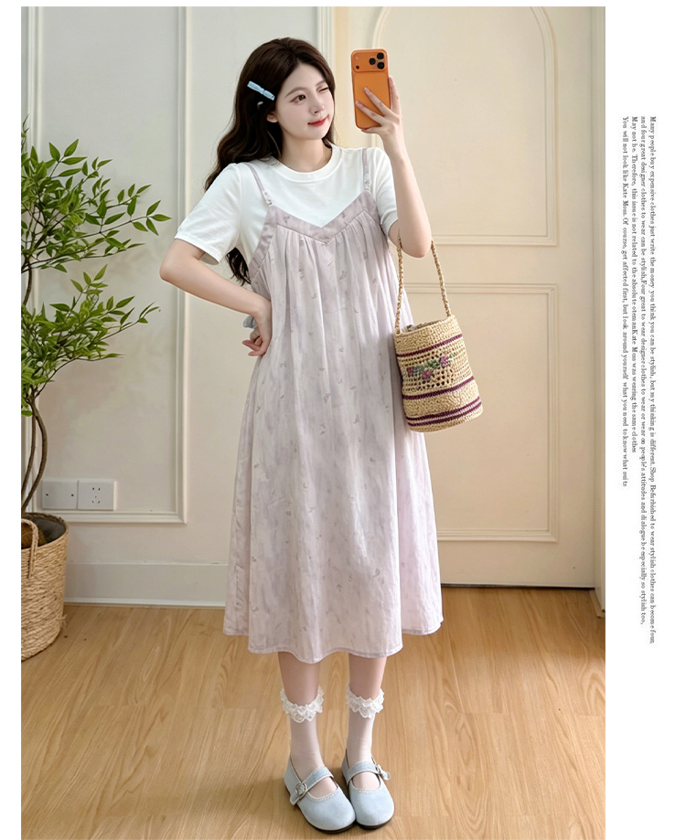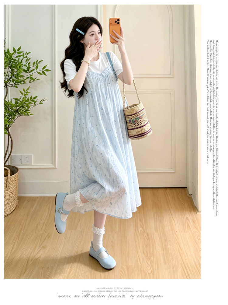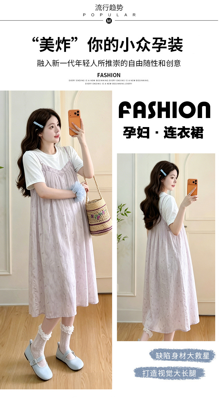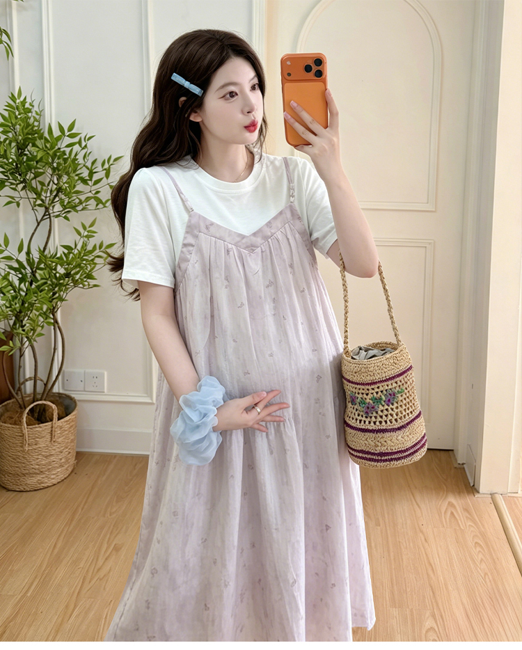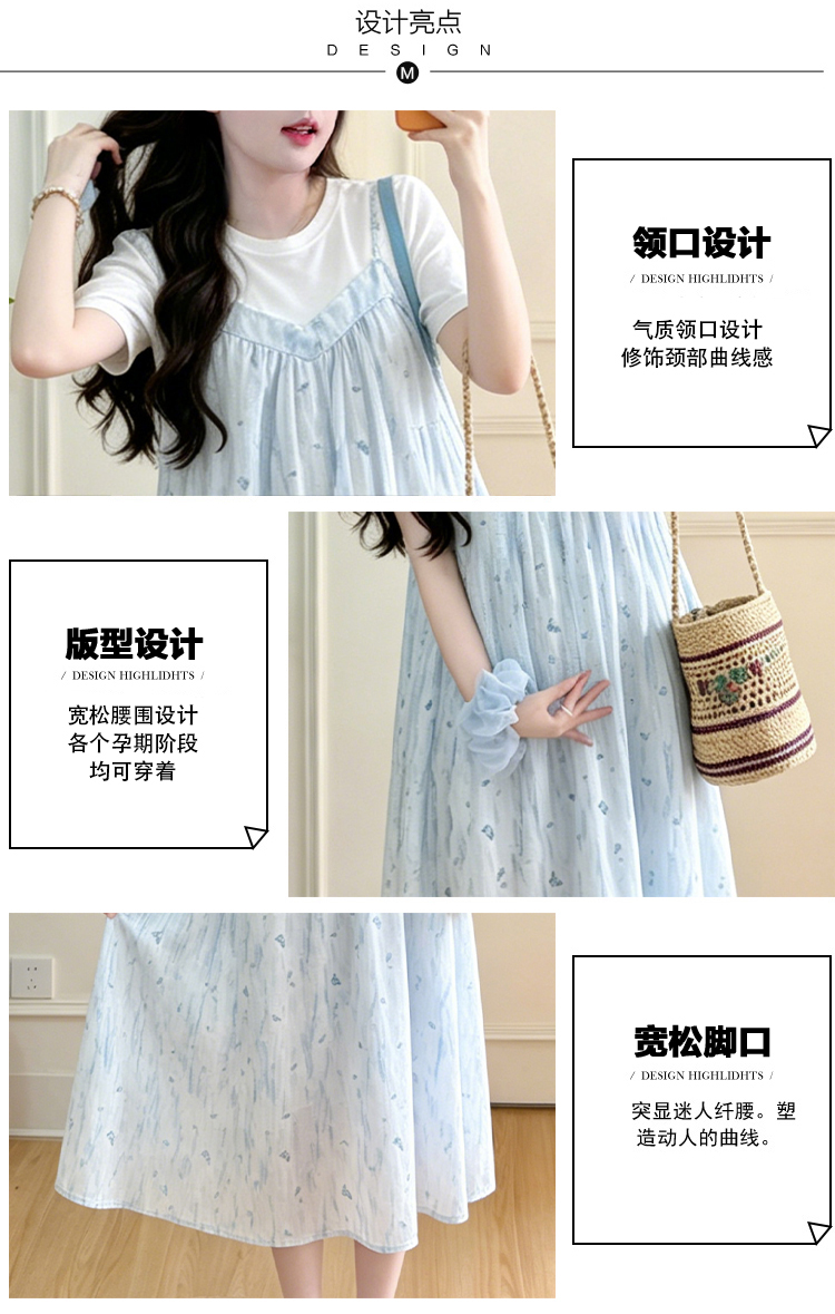 실사 출산 착용 여름 드레스 패션 임산부 드레스 루즈핏 중간 길이 멜빵 치마 세트 외국 가스 트렌디 엄마 반팔