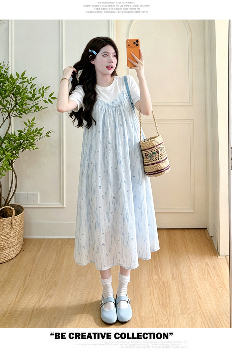 실사 임산부 여름 새로운 한국 스타일 패션 연령 감소 작은 청신 패치워크 페이크 레이어드 빅 사이즈 드레스