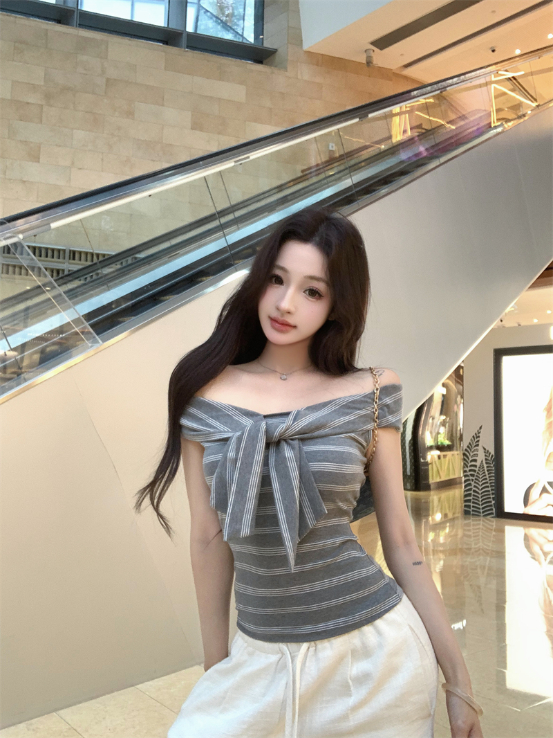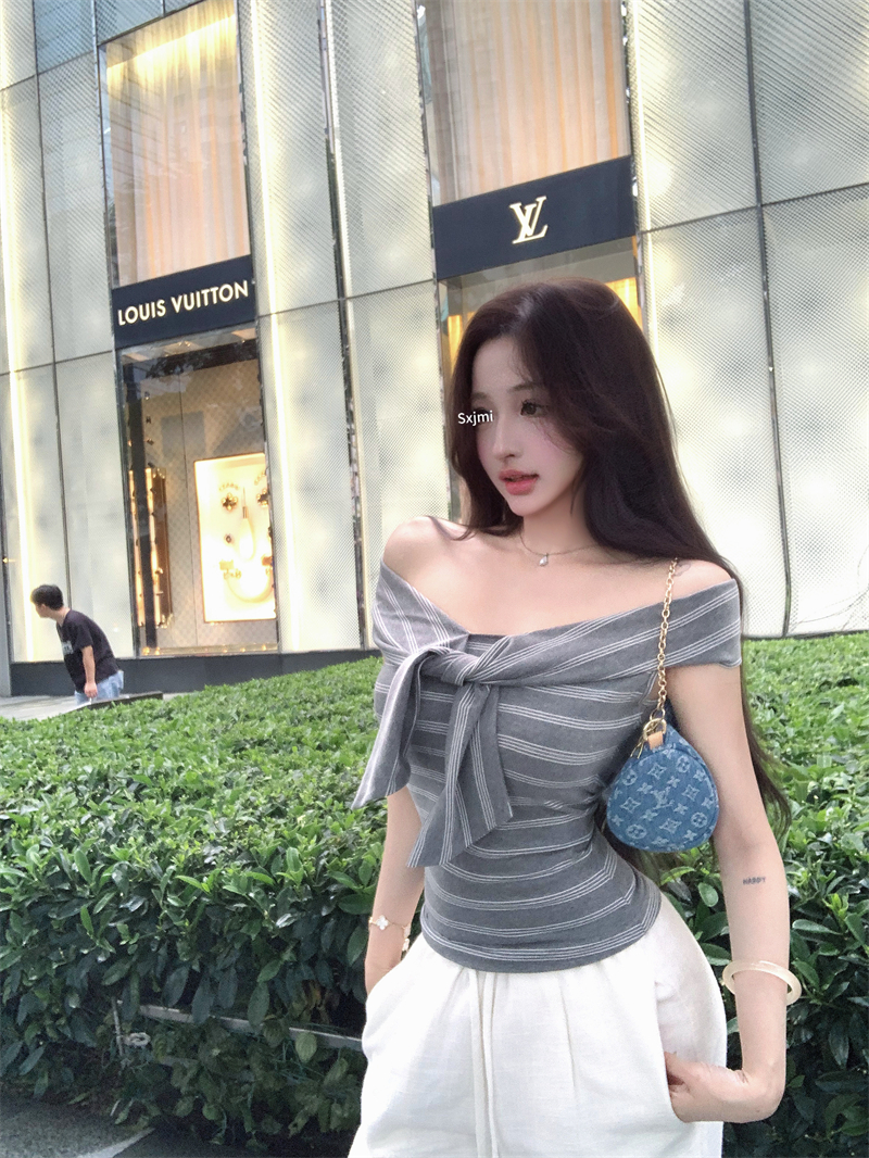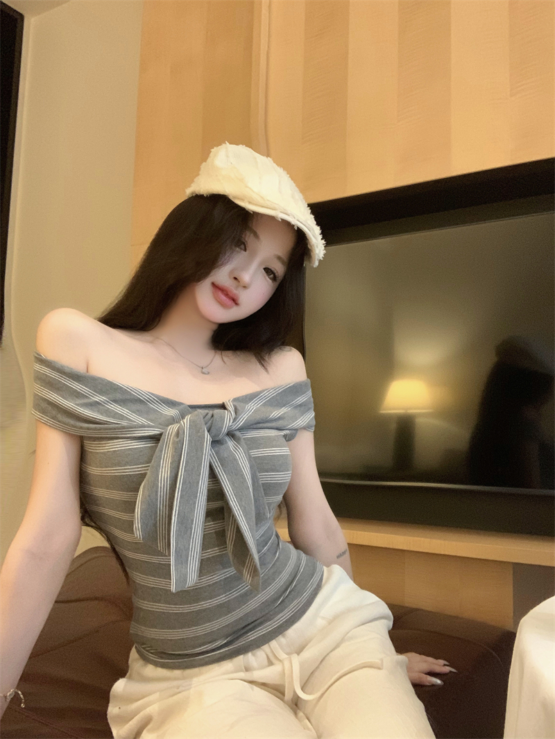 실사 정가 비스듬한 어깨 의류 티셔츠 여성용 짧은 소매 2025 새로운 오프숄더 쇼트 스타일 디자인 센스 순수한 욕망 핫걸 슬림해 보이는