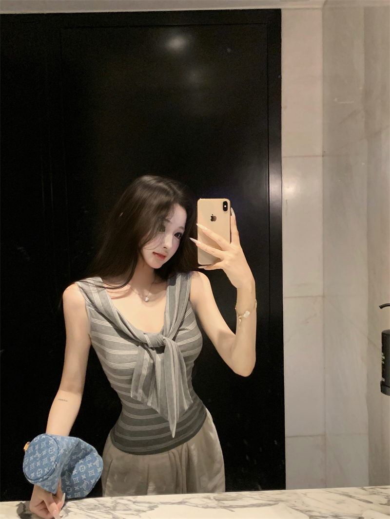 프랑스식 사소한 슈퍼 잘 생긴 고유 한 아름다운 파란색 셔츠 나비 매듭 맨위 민소매 조끼 여성 여름 외출용 상쾌