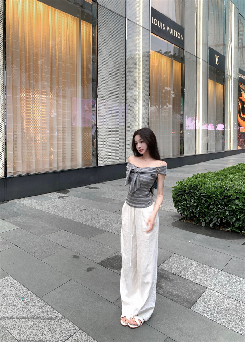 실사 정가 디자인 비틀림 오프숄더 스트라이프 몸매 가꾸기 티셔츠 여성 민소매 조끼 맨위 반팔