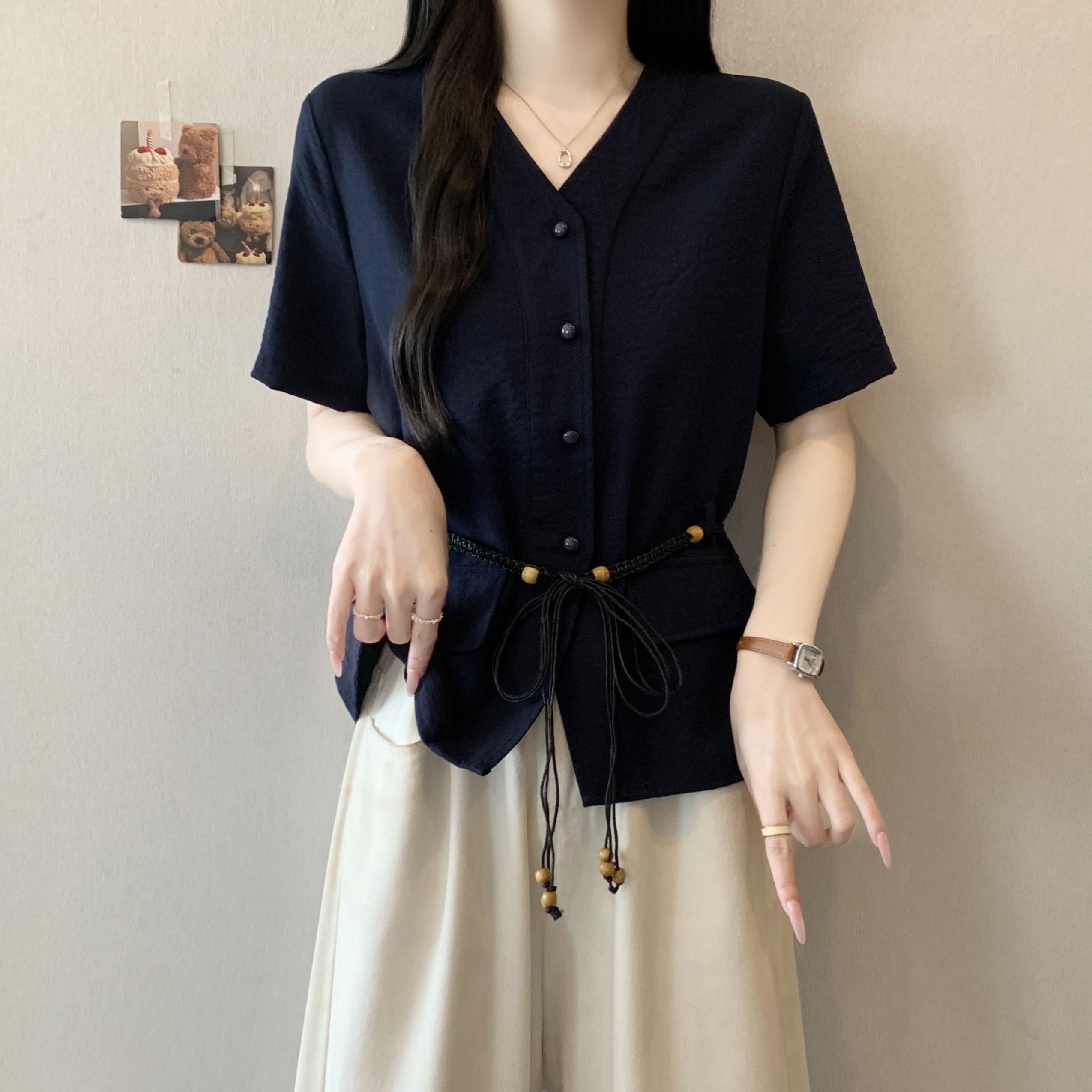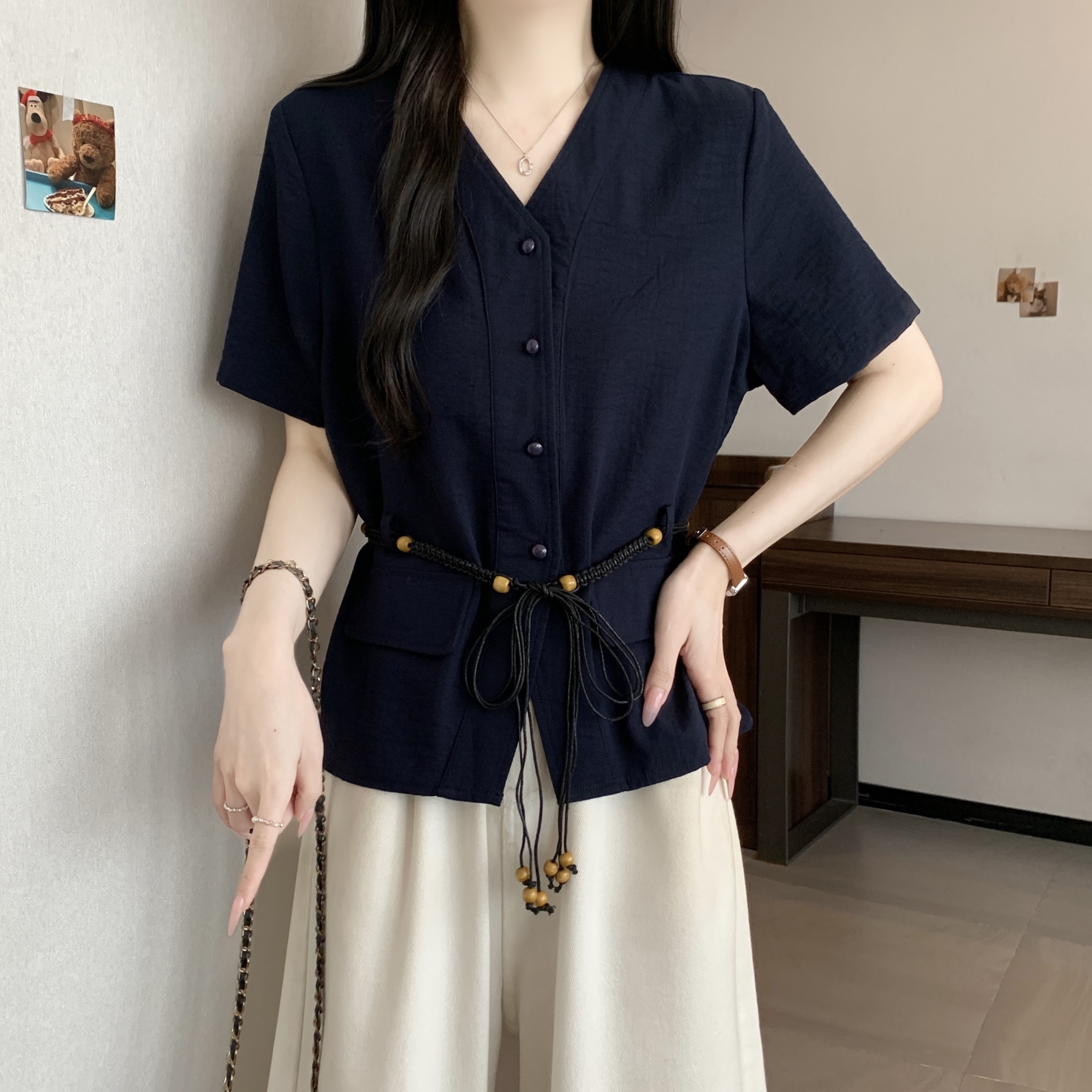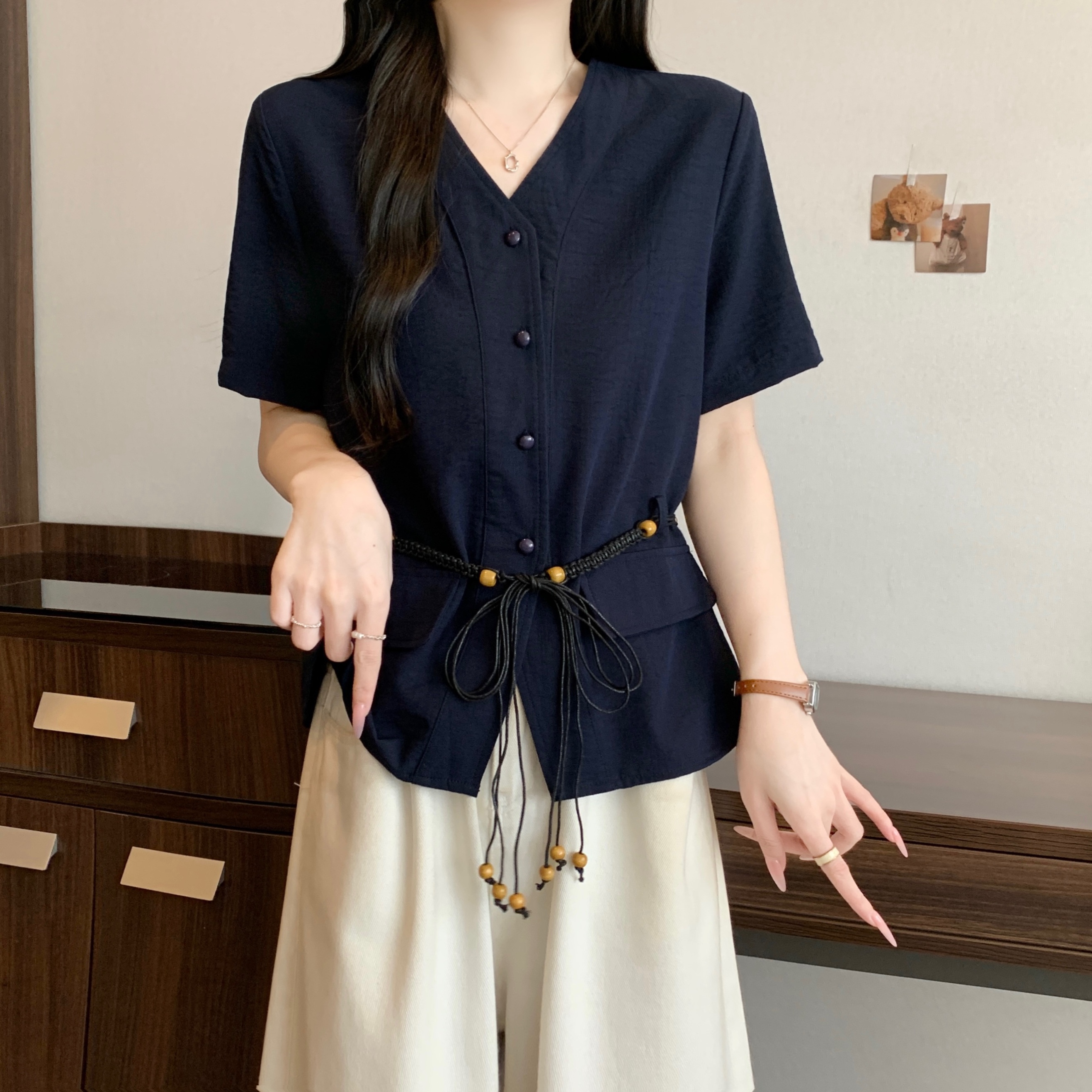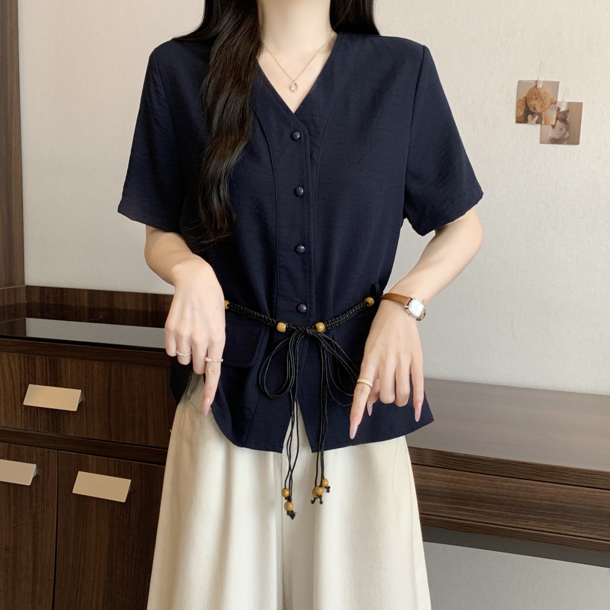 빅 사이즈 지방 mm 여름 새로운 품격 V넥 루즈핏 슬림해 보이는 셔츠 여성용 짧은 소매 허리 수축 부서 벨트 맨위