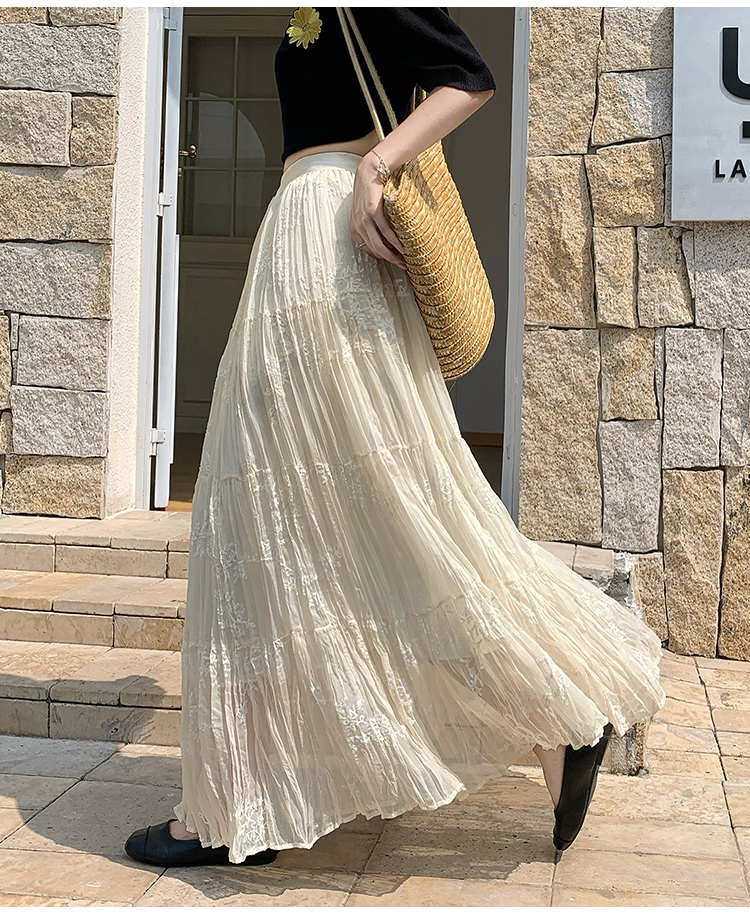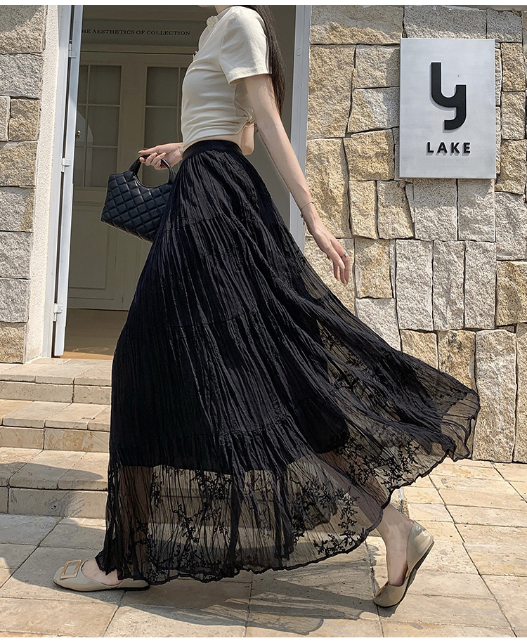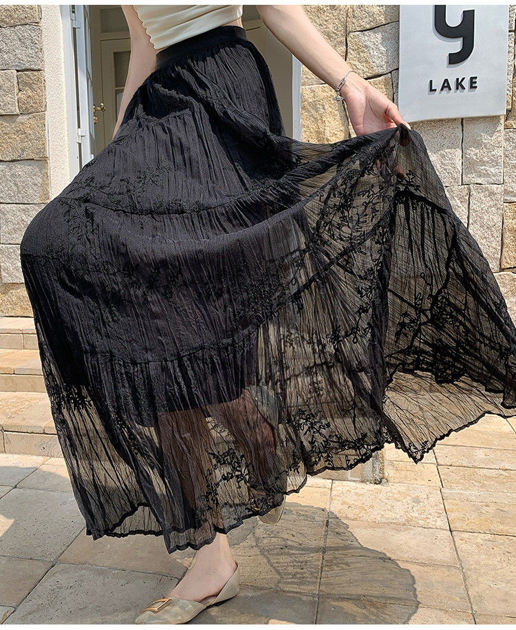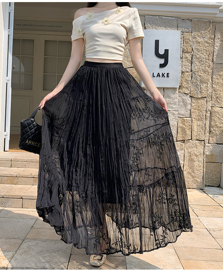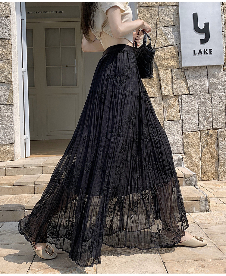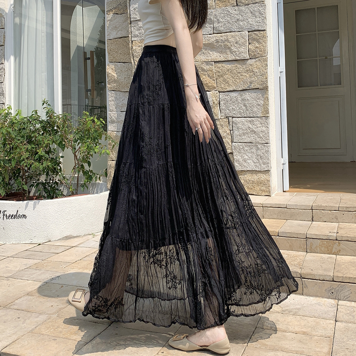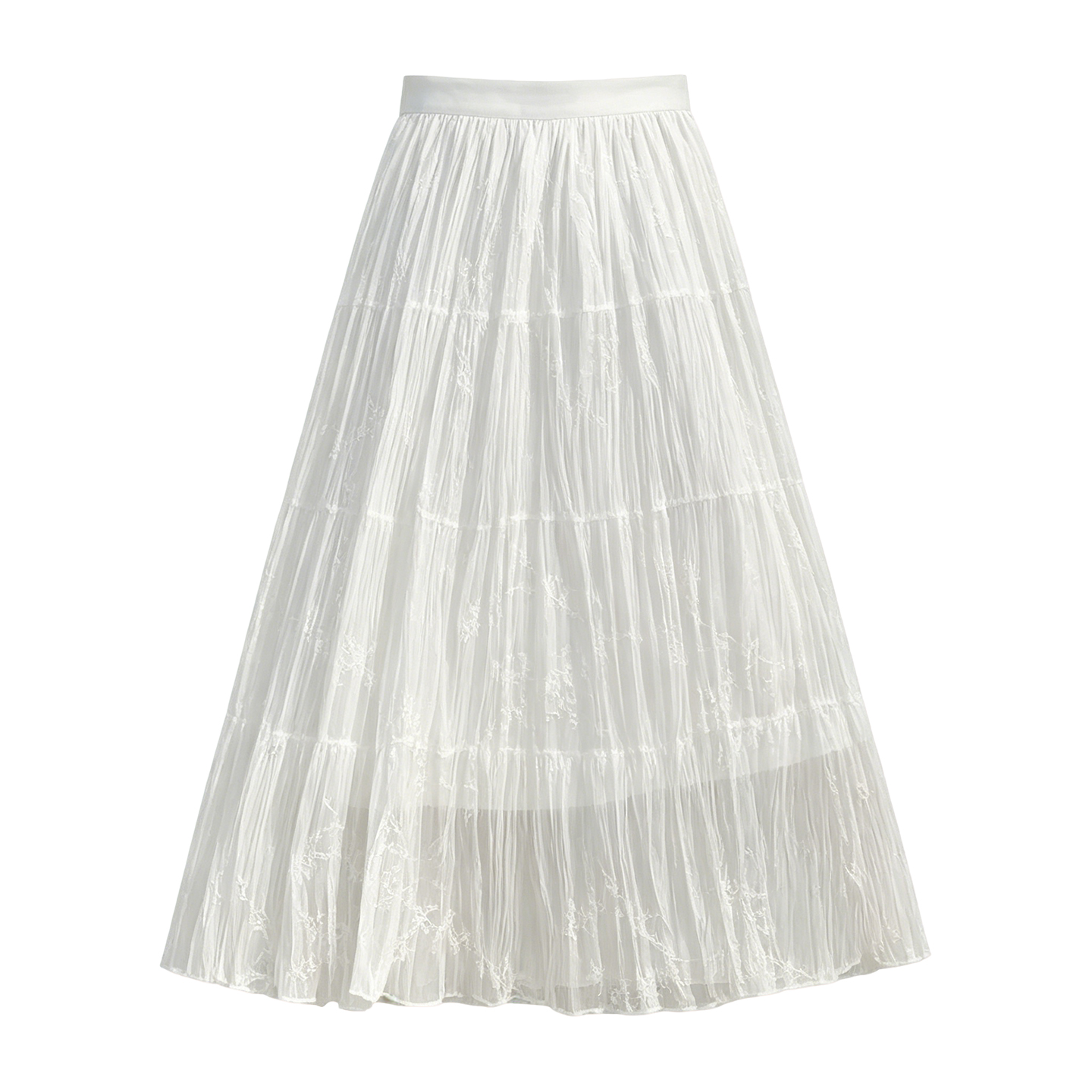 실사 레이스 자수 반신 스커트 여성 2026 여름 하이웨이스트 플리츠 한 마디 중간 길이 스커트 케이크 드레스 빅 플레어 스커트