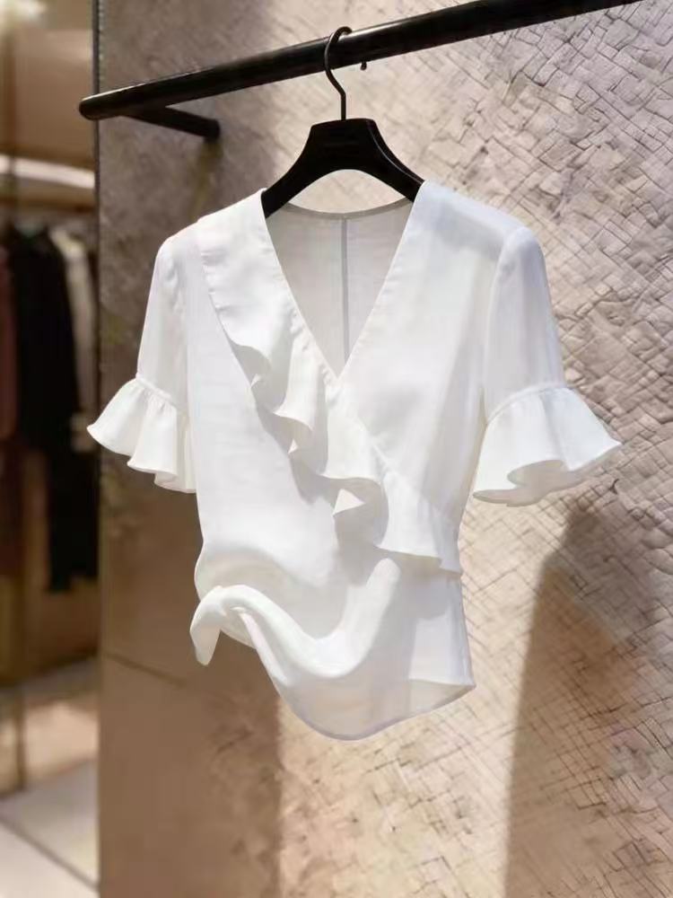 화이트 V넥 프릴 시폰 셔츠 여성 여름 새로운 부드러운 바람 다용도 반팔 연령 감소 허리 수축 슬림해 보이는 맨위