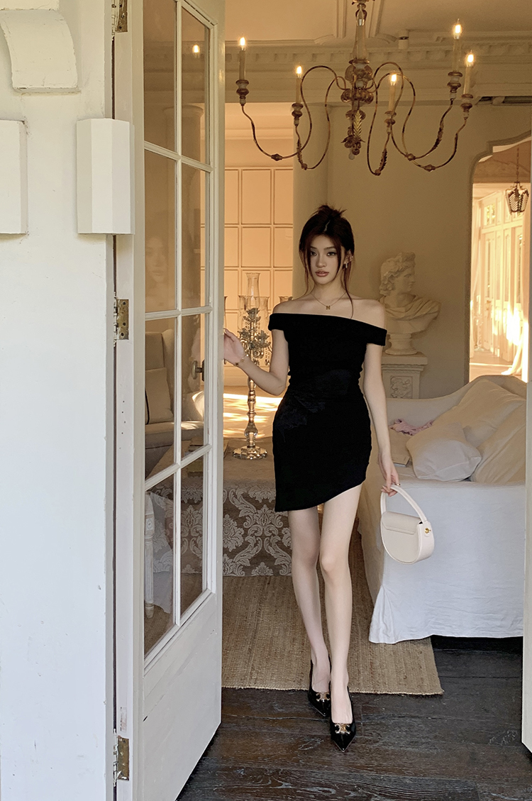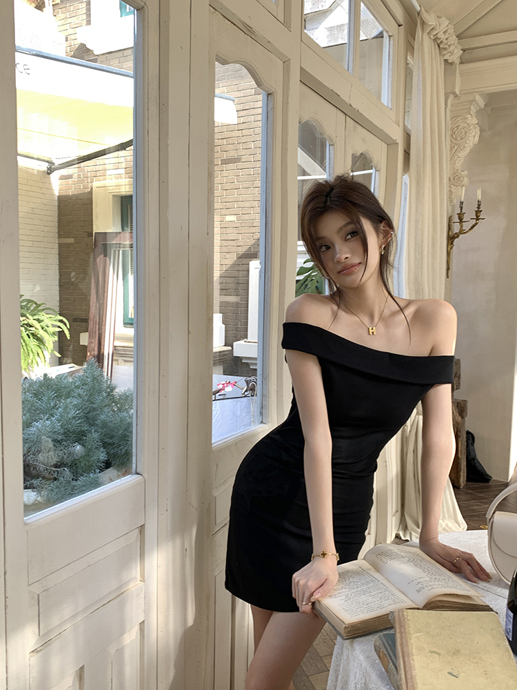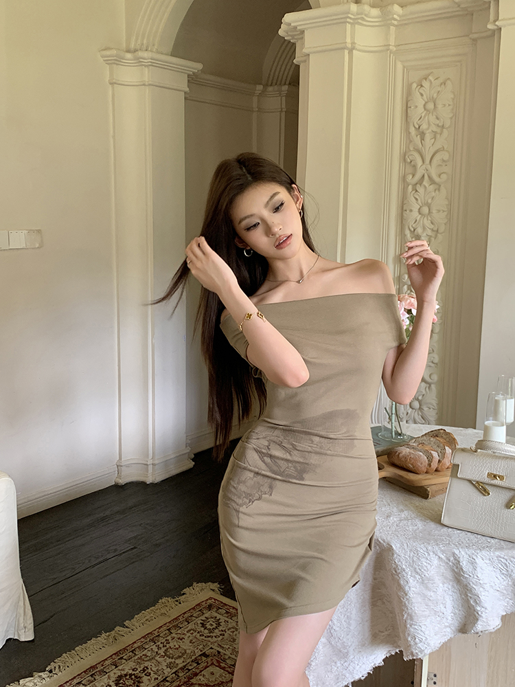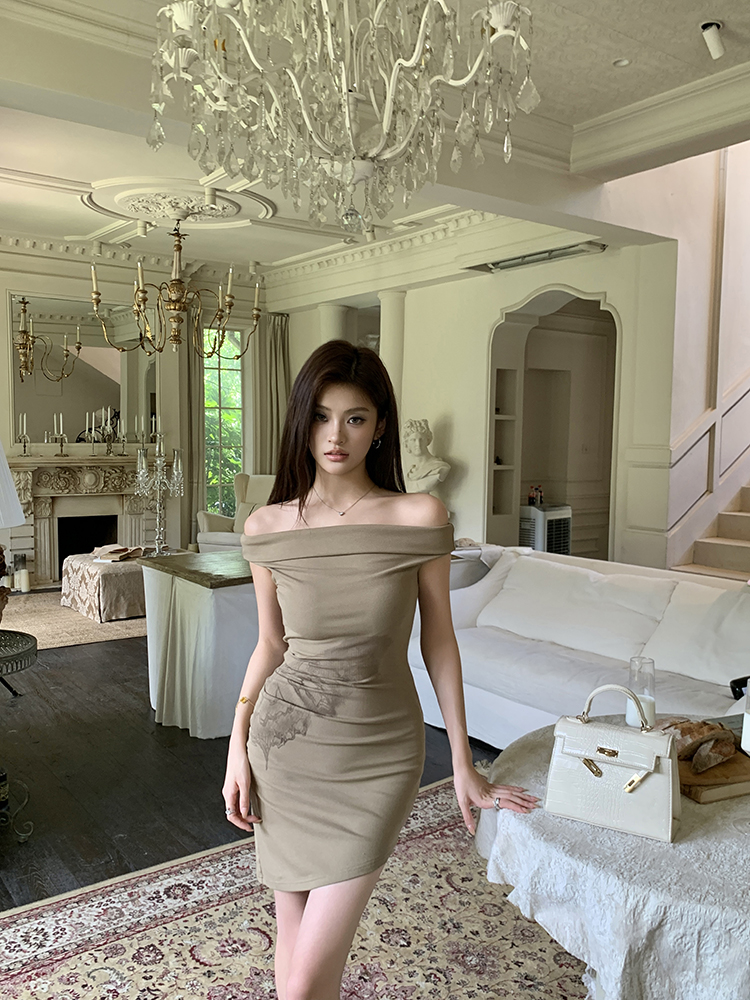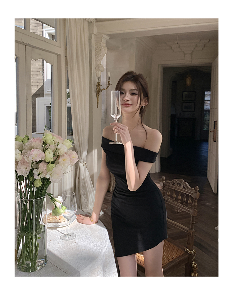 실사 2026 봄 여름 새로운 품격 비스듬한 어깨 백리스 여성 드레스 신축성 주름 몸매 가꾸기 섹시함 타이트 스커트 미니 스커트