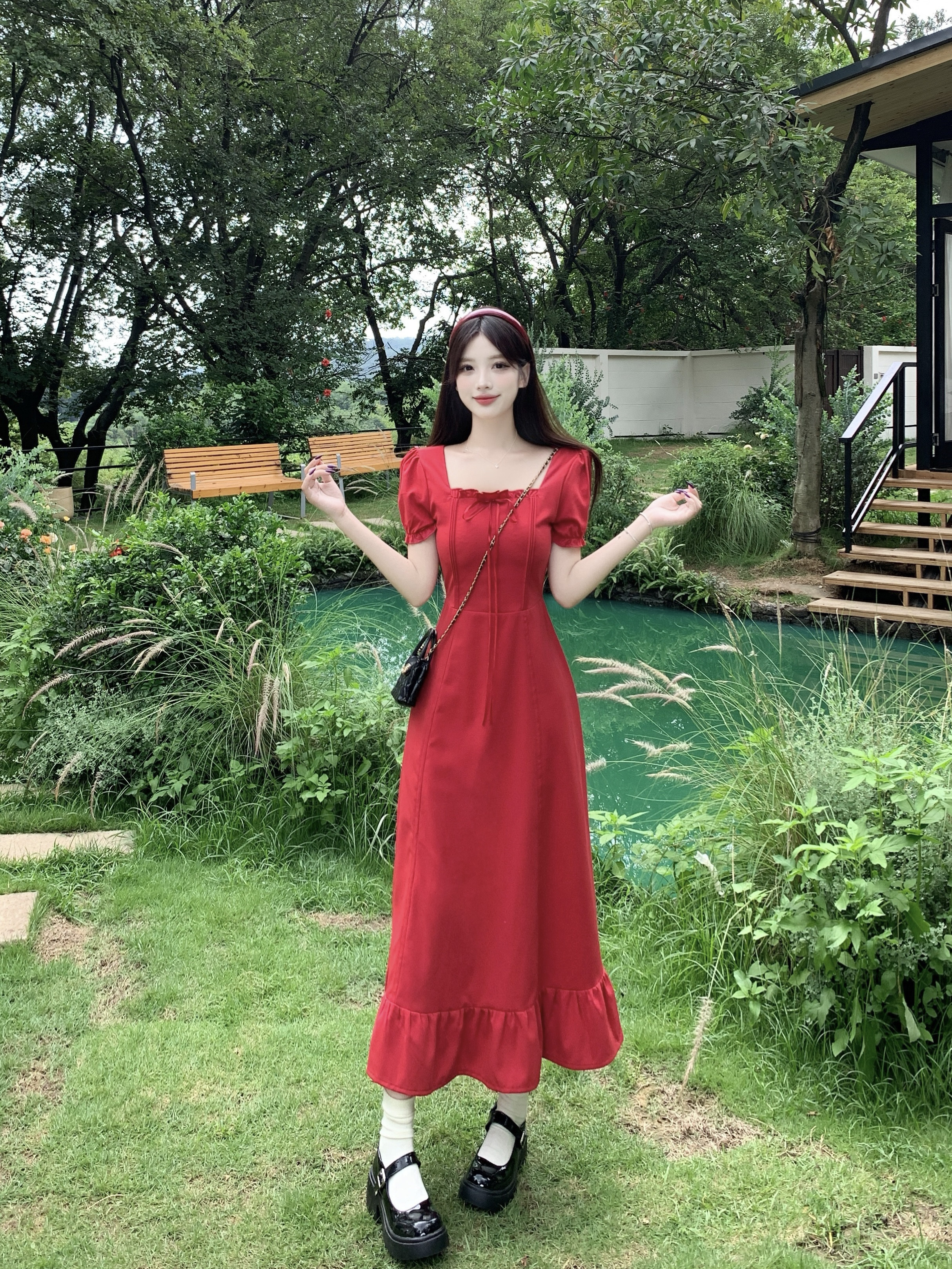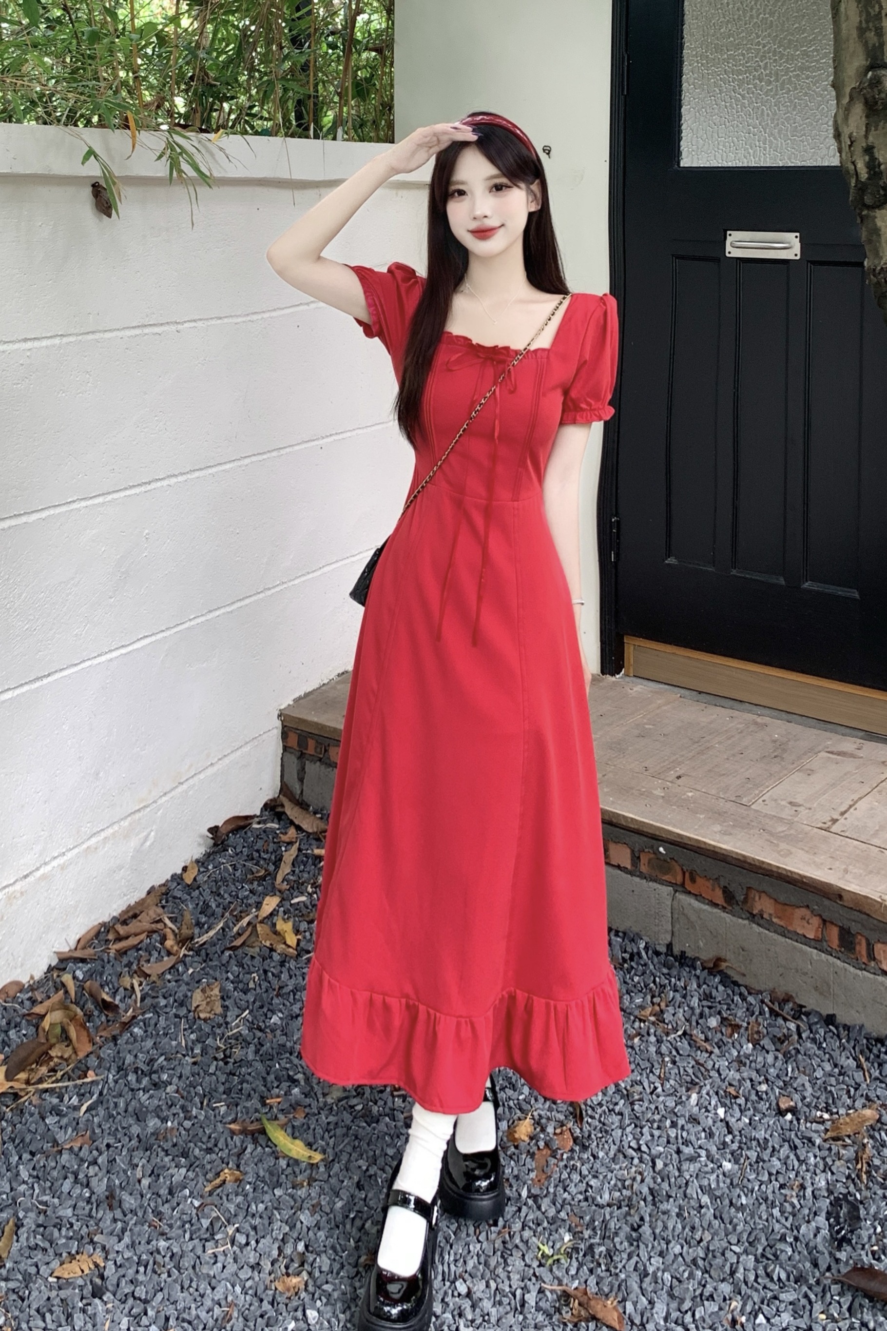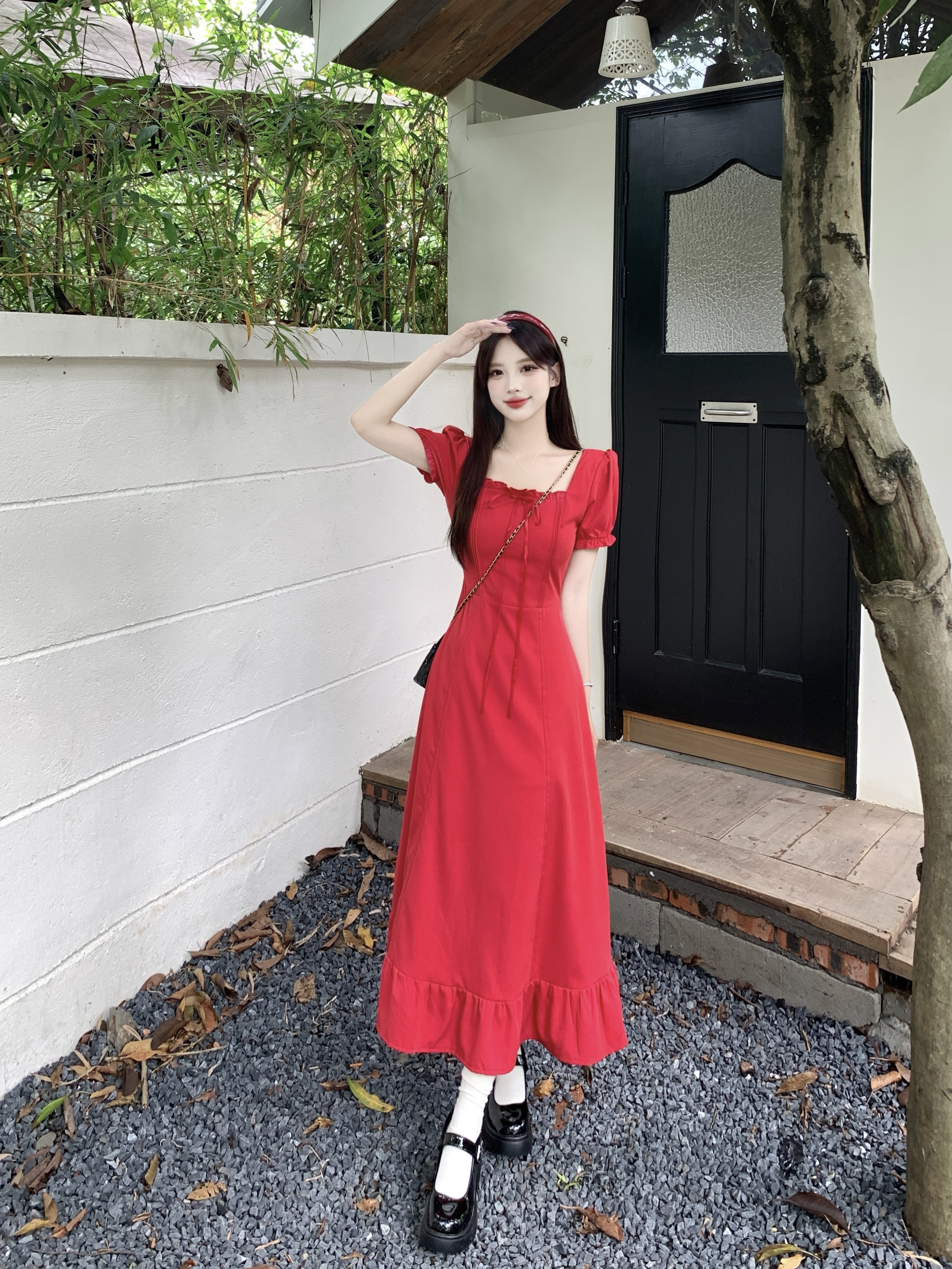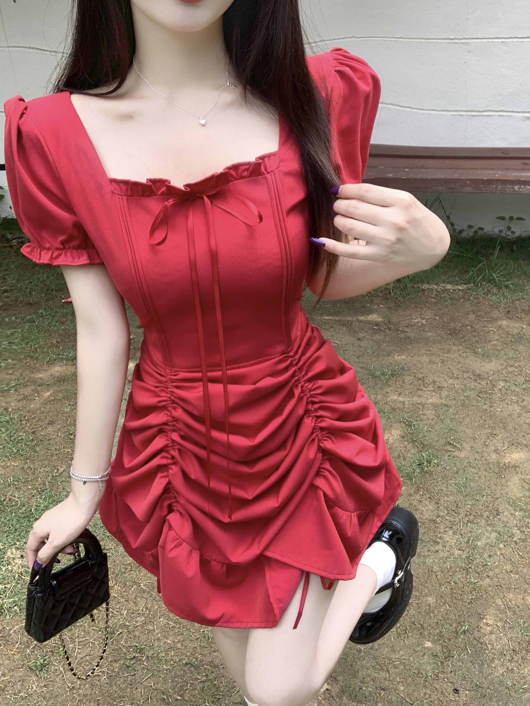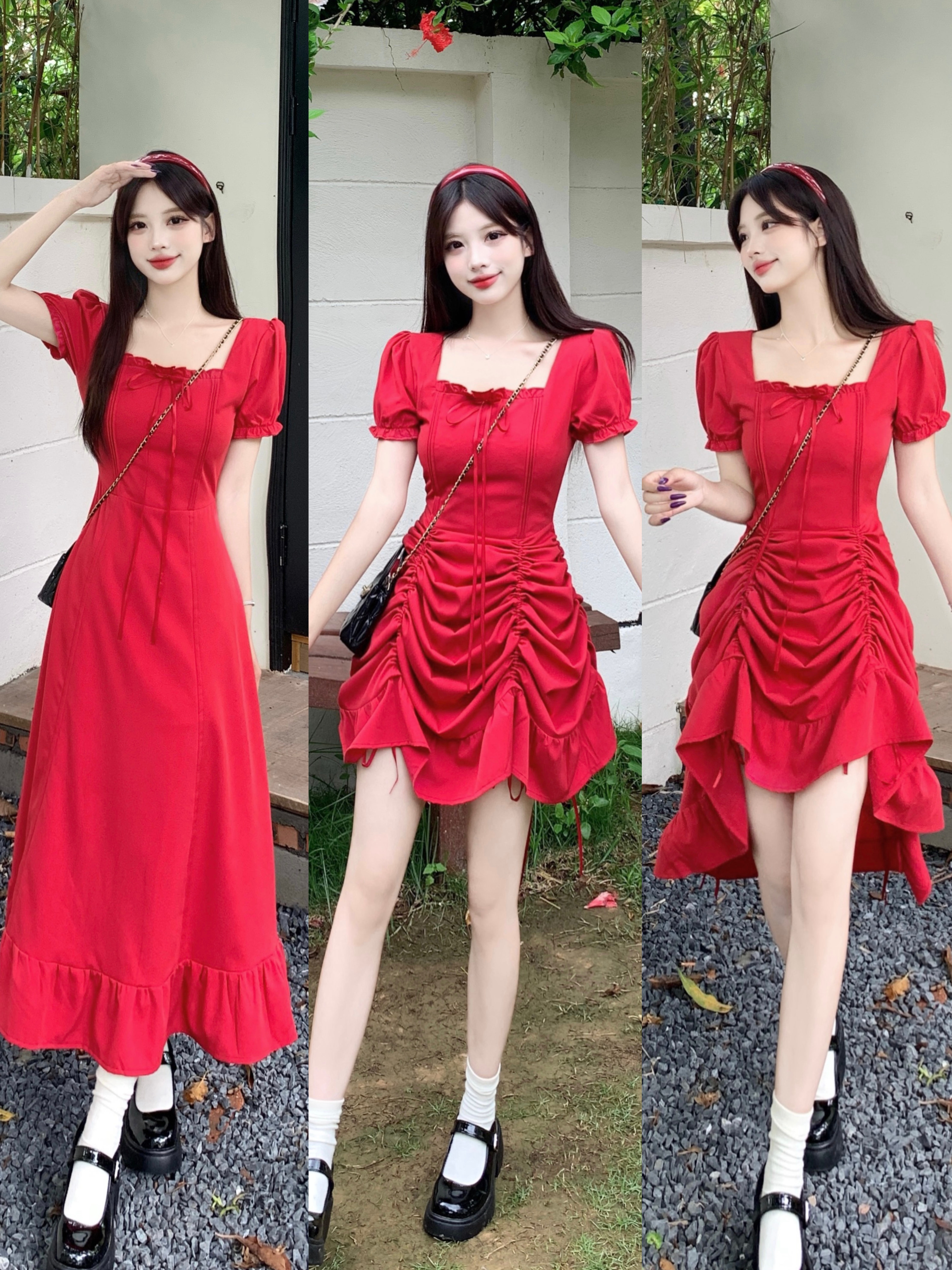 빅 사이즈 여성 의류 프랑스식 차 휴식 바람 빨간색 광장 칼라 단색 롱 스커트 가스 질감 허리 수축 쇼트 스타일 슬림해 보이는 여성 드레스