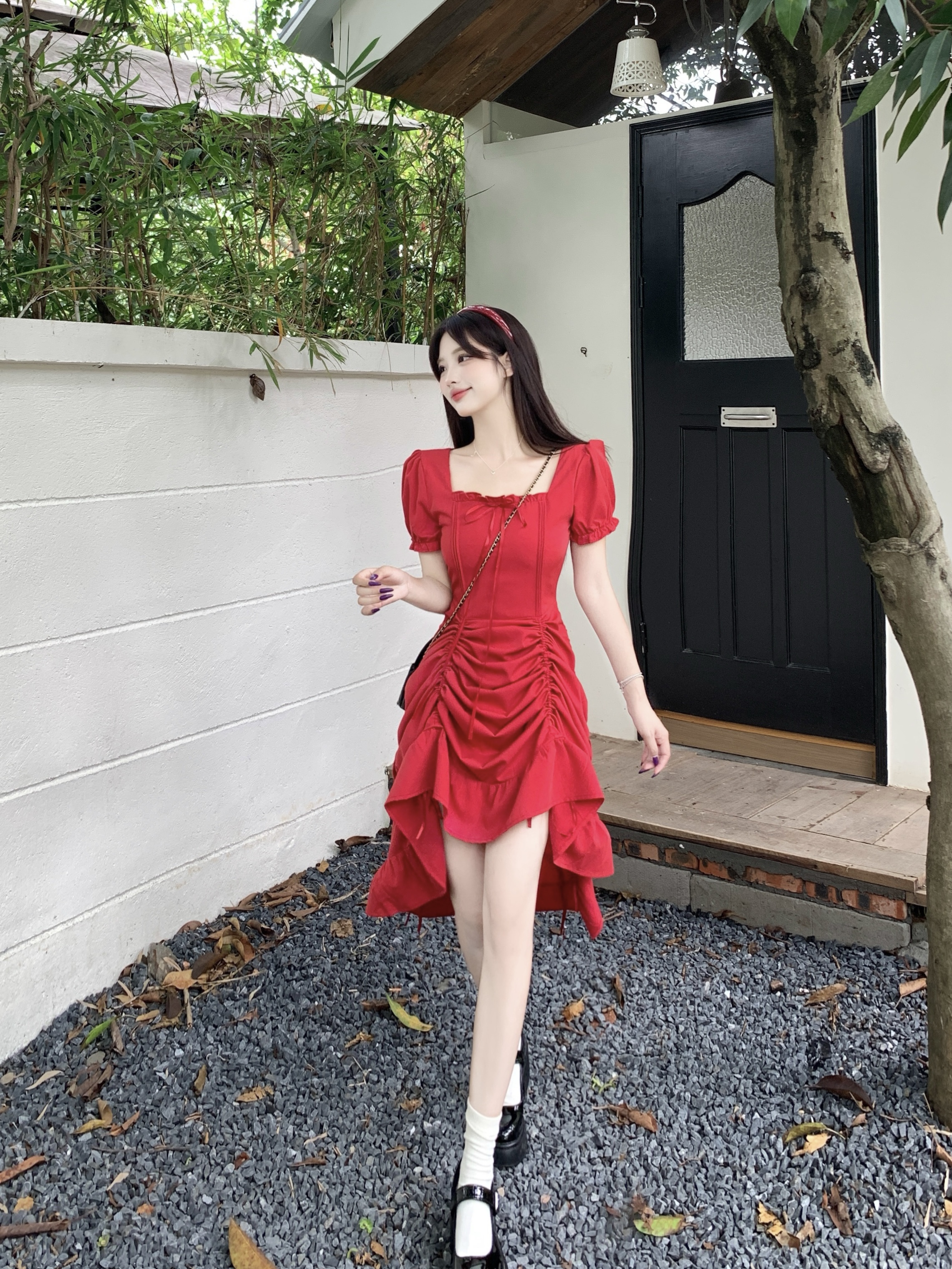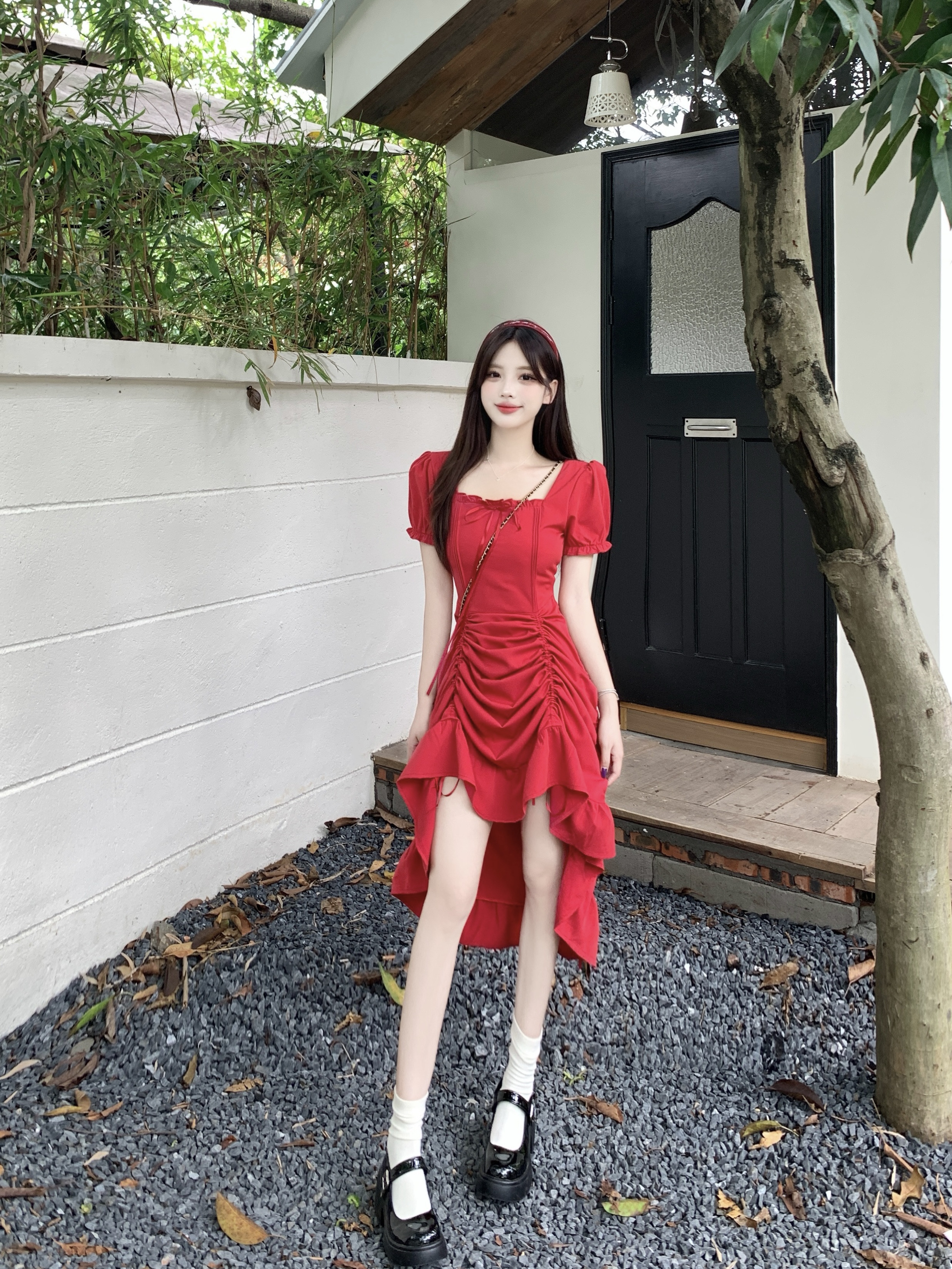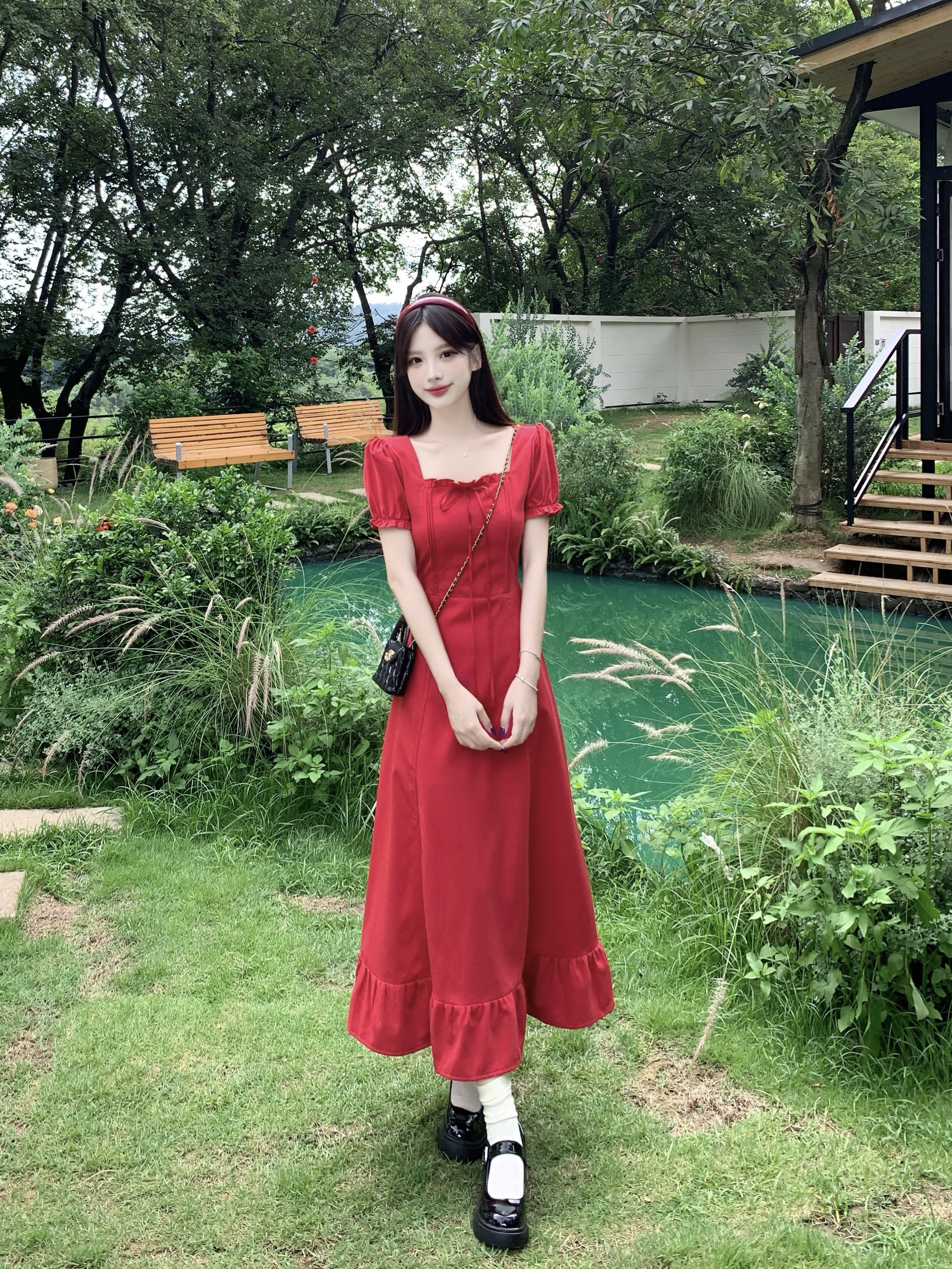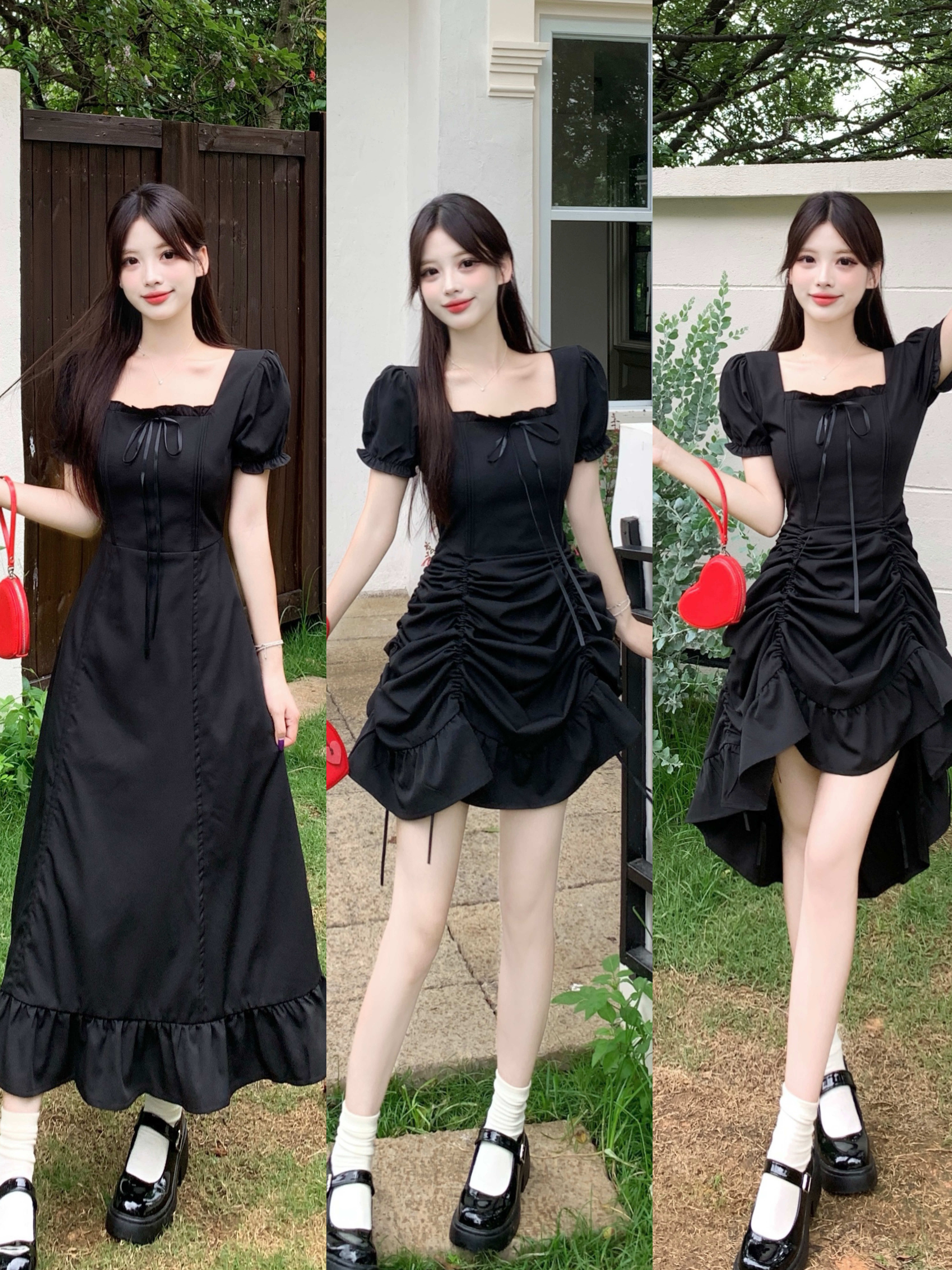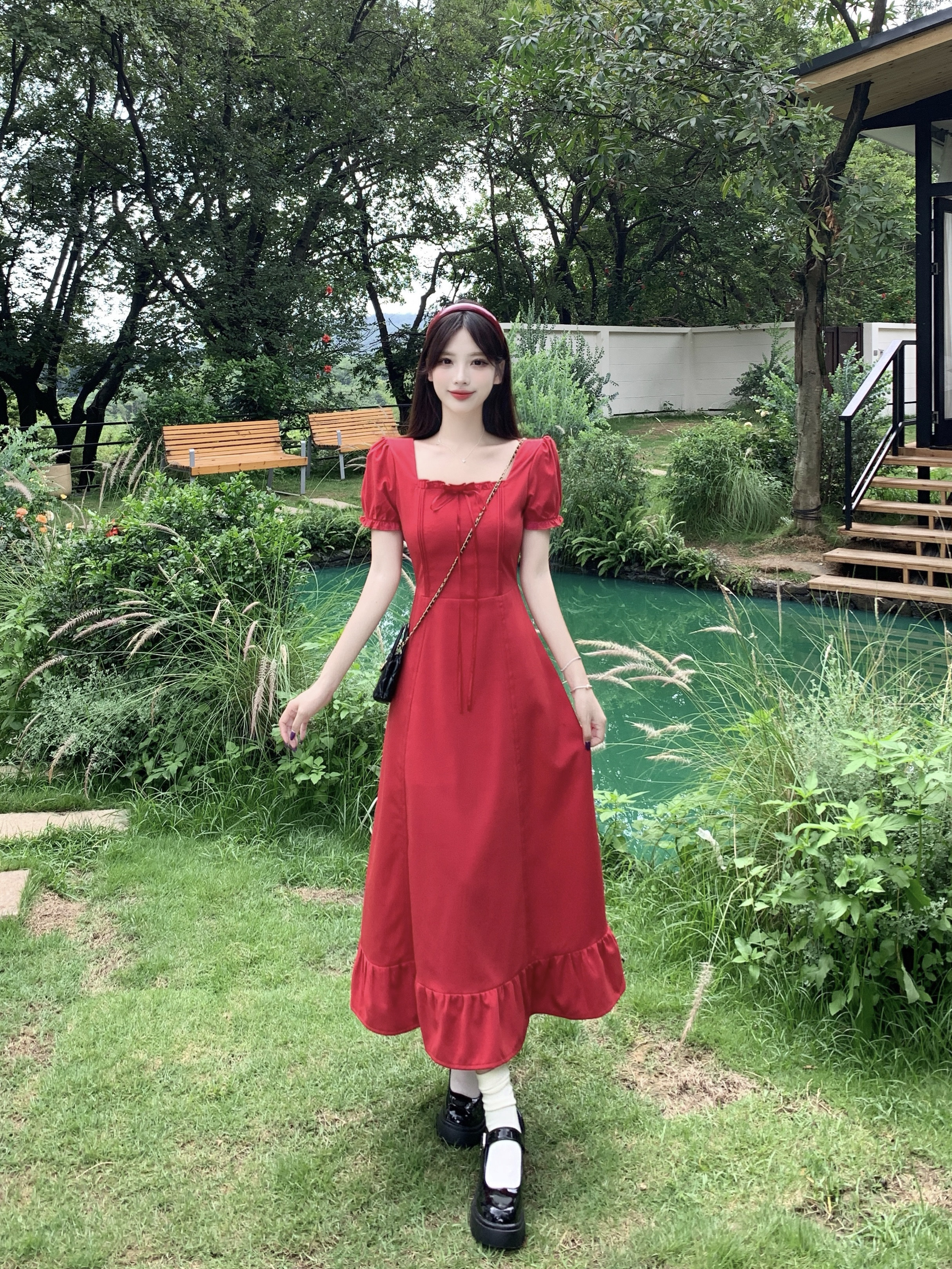 빅 사이즈 여성 의류 프랑스식 차 휴식 바람 빨간색 광장 칼라 단색 롱 스커트 가스 질감 허리 수축 쇼트 스타일 슬림해 보이는 여성 드레스