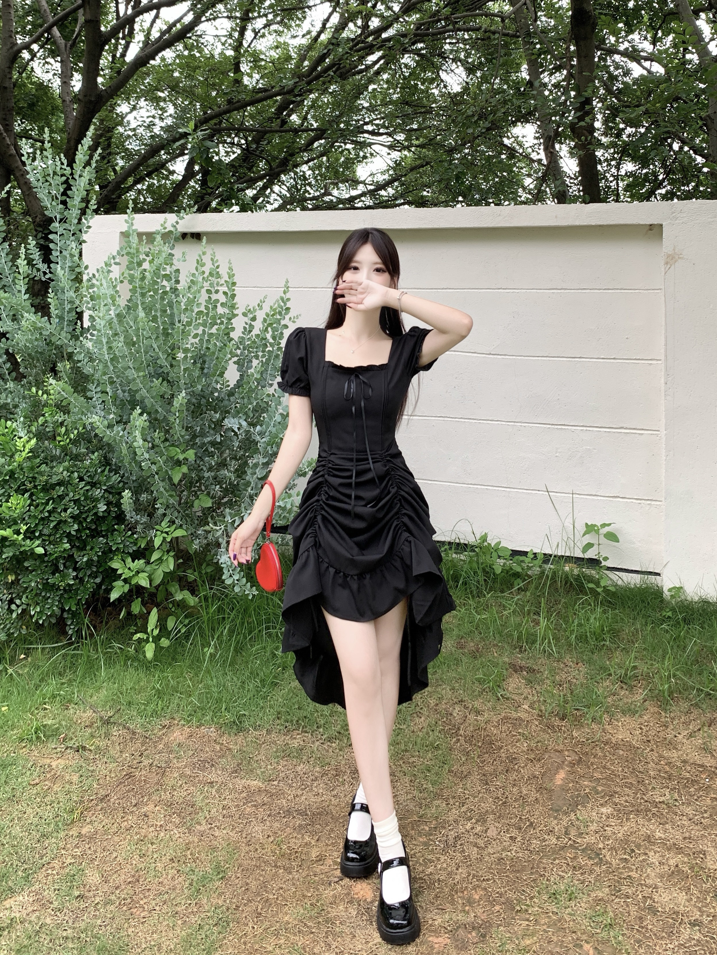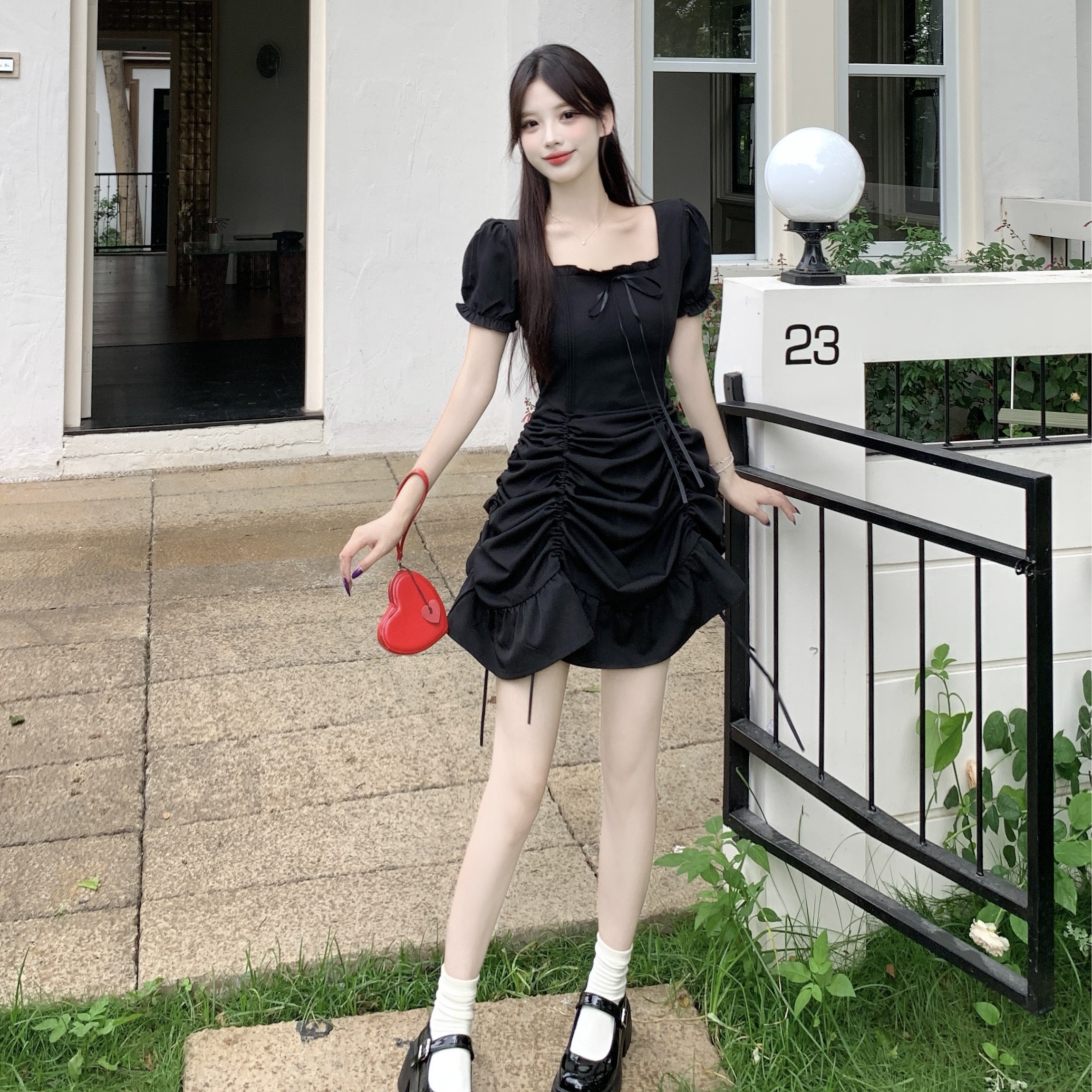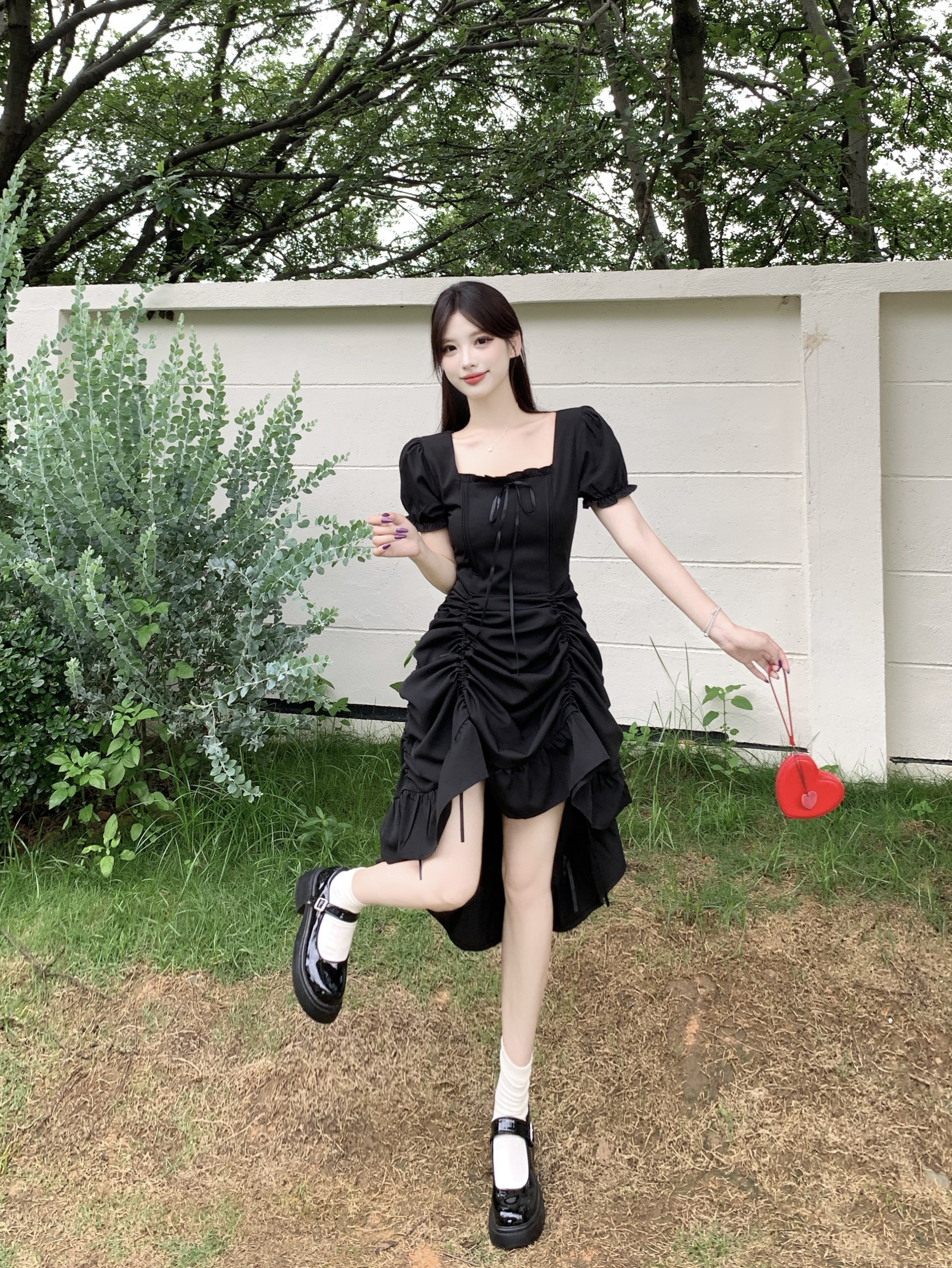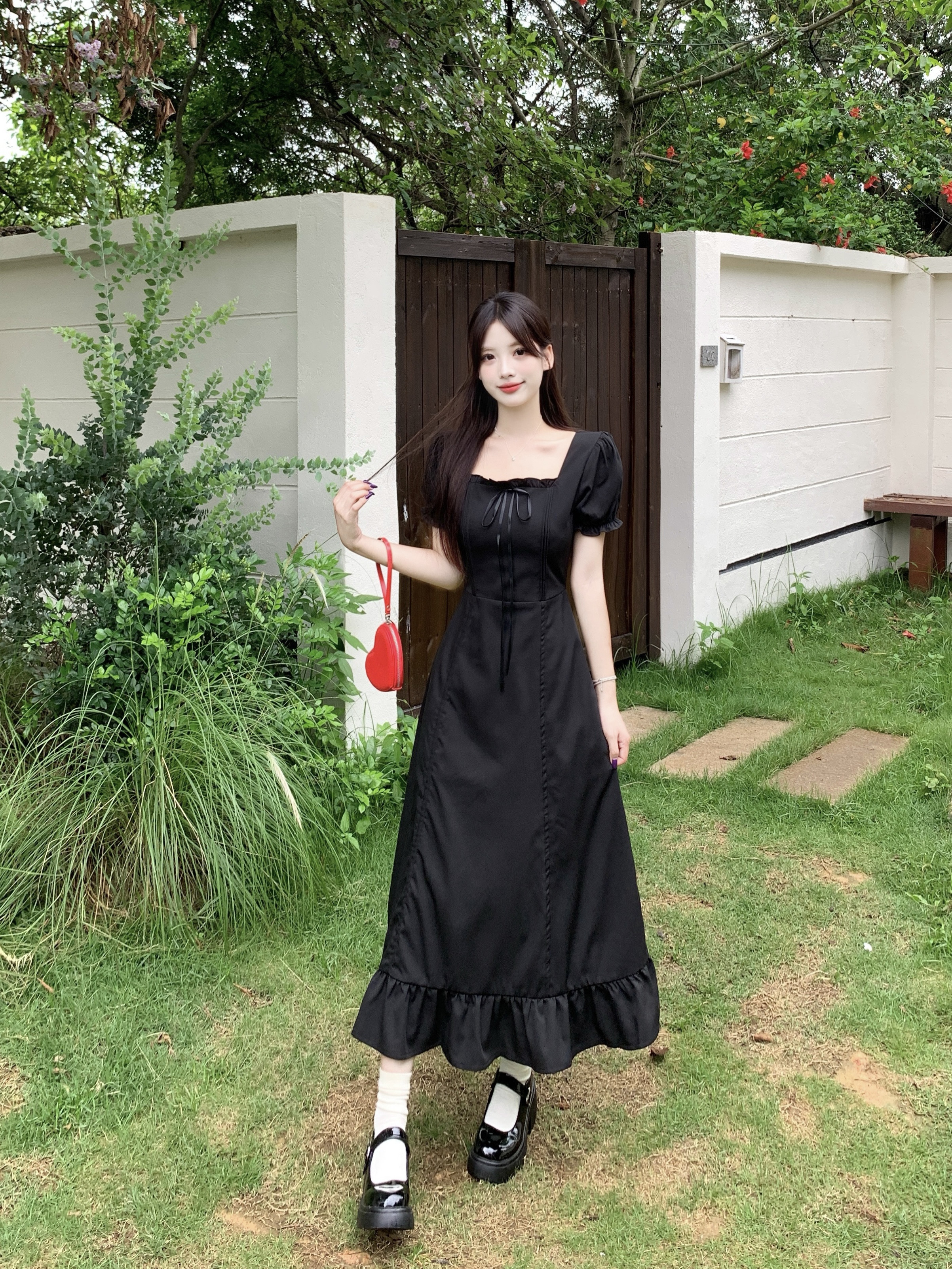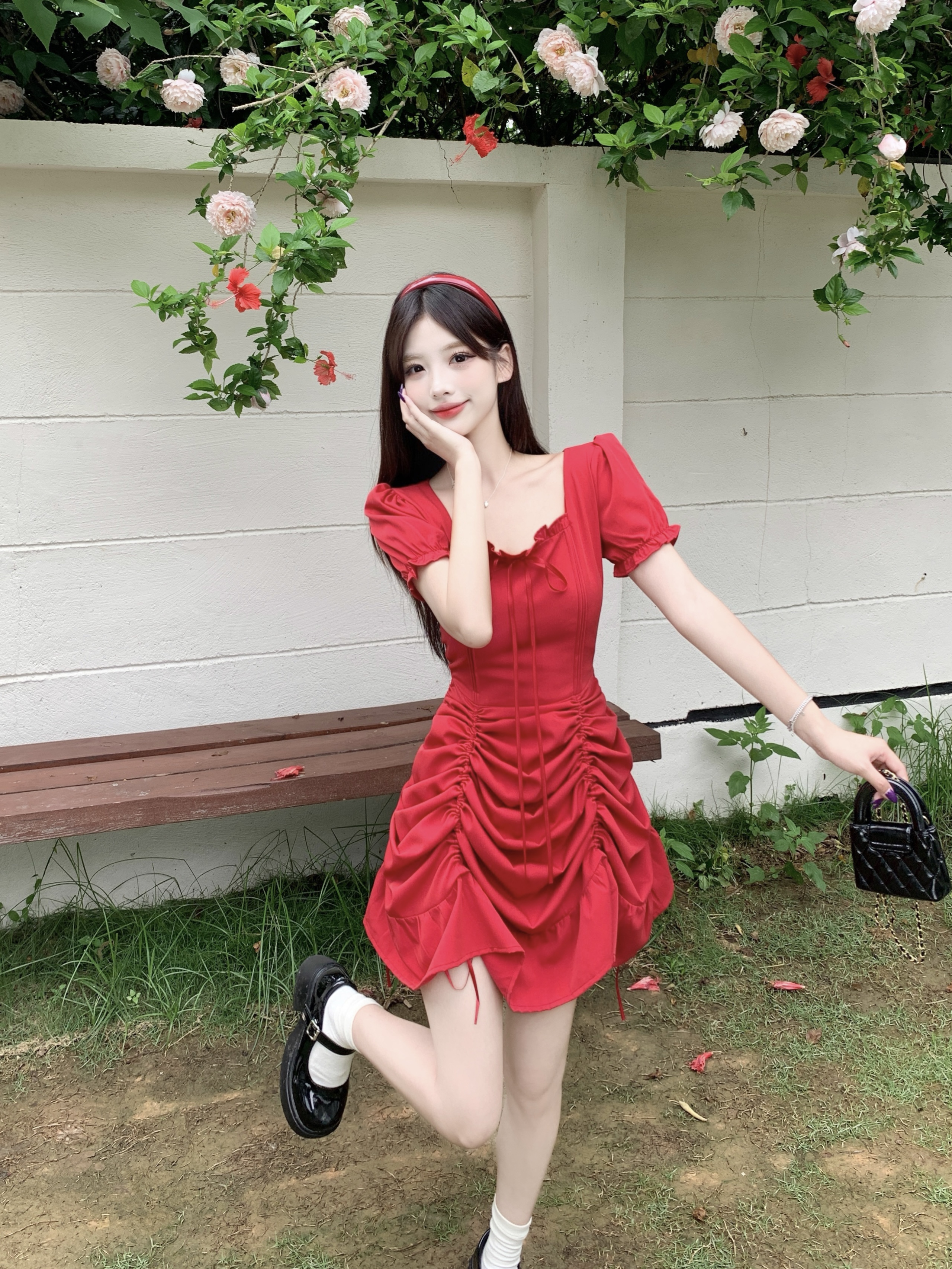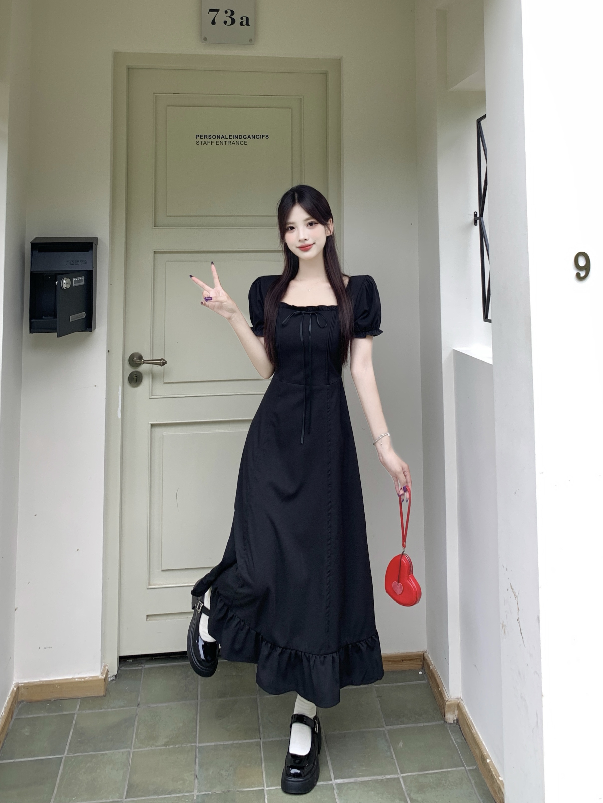 빅 사이즈 여성 의류 프랑스식 차 휴식 바람 빨간색 광장 칼라 단색 롱 스커트 가스 질감 허리 수축 쇼트 스타일 슬림해 보이는 여성 드레스