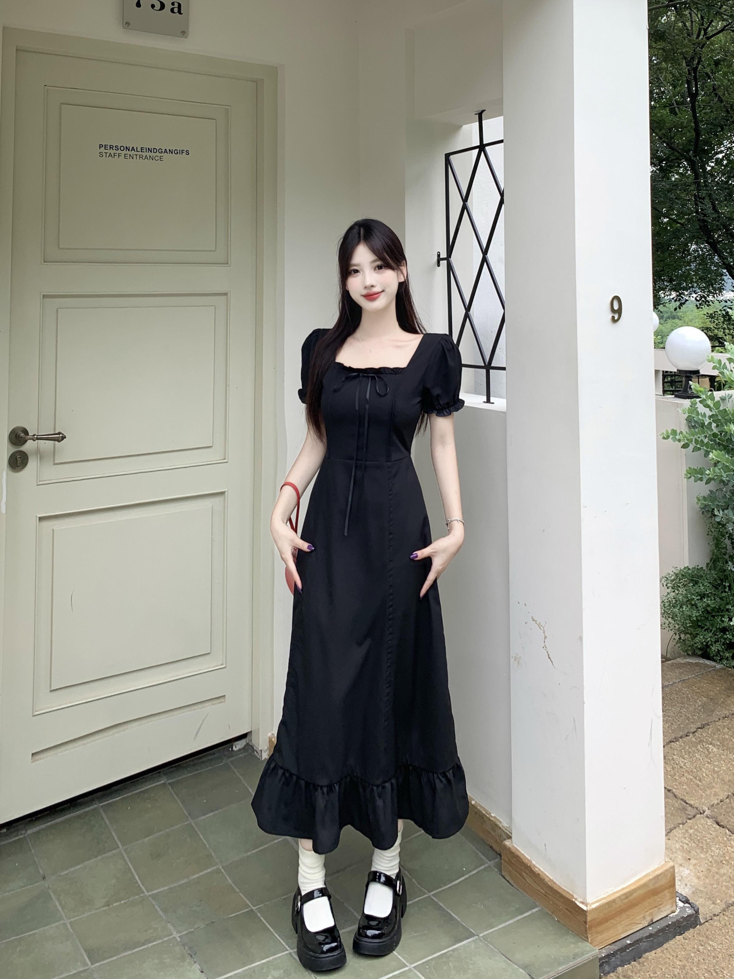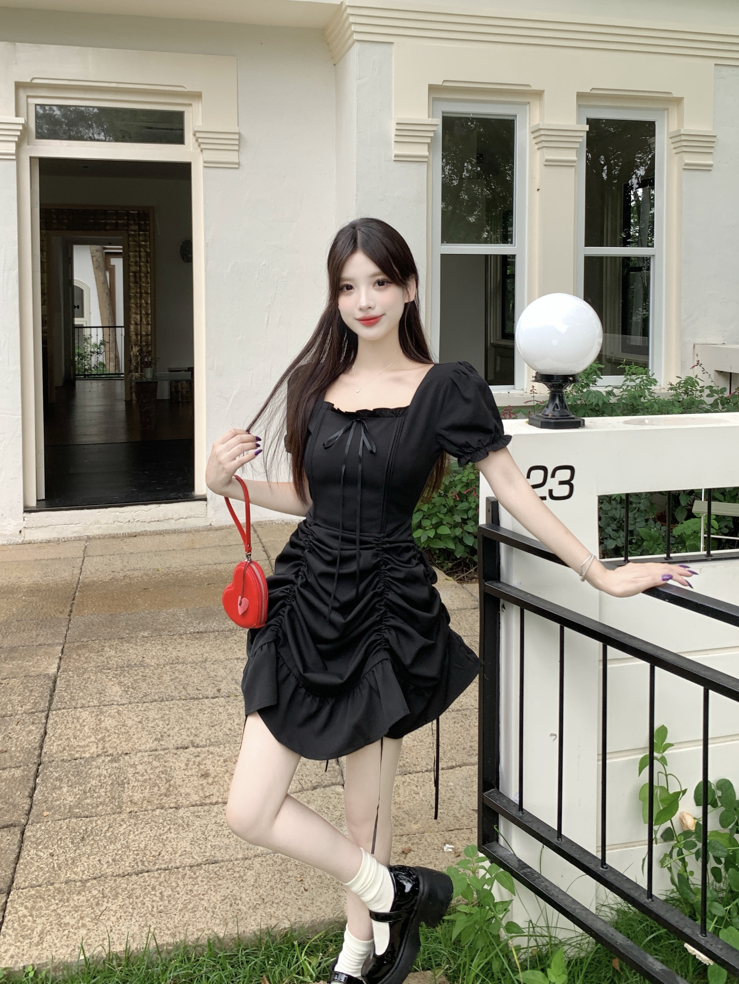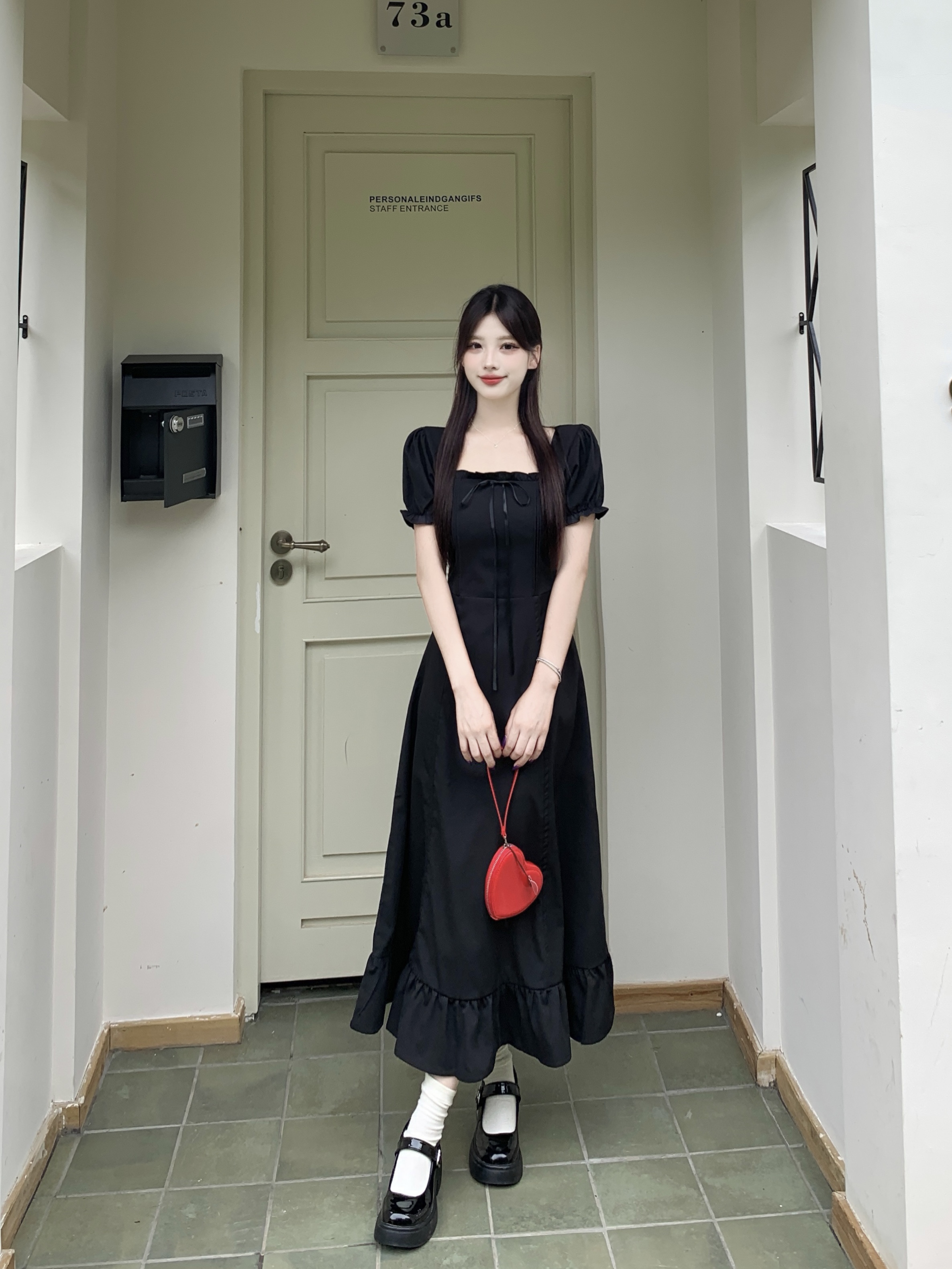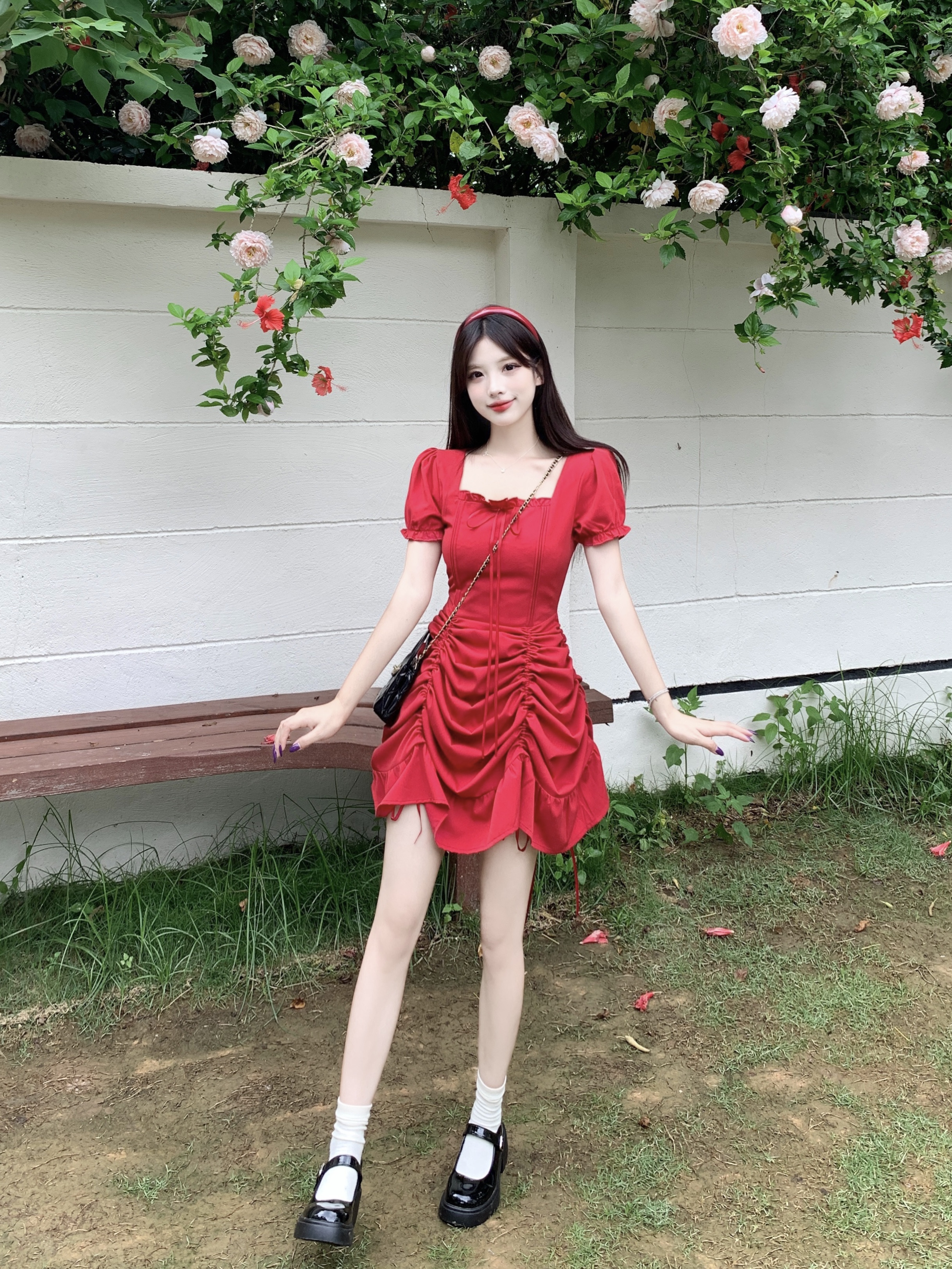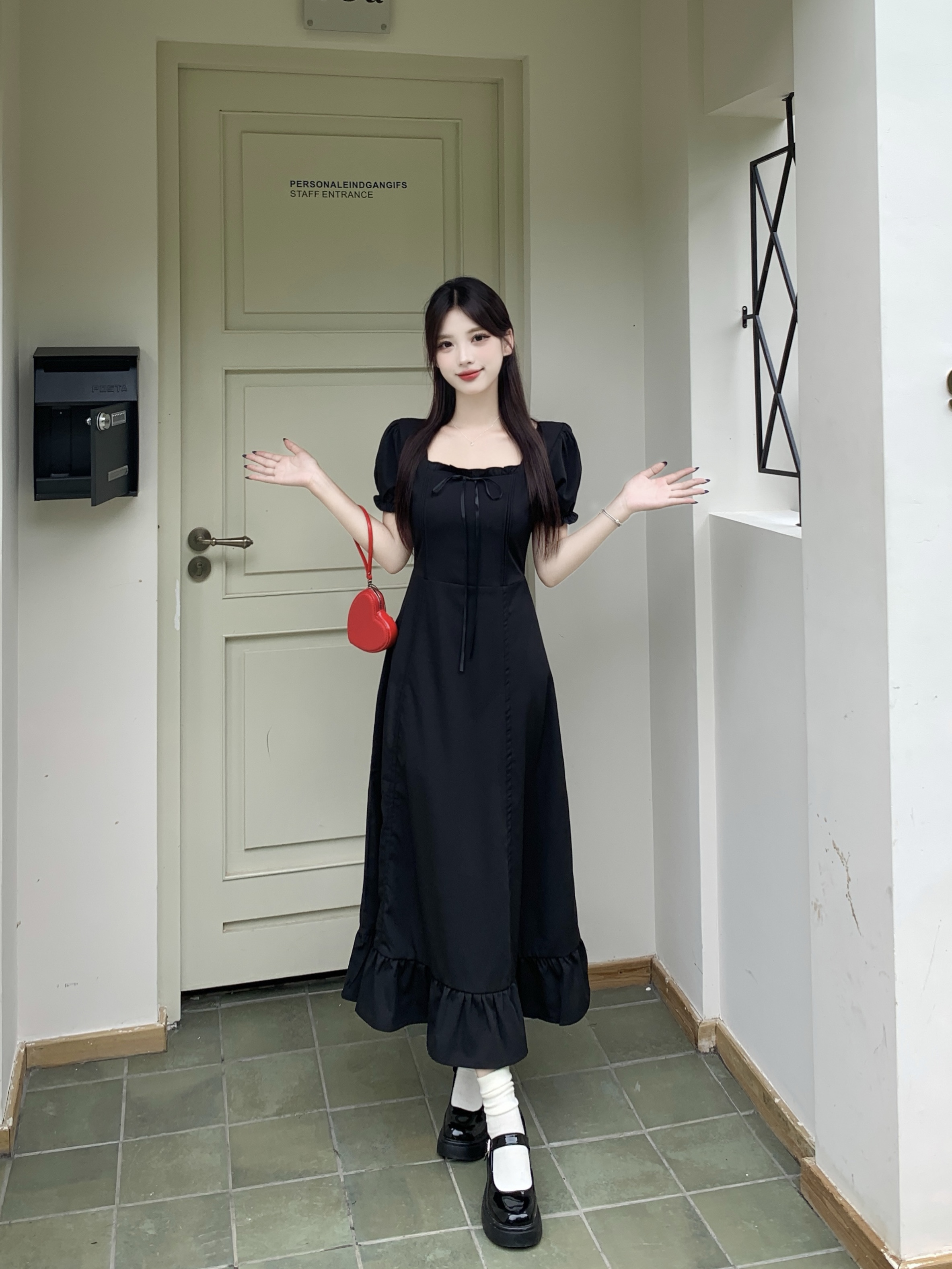 빅 사이즈 여성 의류 프랑스식 차 휴식 바람 빨간색 광장 칼라 단색 롱 스커트 가스 질감 허리 수축 쇼트 스타일 슬림해 보이는 여성 드레스