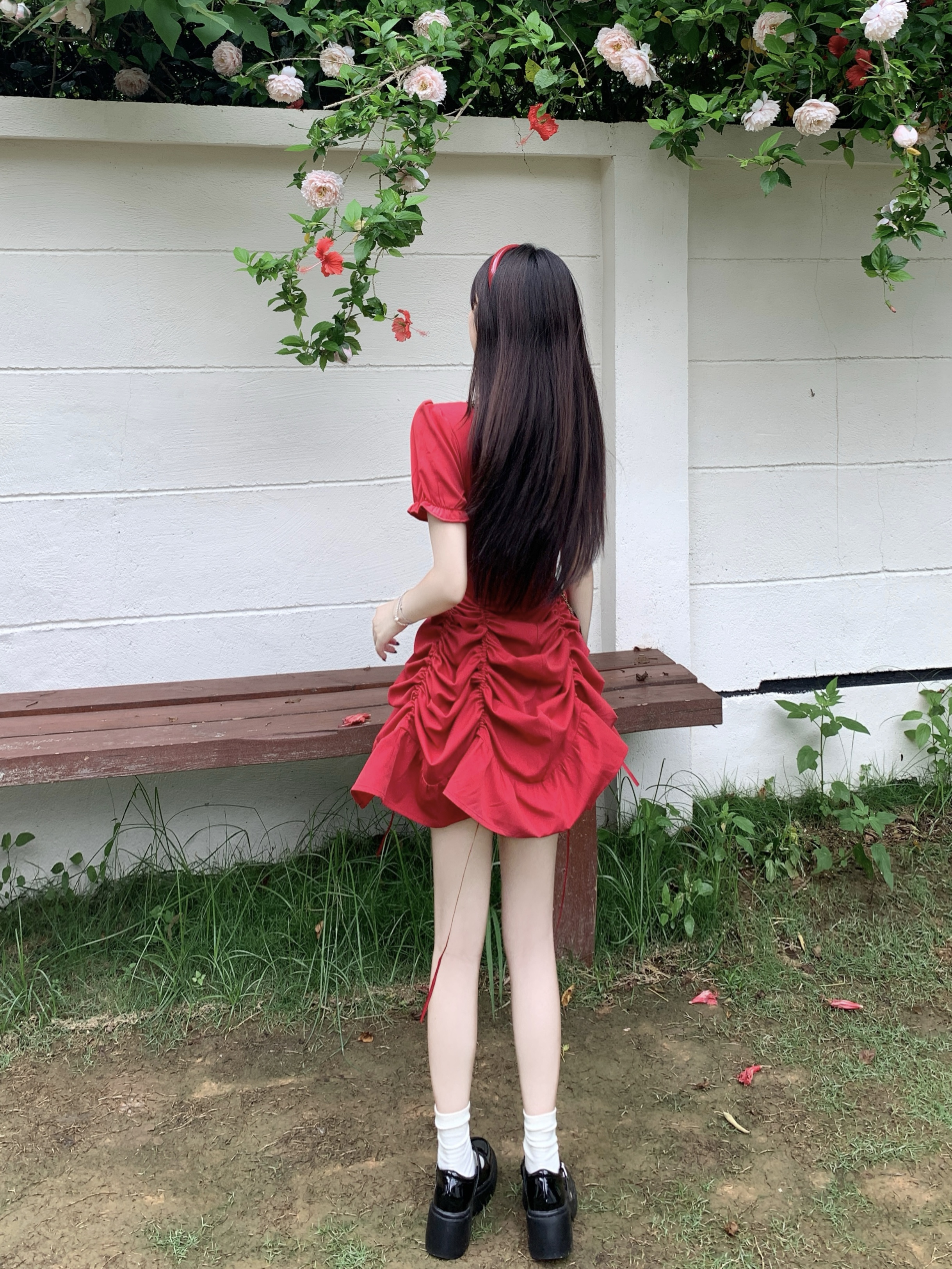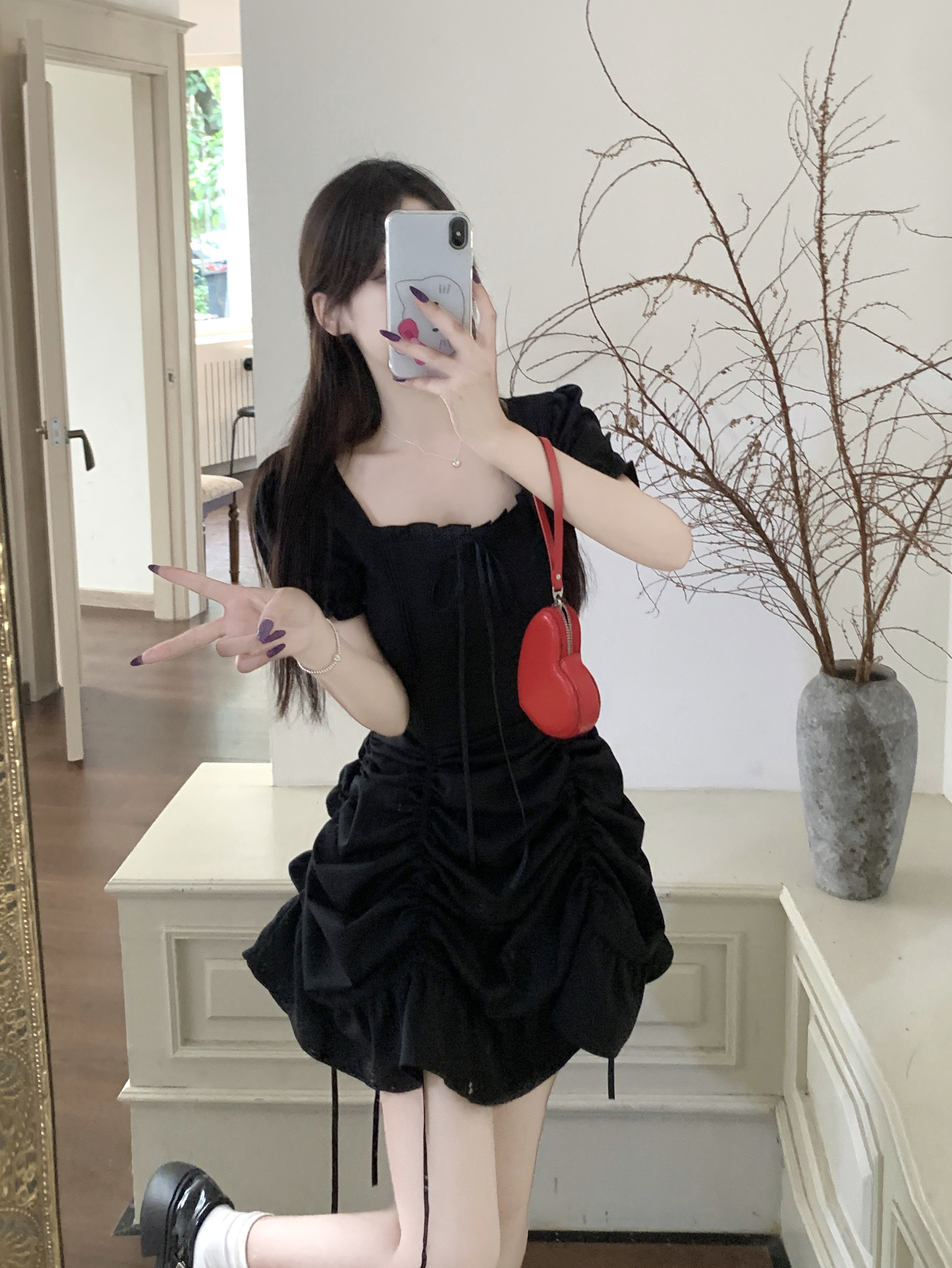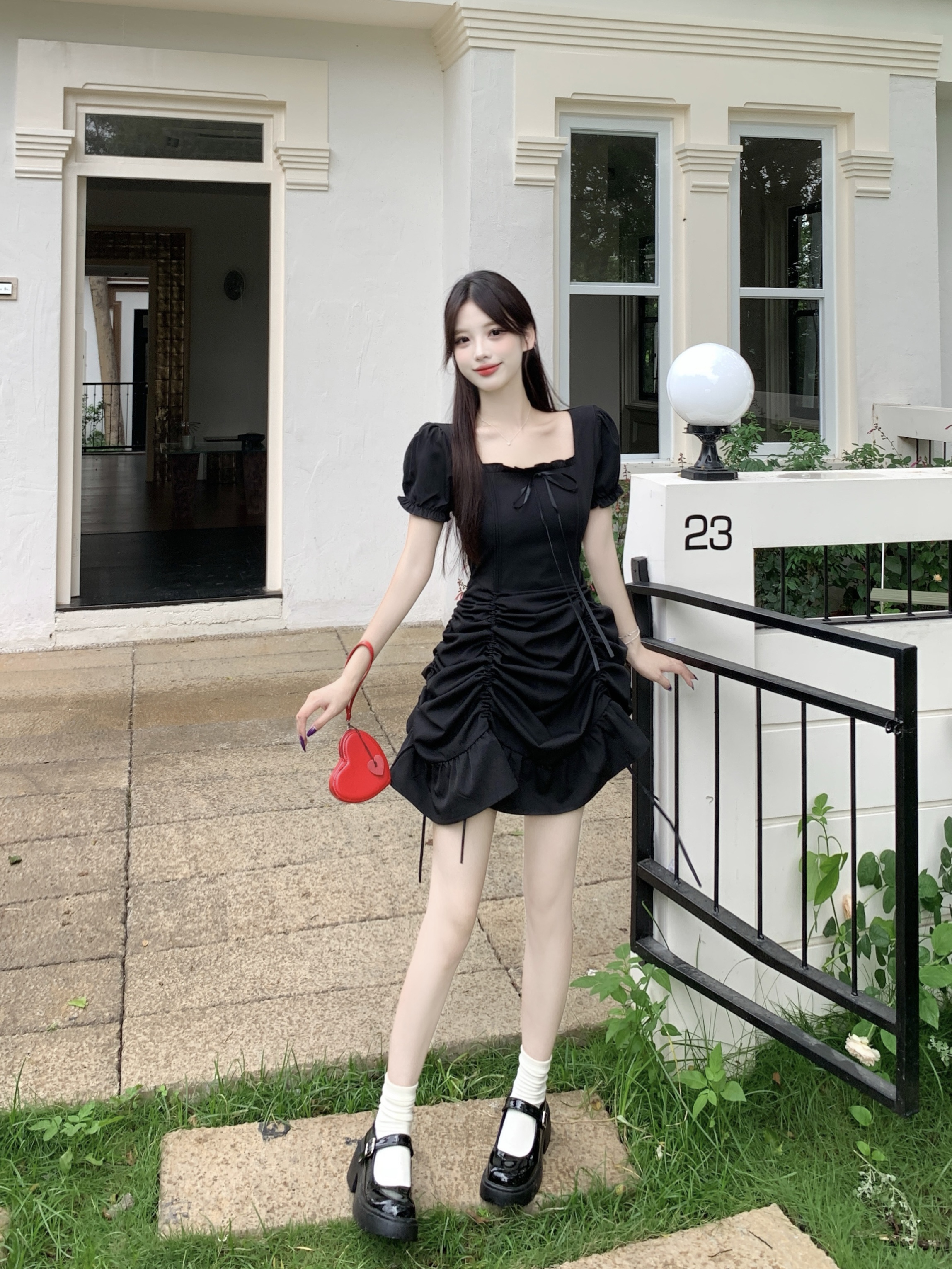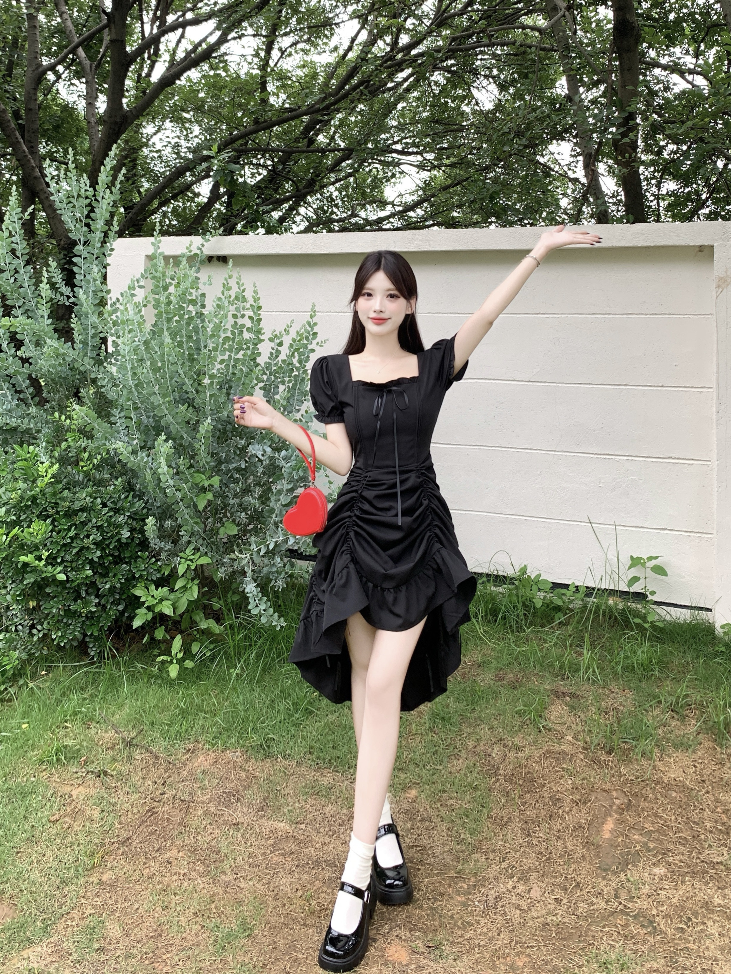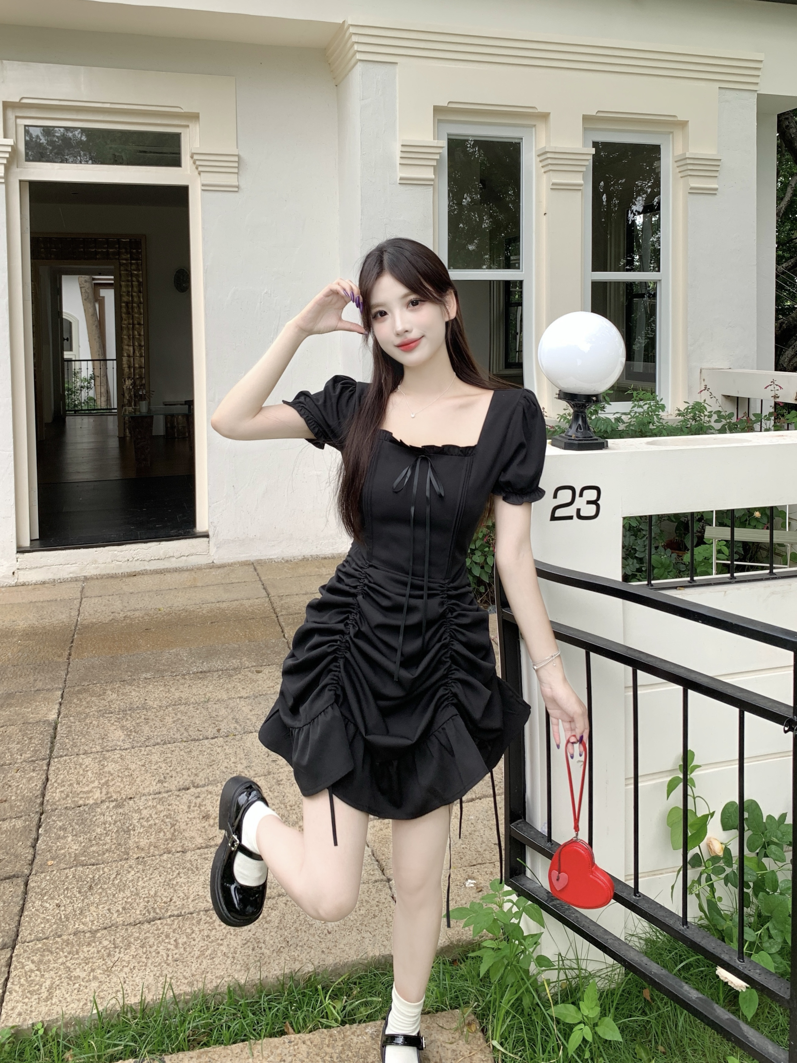 빅 사이즈 여성 의류 프랑스식 차 휴식 바람 빨간색 광장 칼라 단색 롱 스커트 가스 질감 허리 수축 쇼트 스타일 슬림해 보이는 여성 드레스