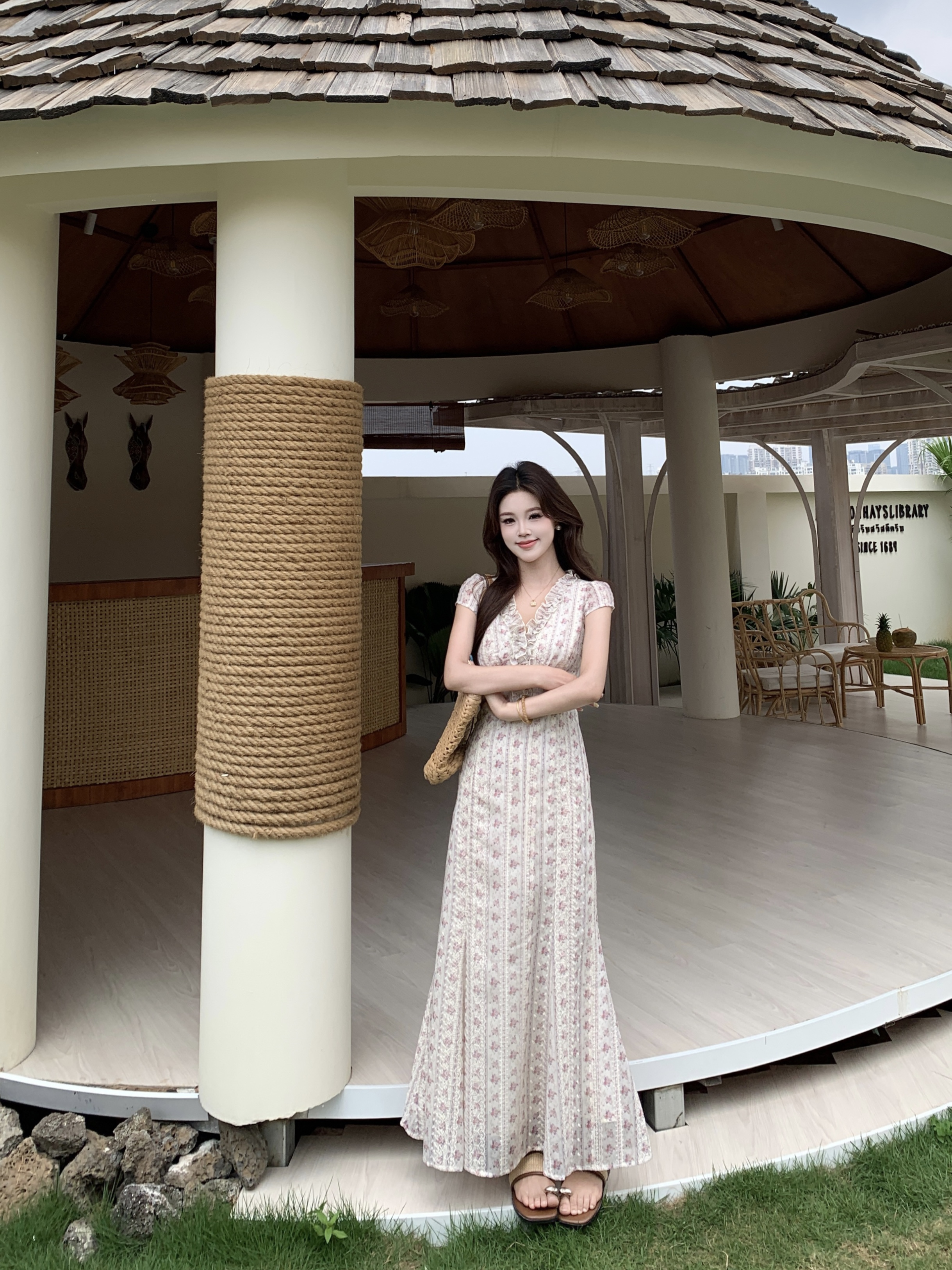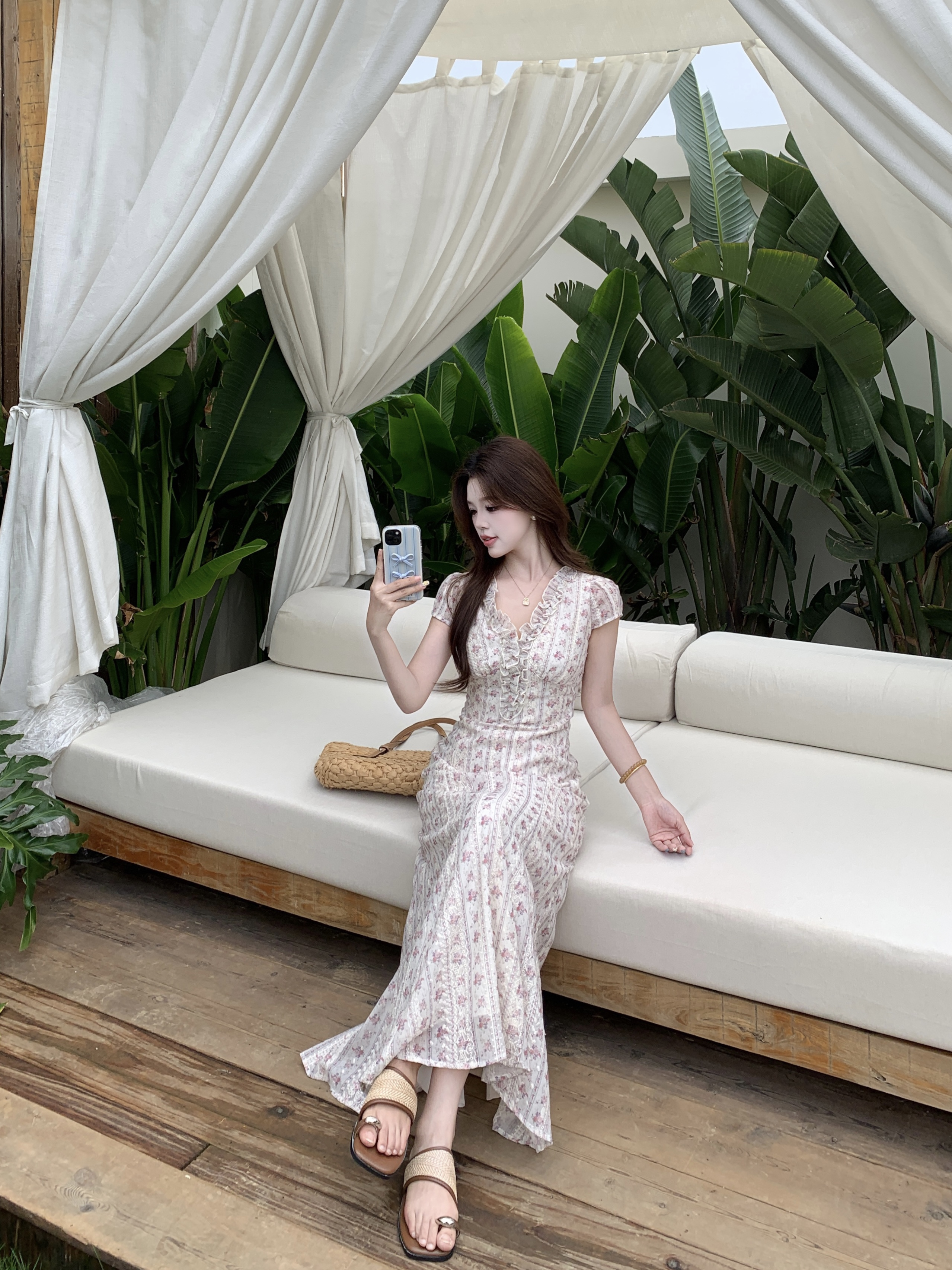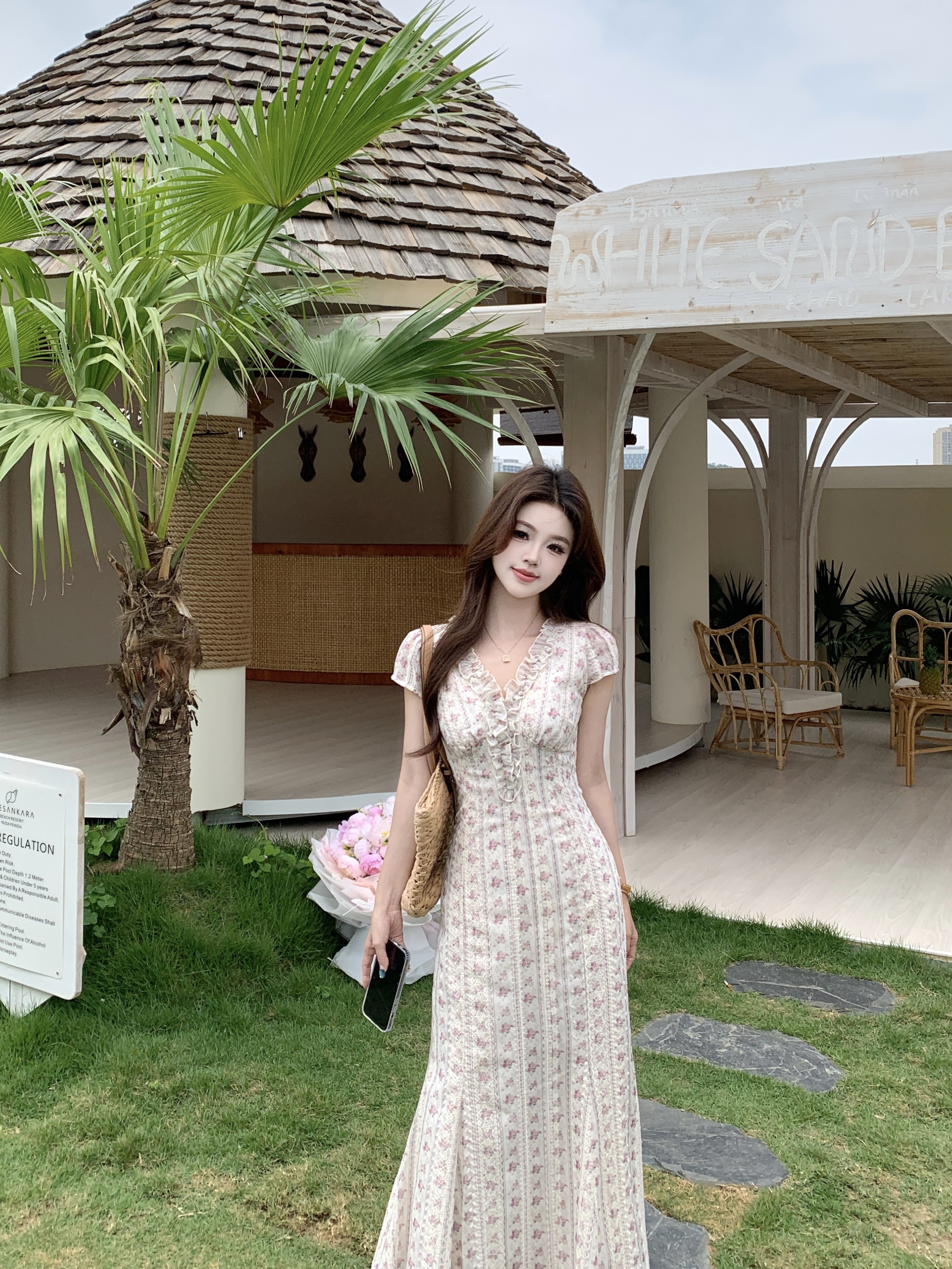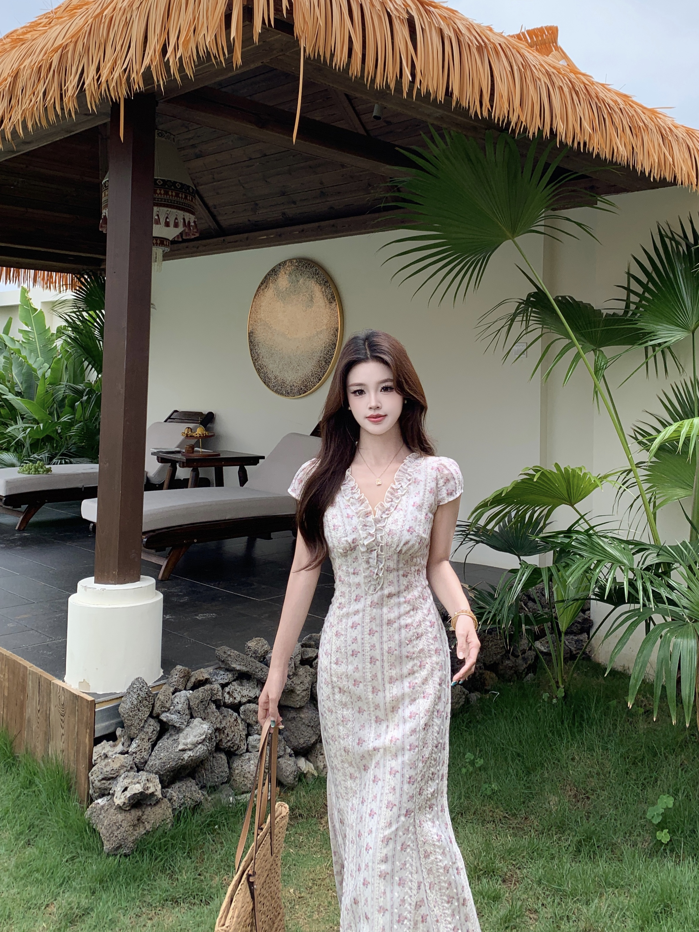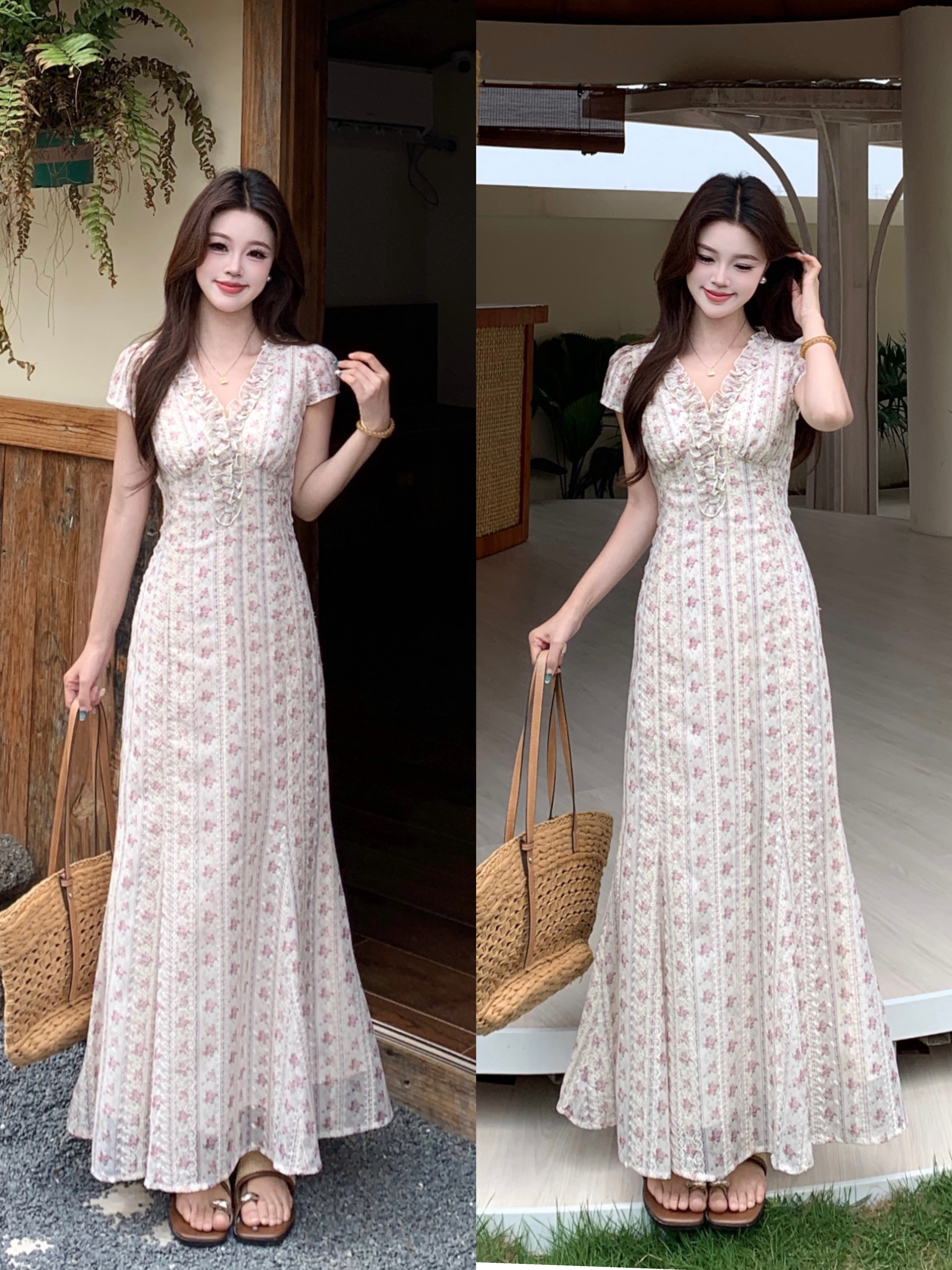 빅 사이즈 달콤한 안개 꽃 리플 레트로 V넥 자수 꽃무늬 여성 드레스 품격 고급 몸매 가꾸기 슬림해 보이는 프랑스식 롱 스커트