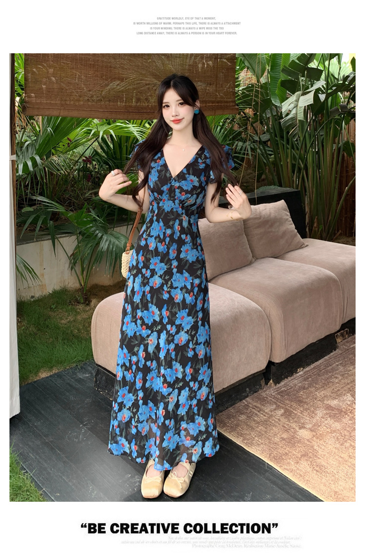 실사 빅 사이즈 여성 의류 이상적인 치마 프랑스식 낭만주의 꽃무늬 드레스 V넥 허리 수축 슬림해 보이는 휴가 바람 치마