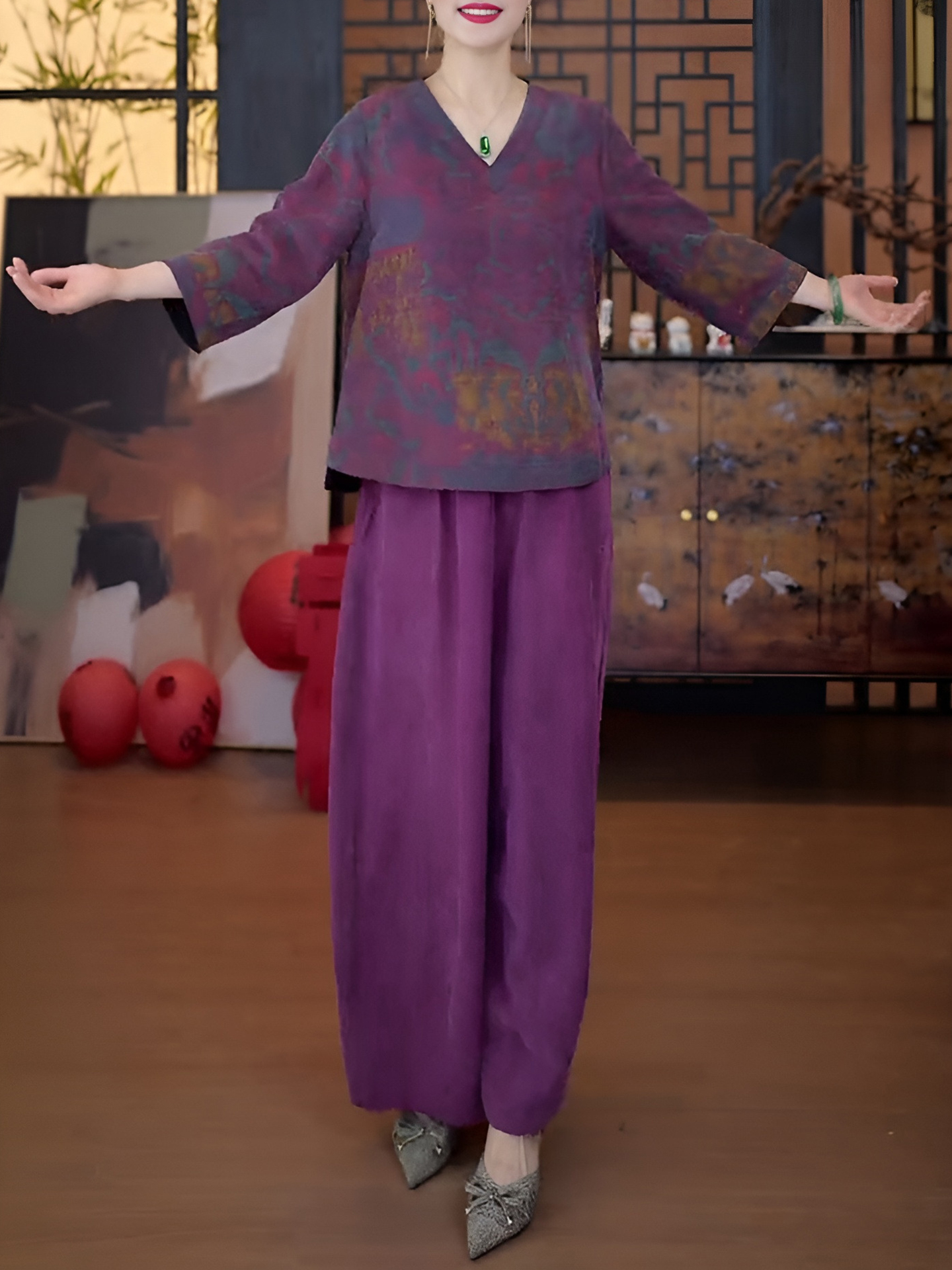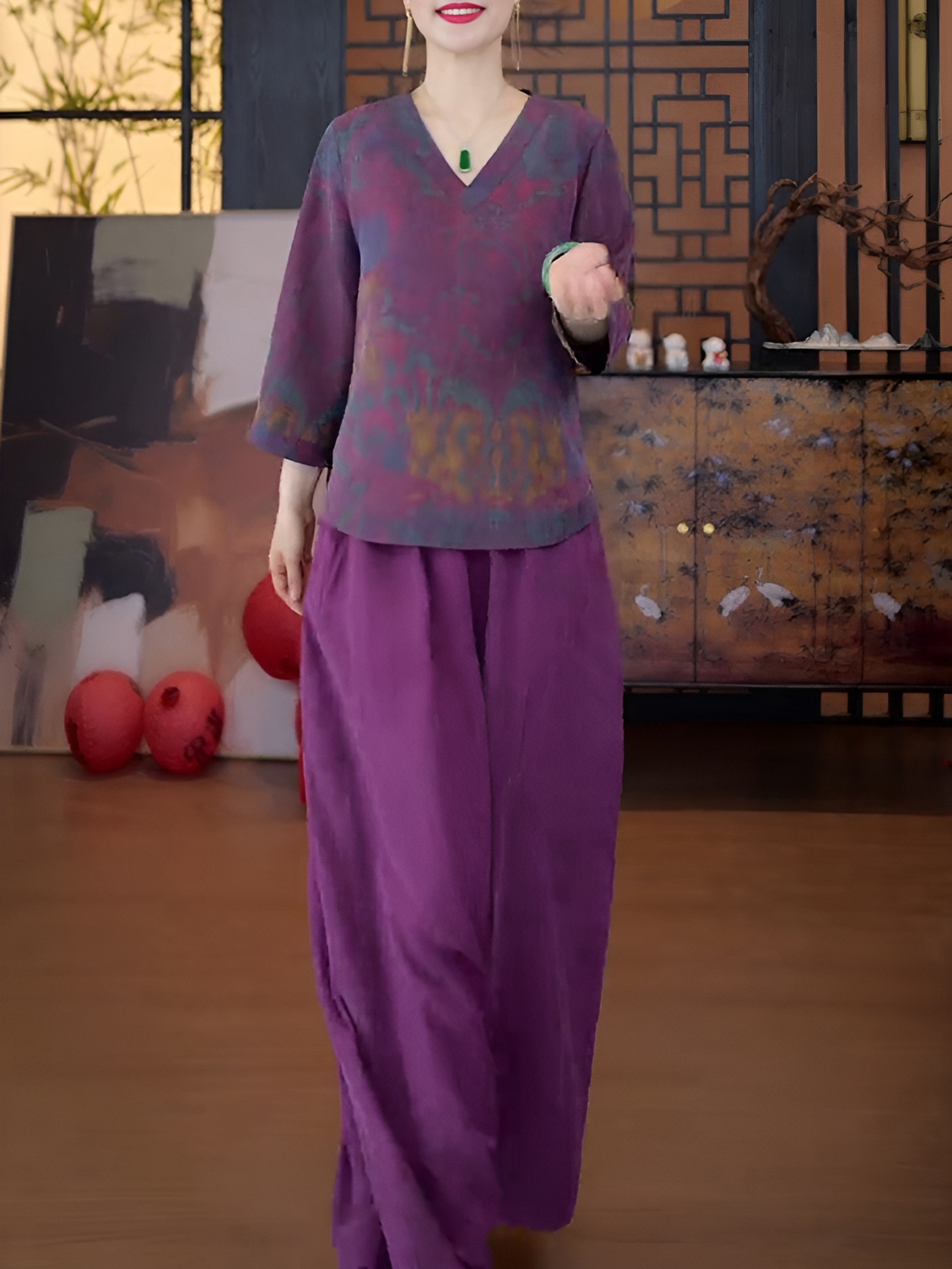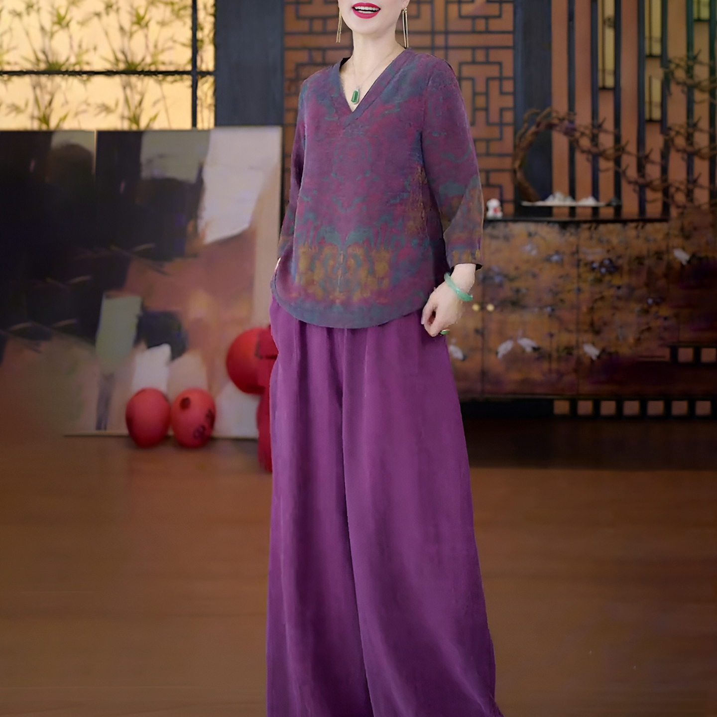 경관 그림 외국 가스 V넥 패션 연령 감소 세트 2026 여름 디자인 출퇴근 루즈핏 맨위 와이드 레그 팬츠 투피스 세트