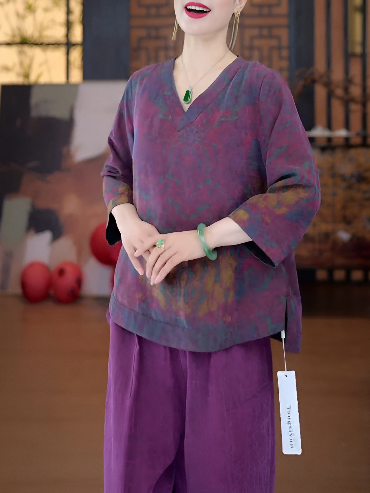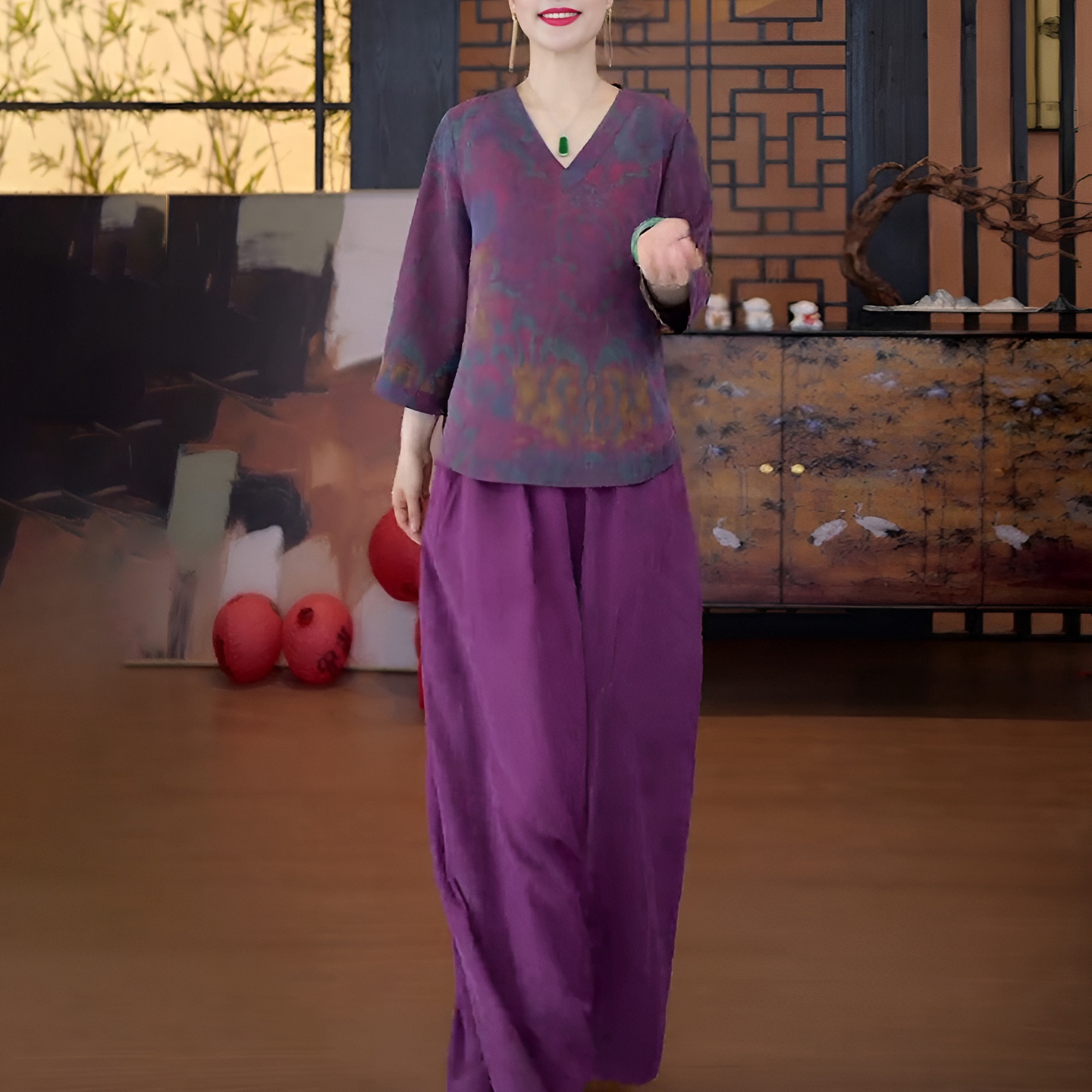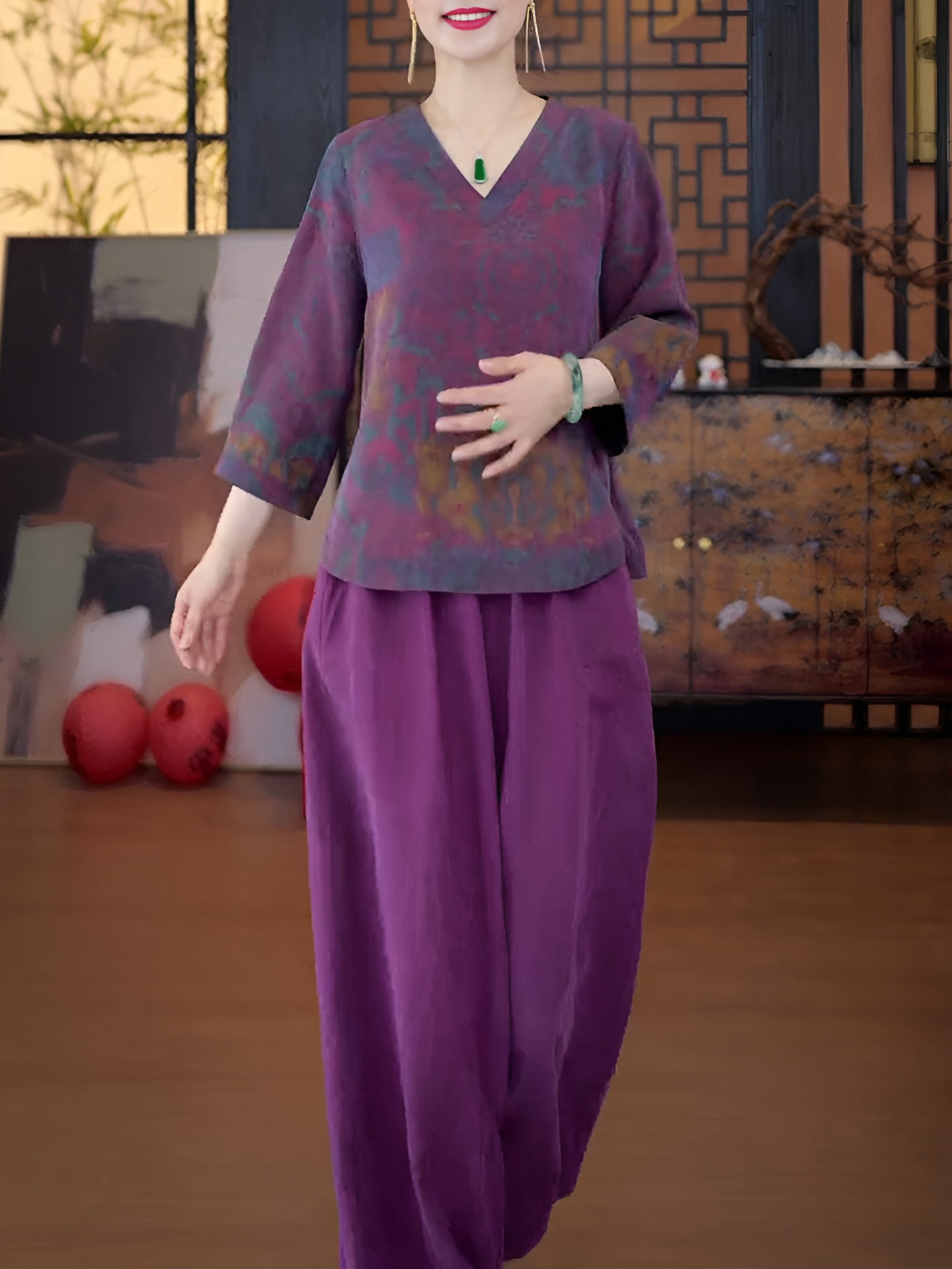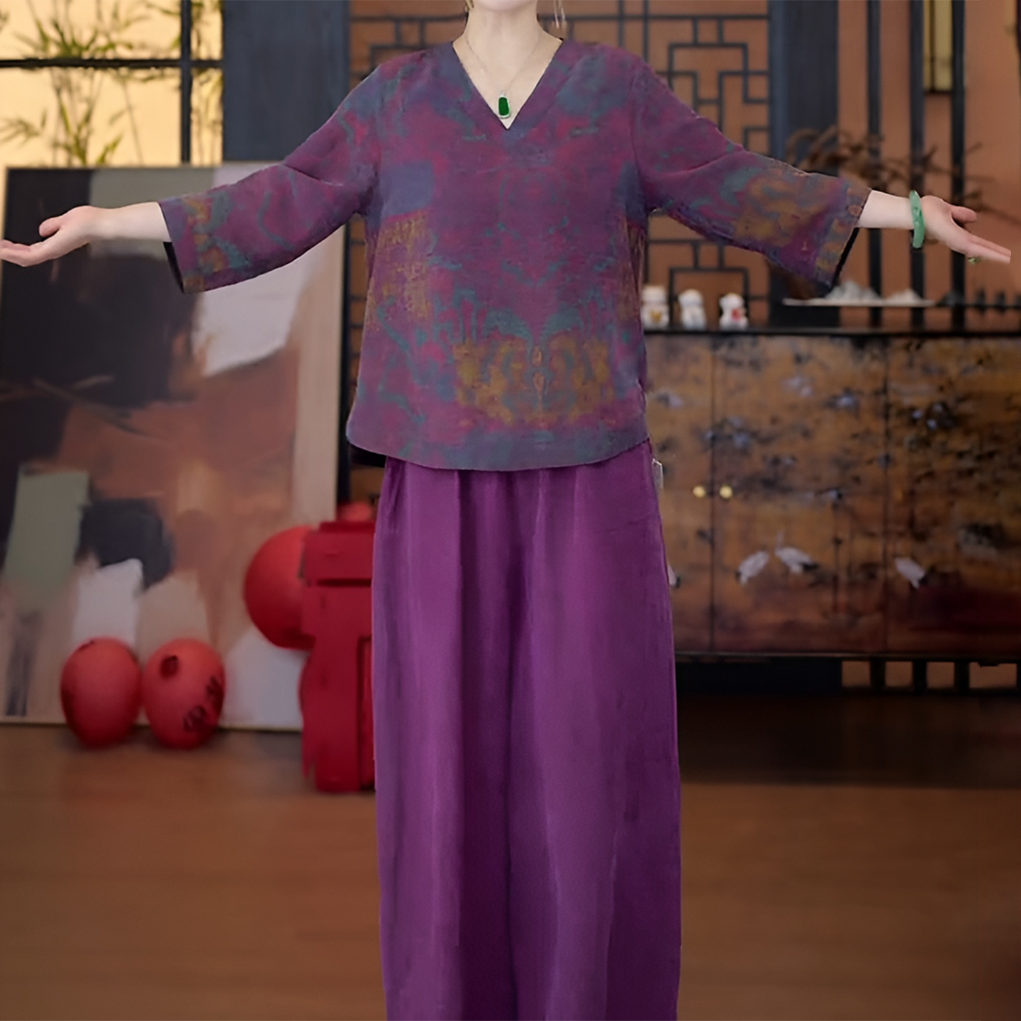 경관 그림 외국 가스 V넥 패션 연령 감소 세트 2026 여름 디자인 출퇴근 루즈핏 맨위 와이드 레그 팬츠 투피스 세트