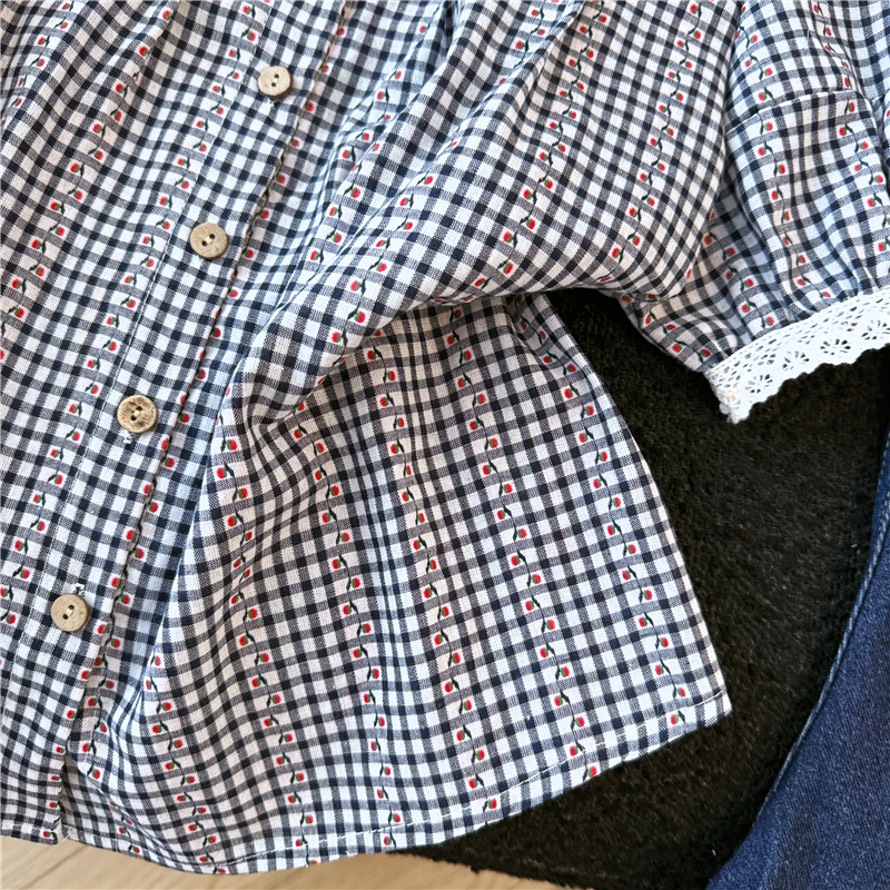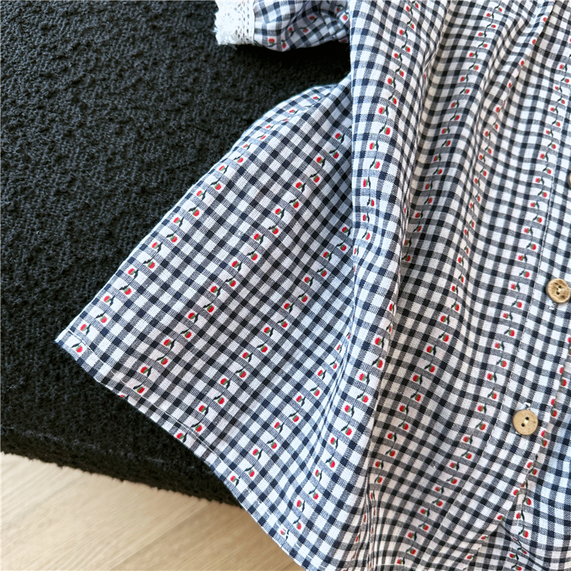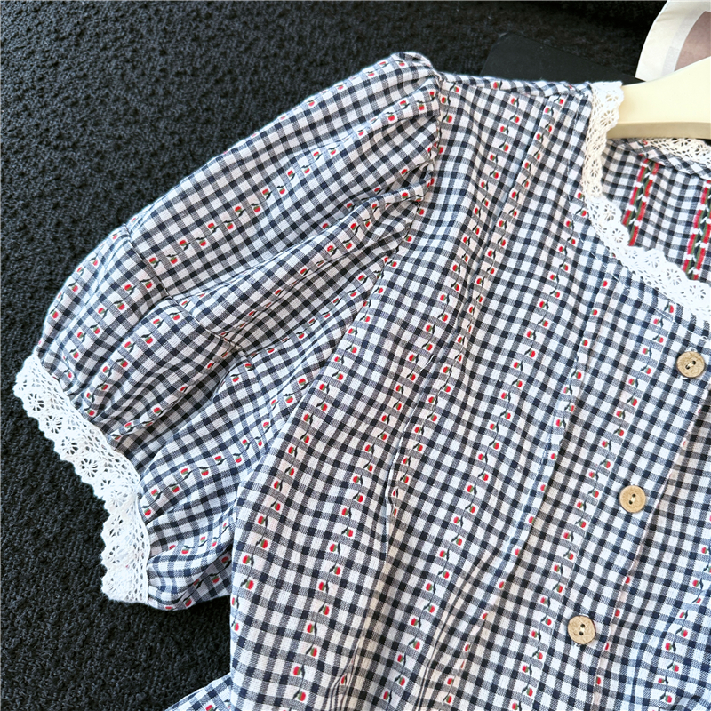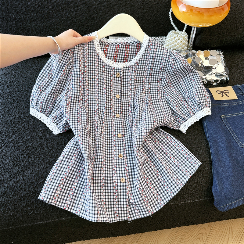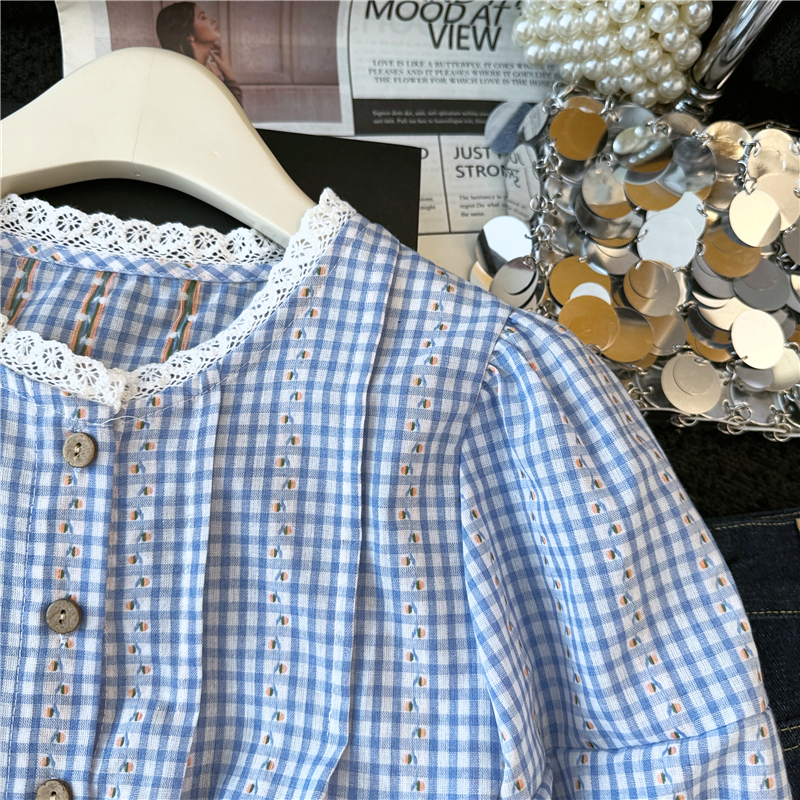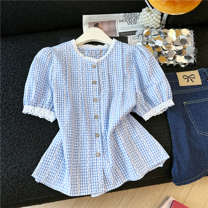 2026 년 여름 새로운 느긋한 바람 레이스 조각 블루 체크무늬 거품 소매 여성 셔츠 루즈핏 반팔 맨위