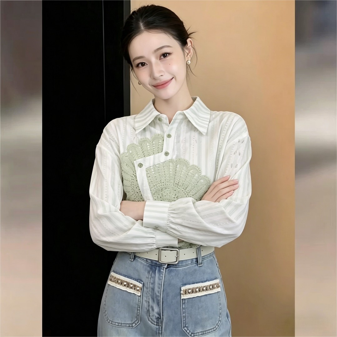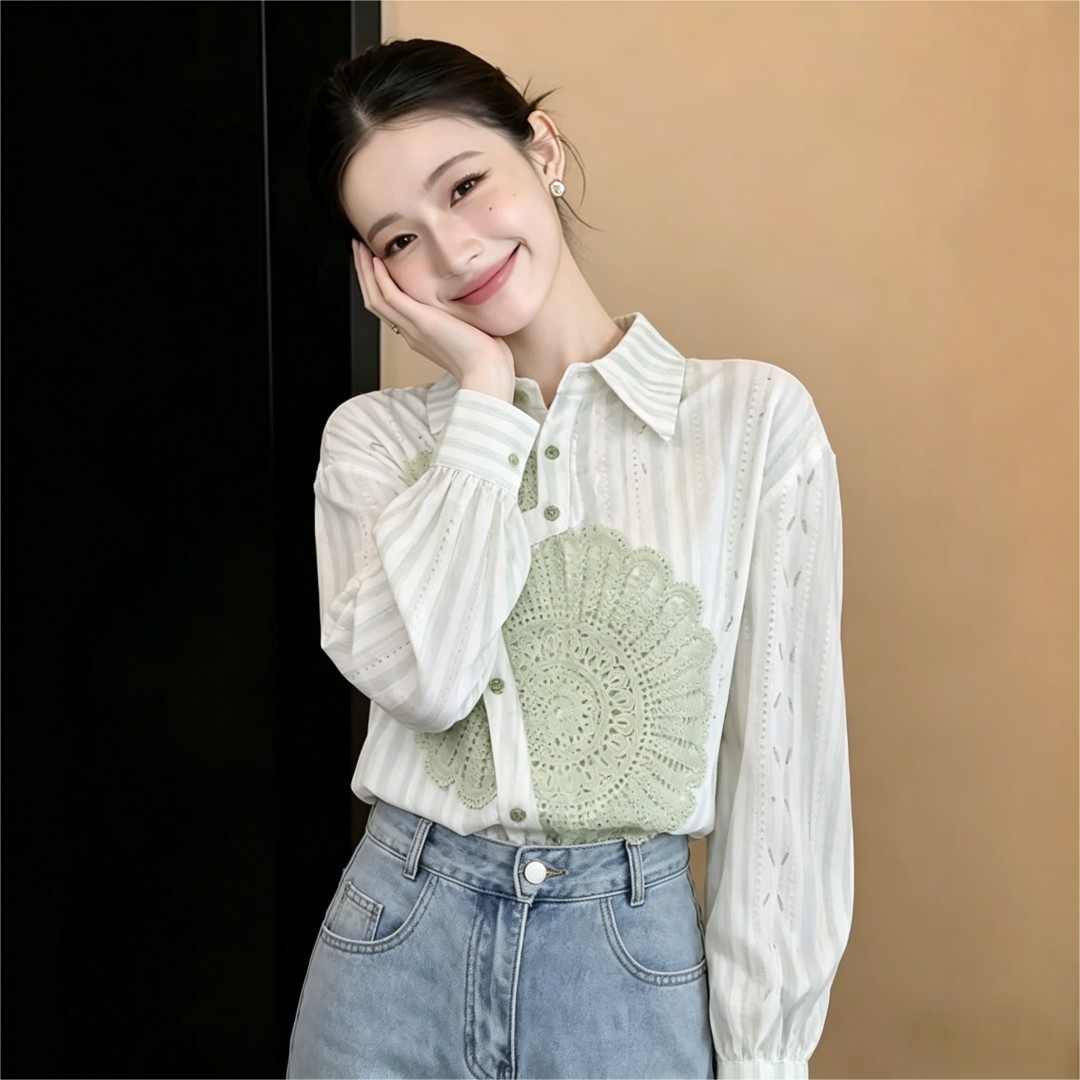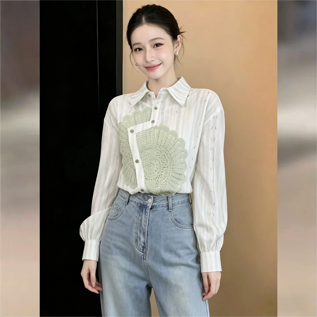 실사 프랑스식 레트로 레이스 조각 작은 대중 폴로 칼라 긴팔 여성 셔츠 2026 봄 가을 루즈핏 슬림해 보이는 맨위