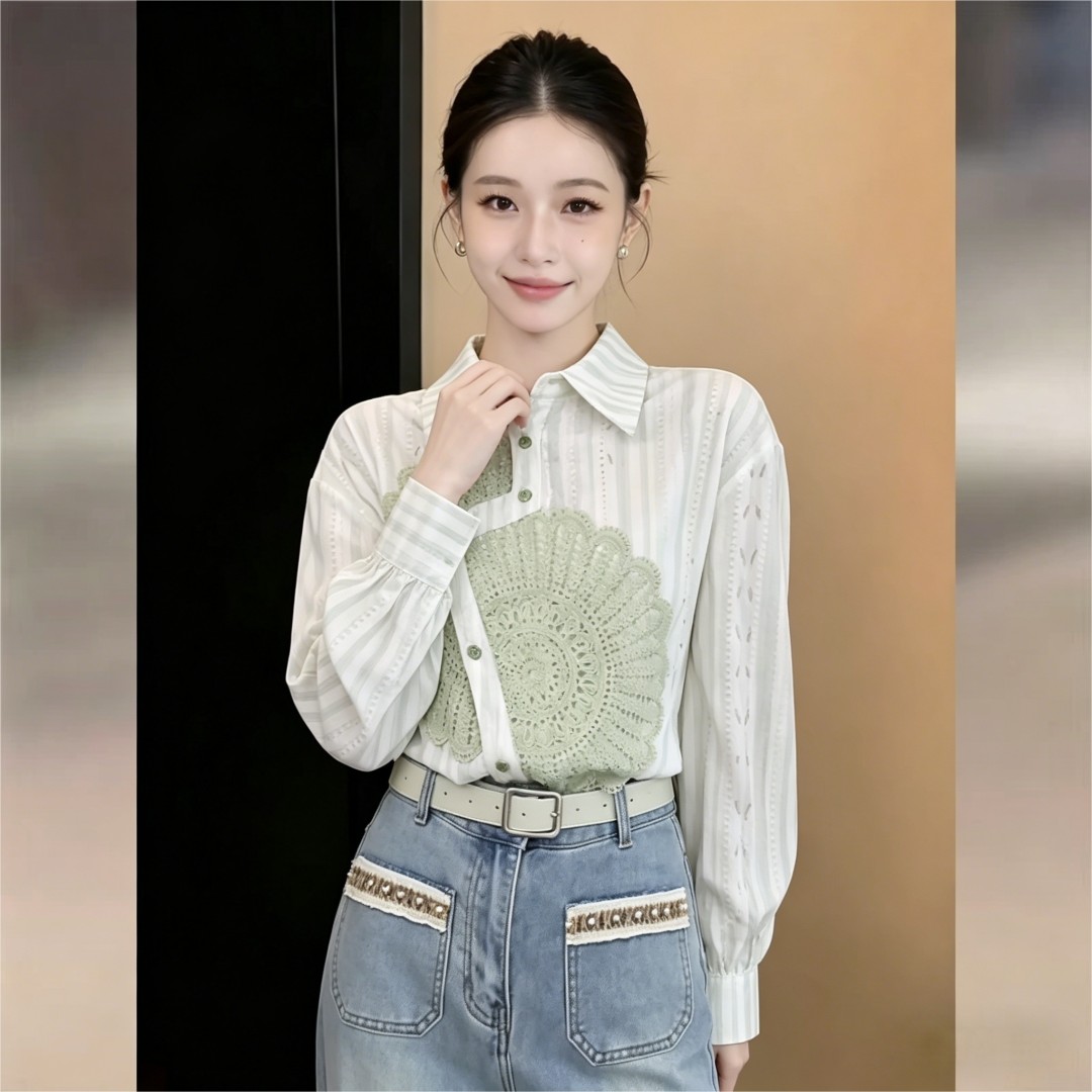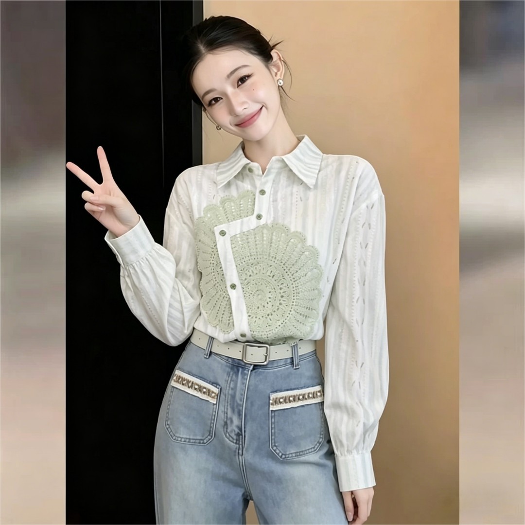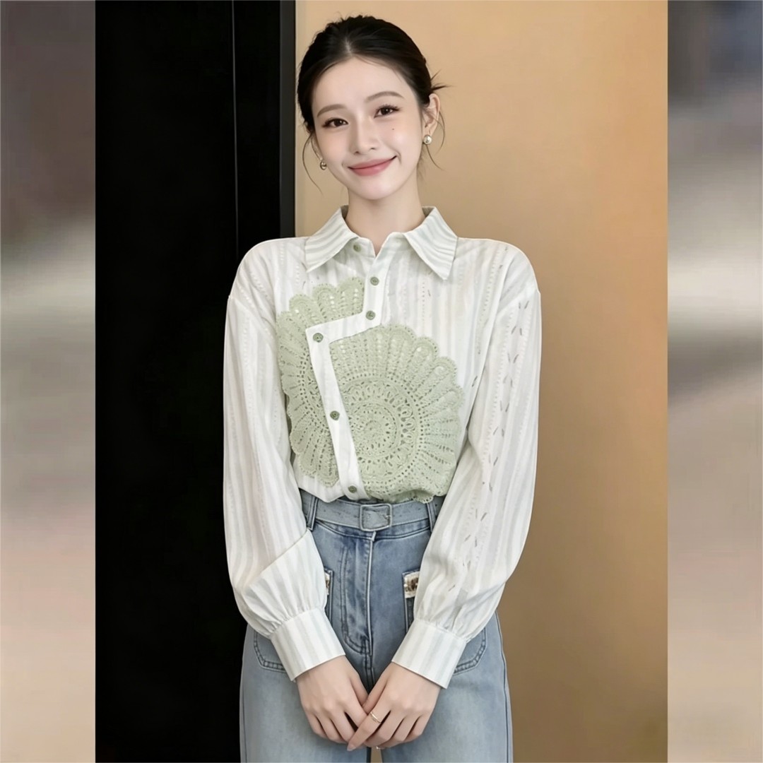 실사 프랑스식 레트로 레이스 조각 작은 대중 폴로 칼라 긴팔 여성 셔츠 2026 봄 가을 루즈핏 슬림해 보이는 맨위