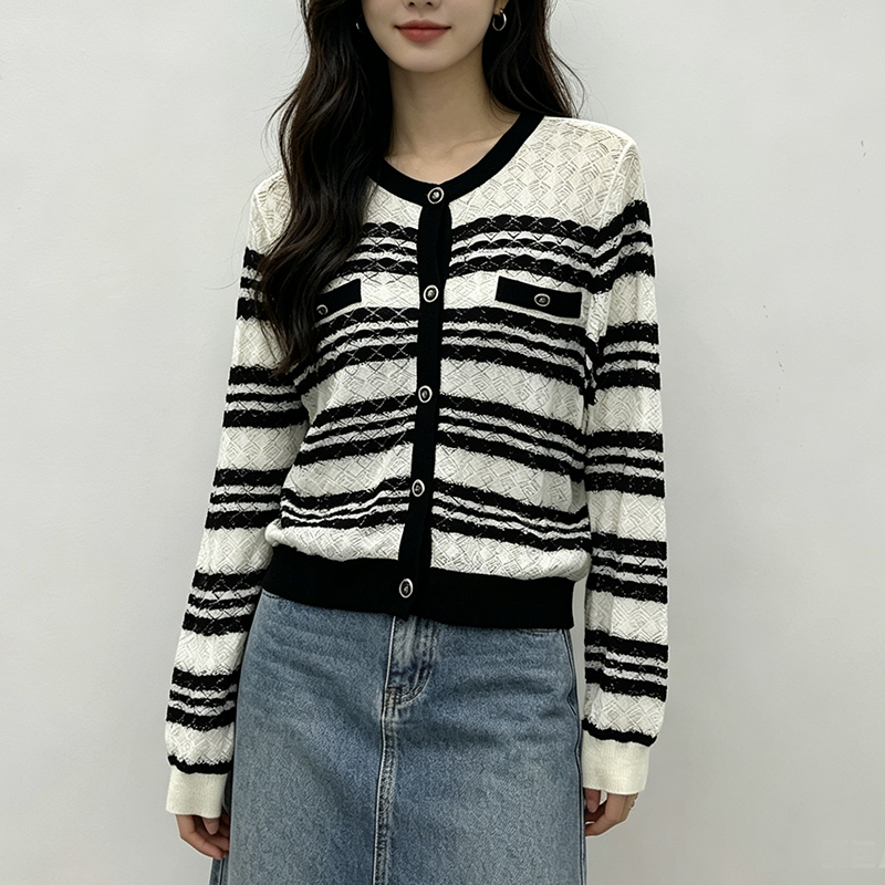 실사 ins 한 부서 우아함 품격 V넥 스트라이프 홀로우 아웃 초박형 니트 오픈 가디건 긴팔 여성 자외선 차단 의류 봄 여름