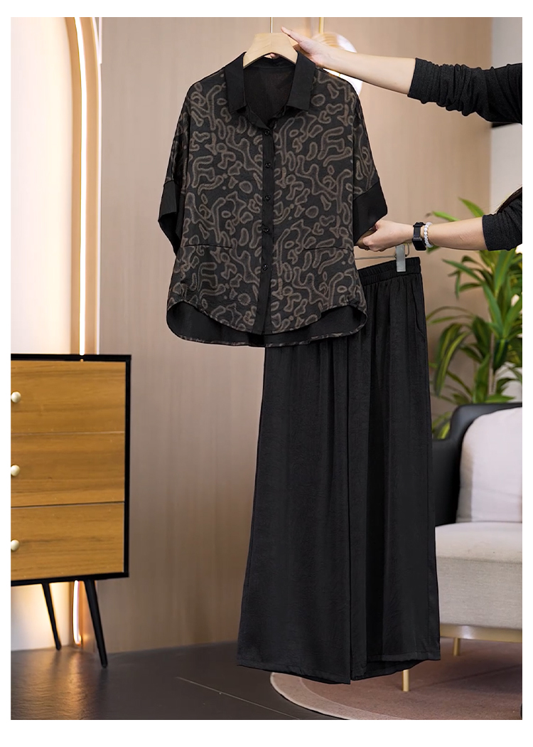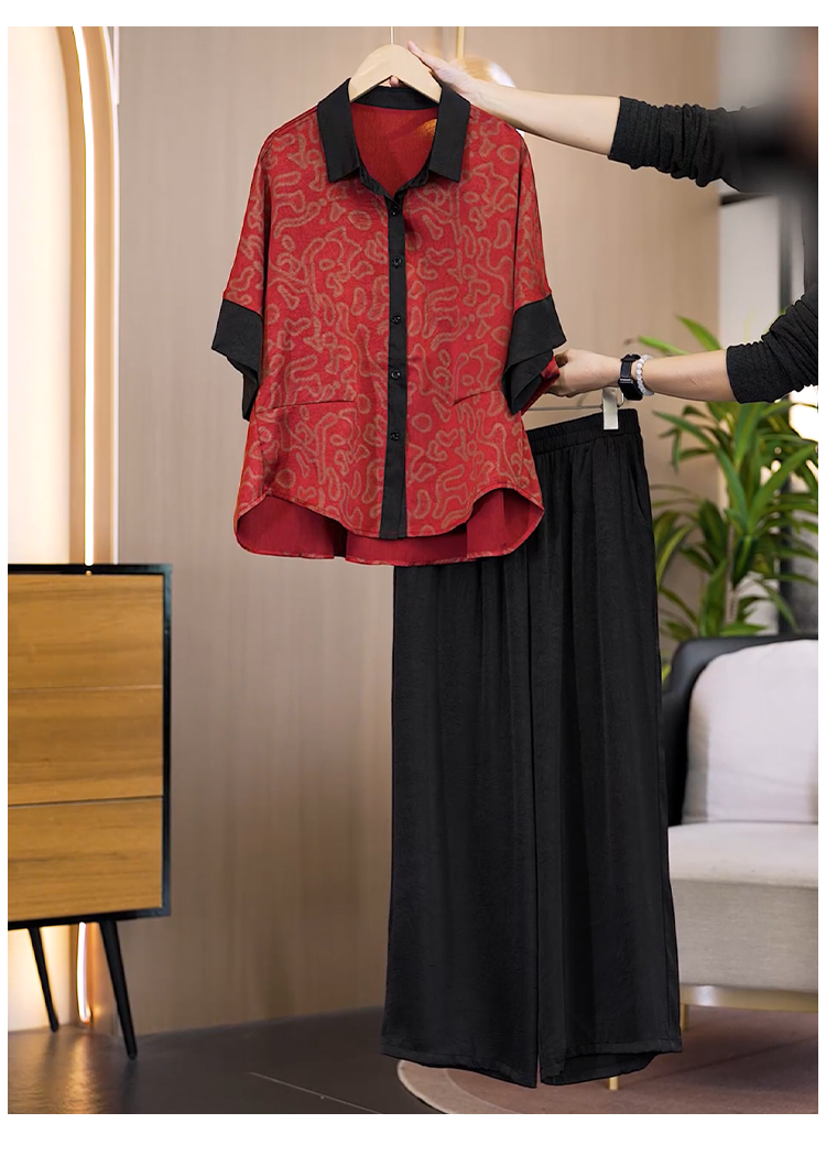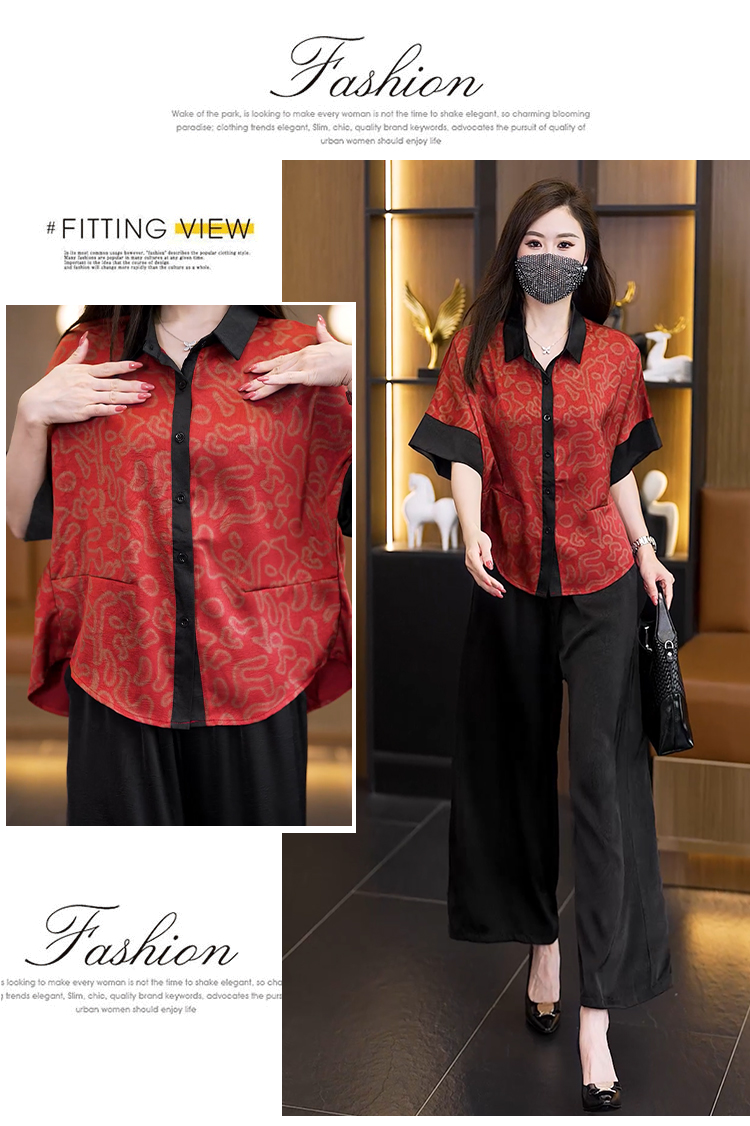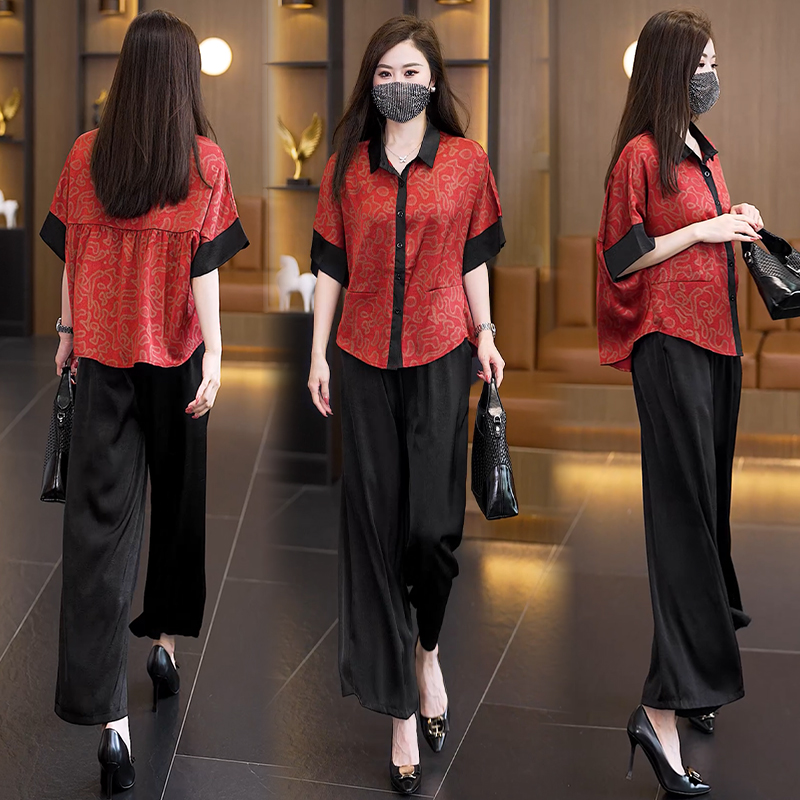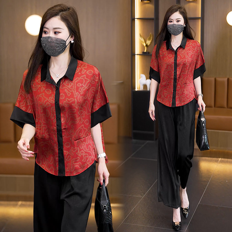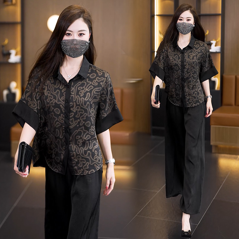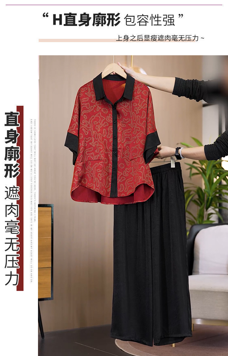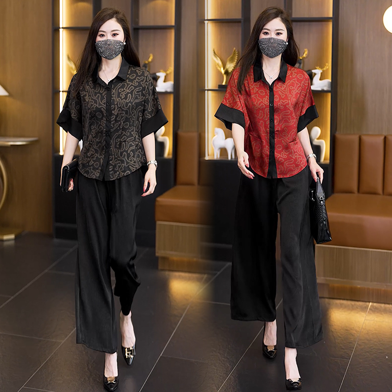중년 엄마 여름 드레스 패션 세트 루즈핏 와이드 레그 팬츠 외국 가스 빅 사이즈 여성 의류 아세트산 공단 고급 투피스 세트