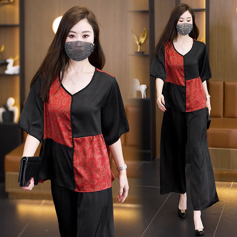 중년 엄마 여름 드레스 패션 세트 루즈핏 와이드 레그 팬츠 외국 가스 빅 사이즈 여성 의류 아세트산 공단 고급 투피스 세트