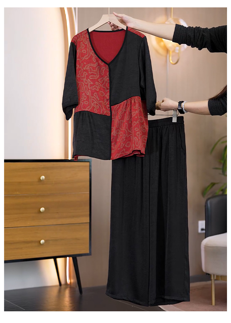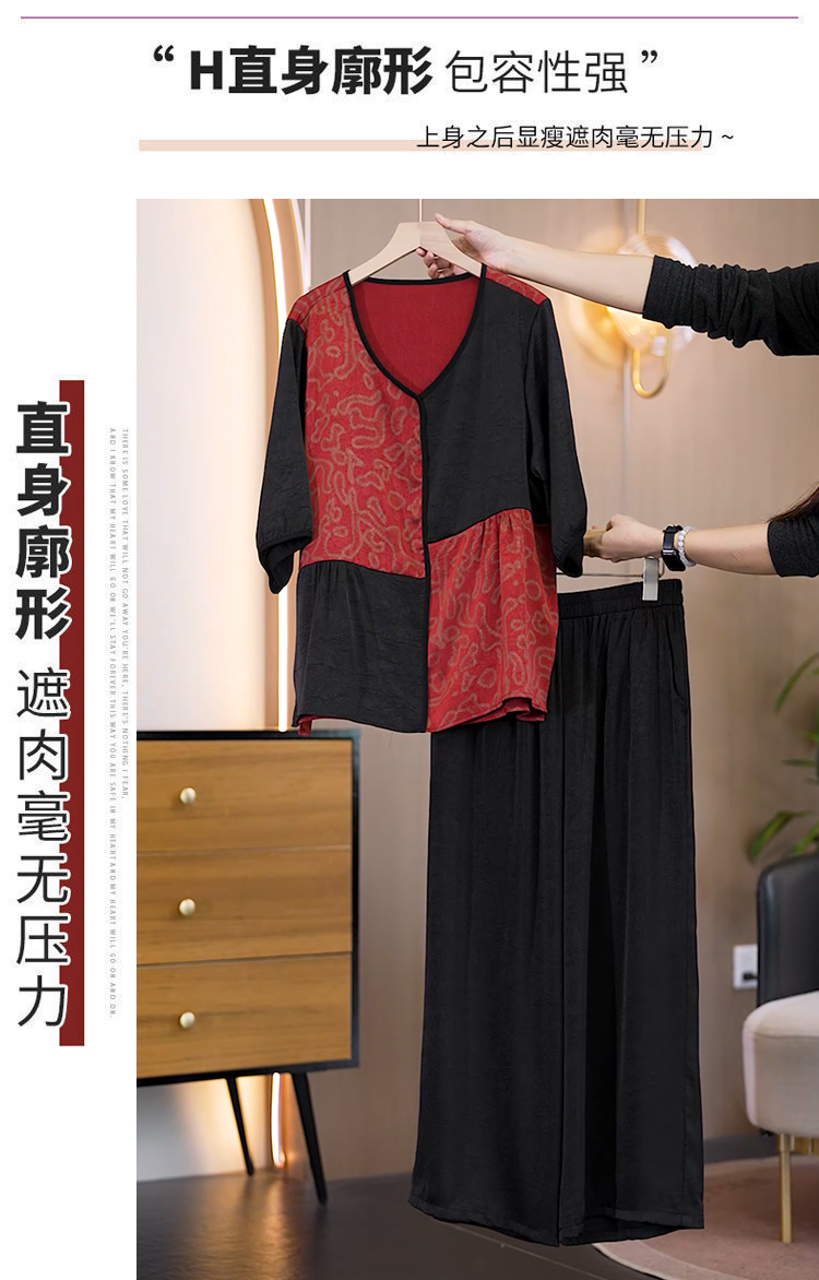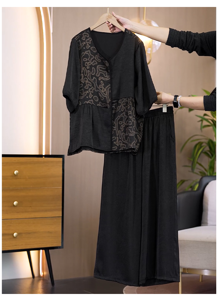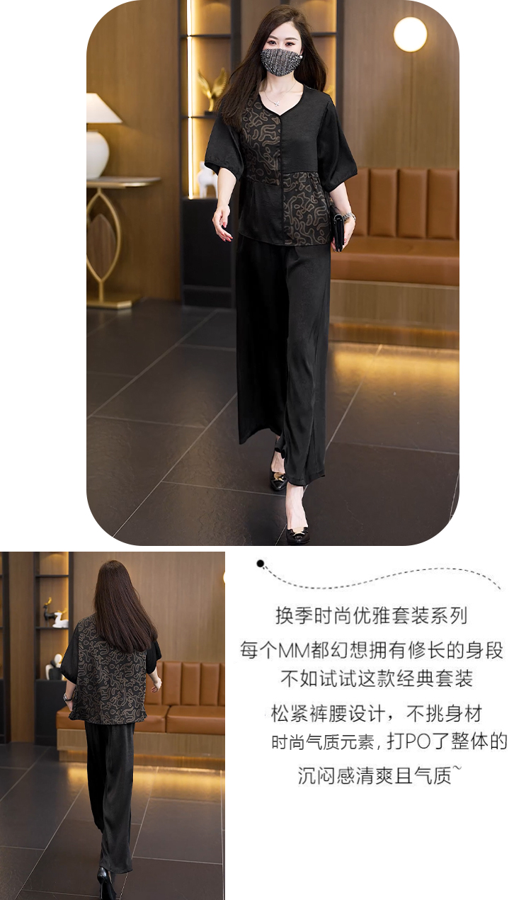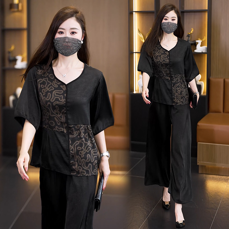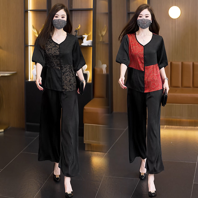 중년 엄마 여름 드레스 패션 세트 루즈핏 와이드 레그 팬츠 외국 가스 빅 사이즈 여성 의류 아세트산 공단 고급 투피스 세트