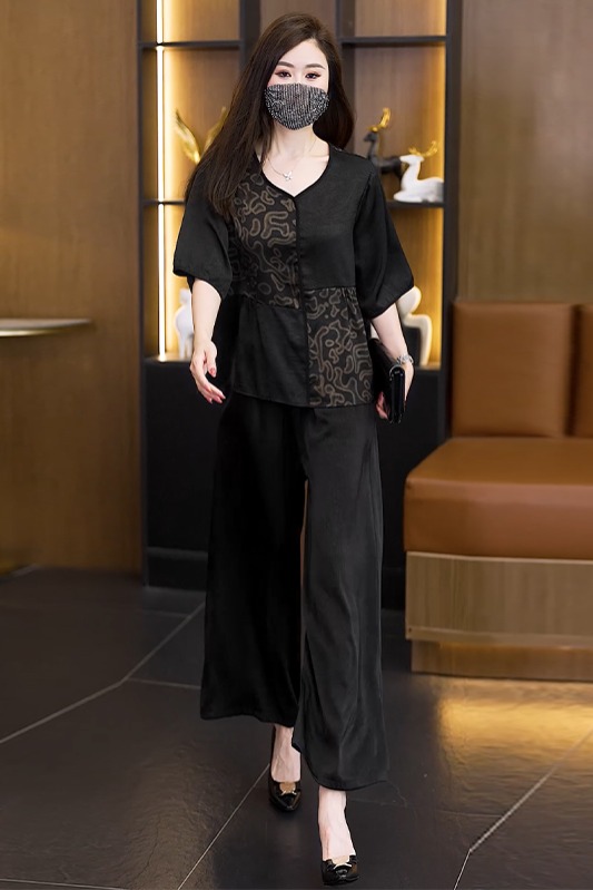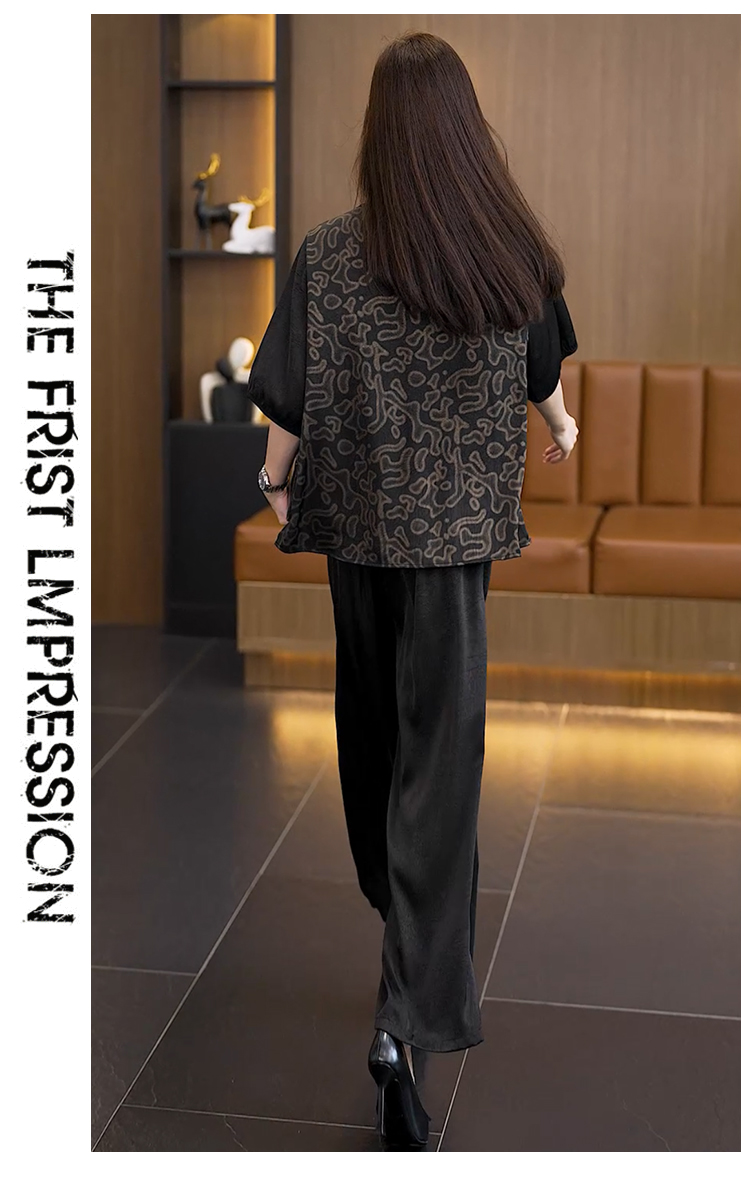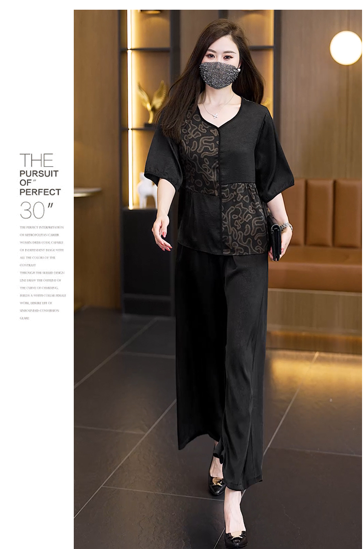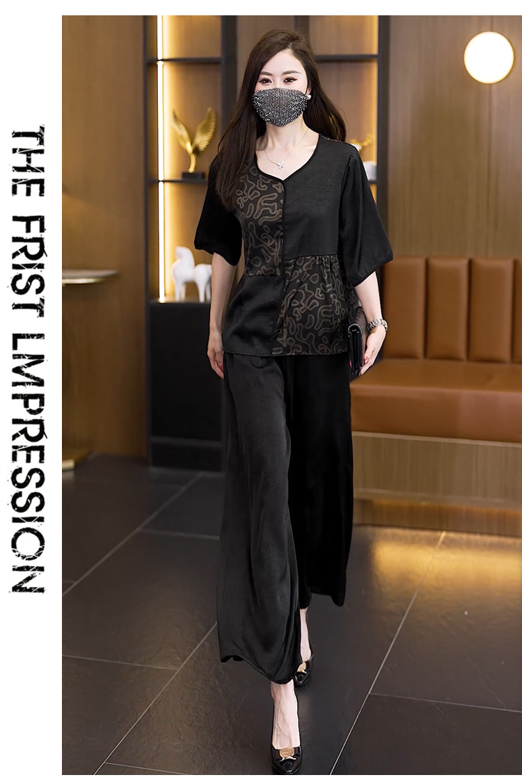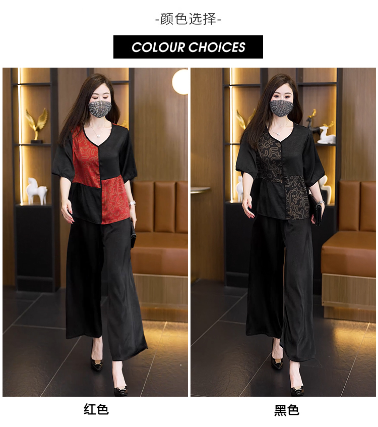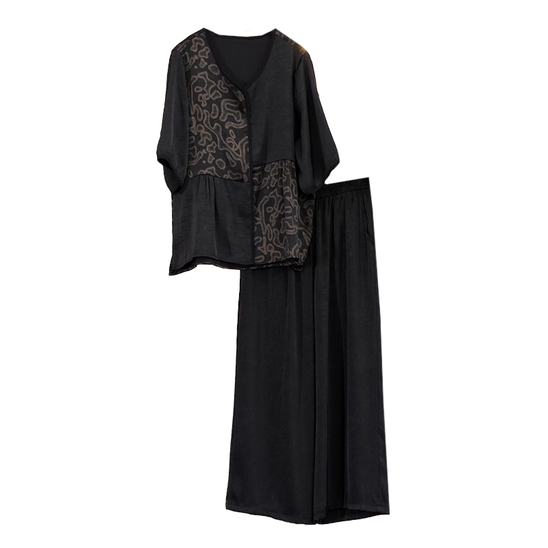 중년 엄마 여름 드레스 패션 세트 루즈핏 와이드 레그 팬츠 외국 가스 빅 사이즈 여성 의류 아세트산 공단 고급 투피스 세트