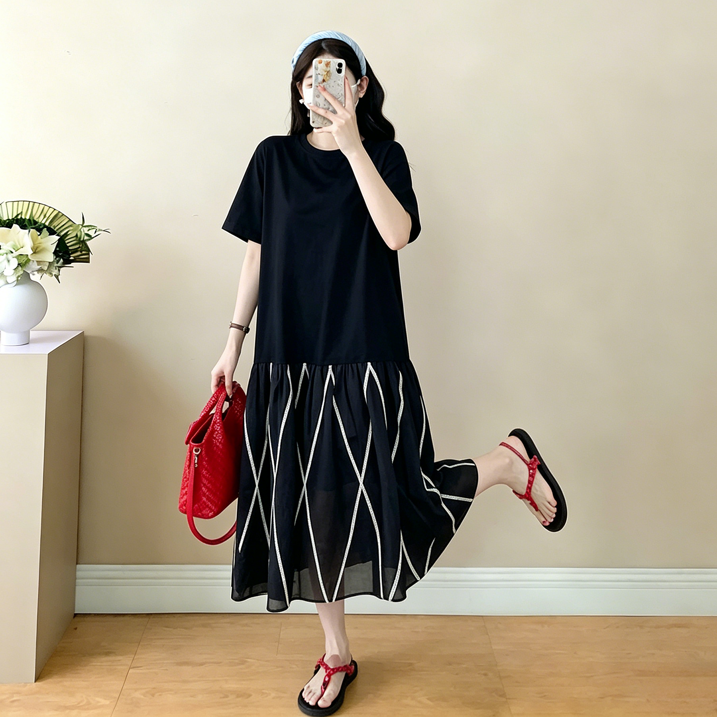 실사 임산부 루즈핏 슬림해 보이는 고급 센스 자수 치마 페이크 레이어드 반팔 드레스