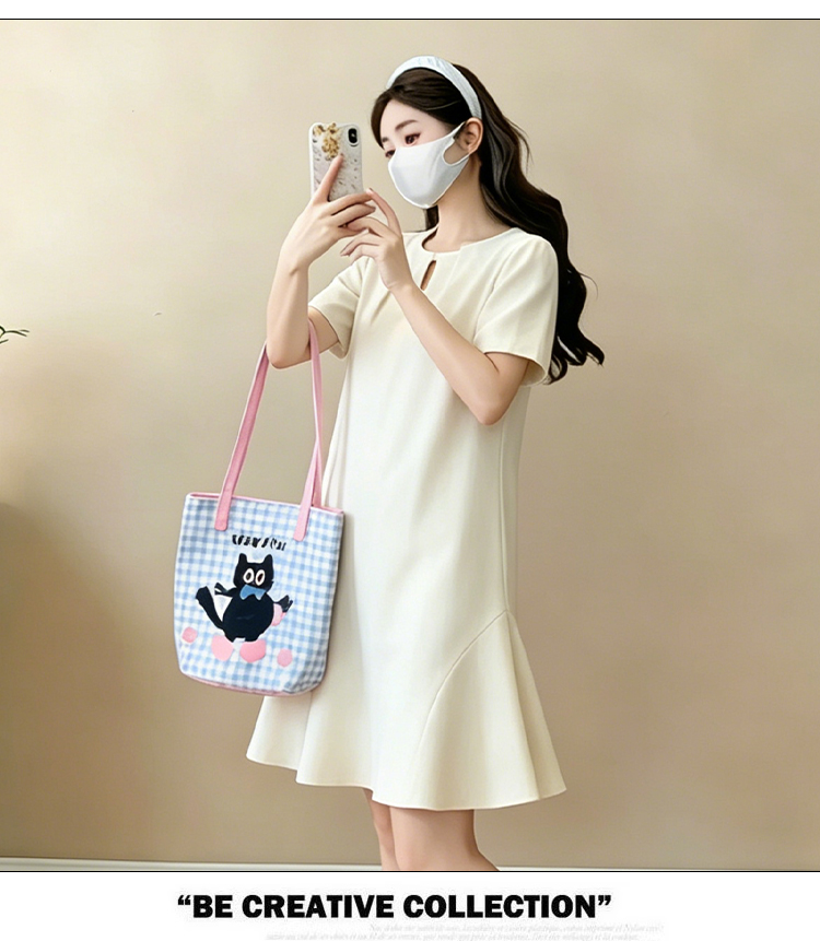 실사 임산부 루즈핏 슬림해 보이는 고급 센스 자수 치마 페이크 레이어드 반팔 드레스