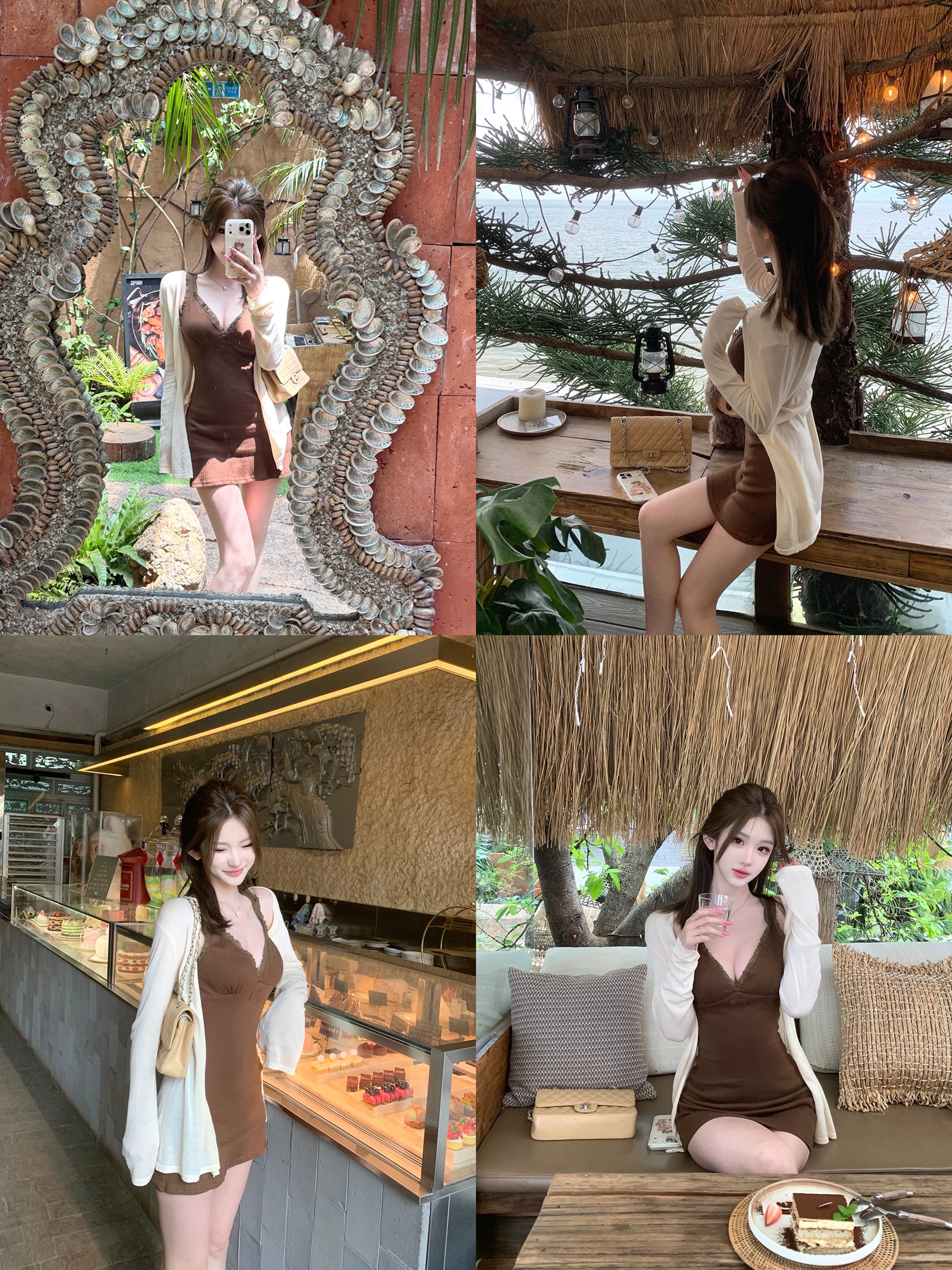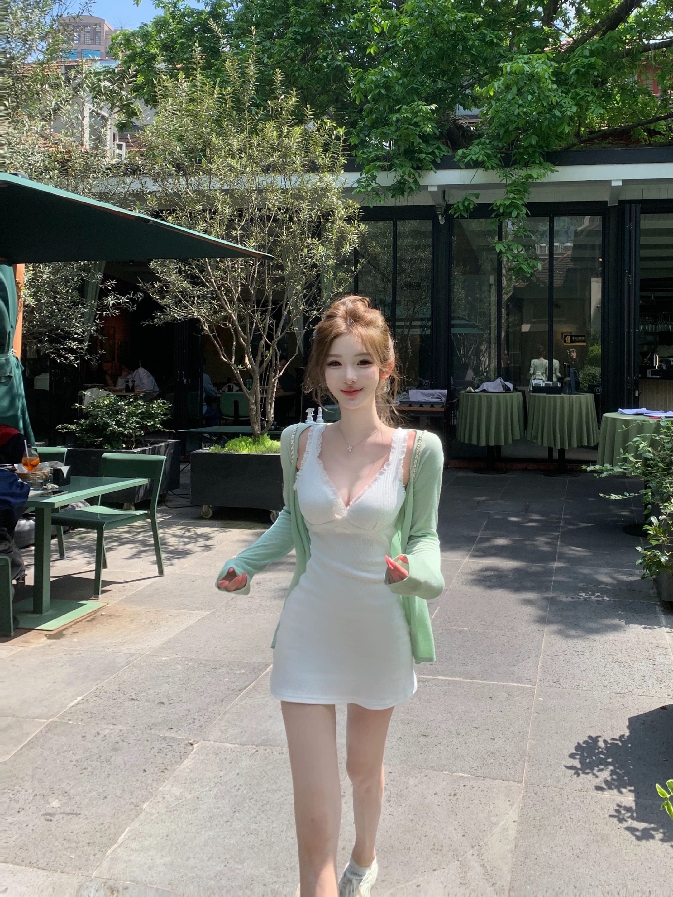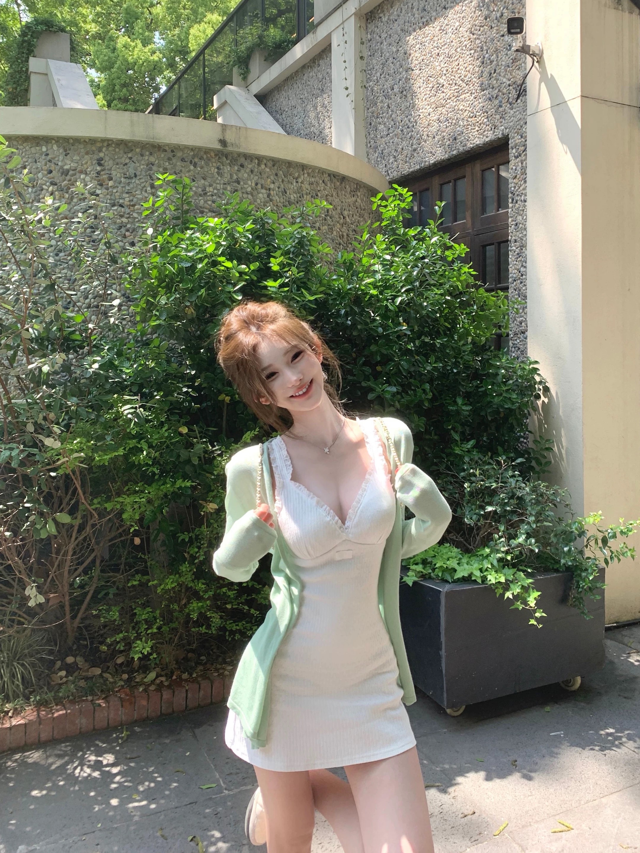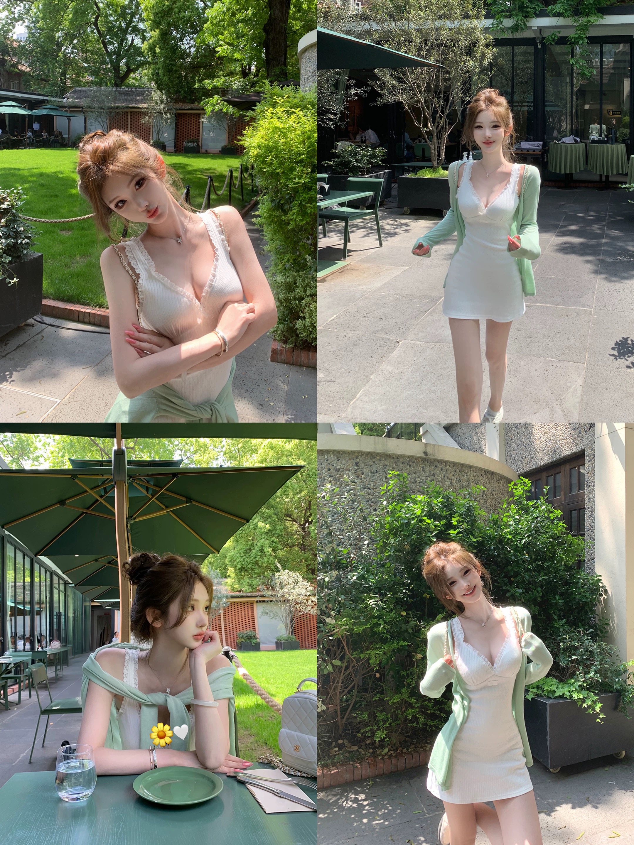 04 28 jmshopmiu 부서 교과서 자카드 구덩이 기사 니트 원피스 여성 V넥 레이스 캐미솔
