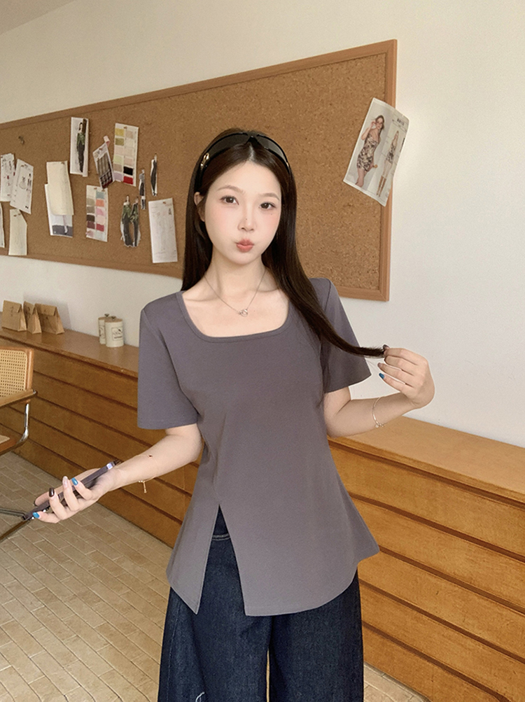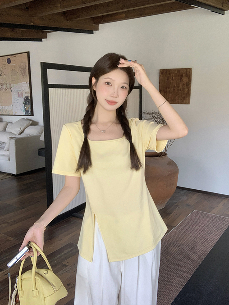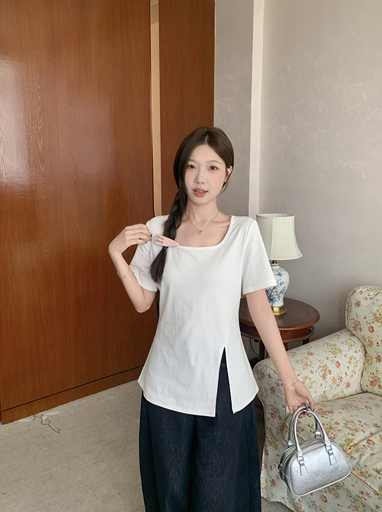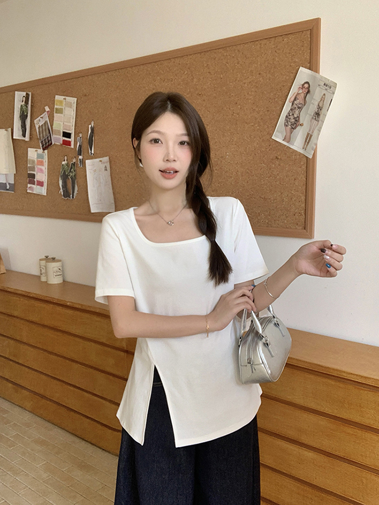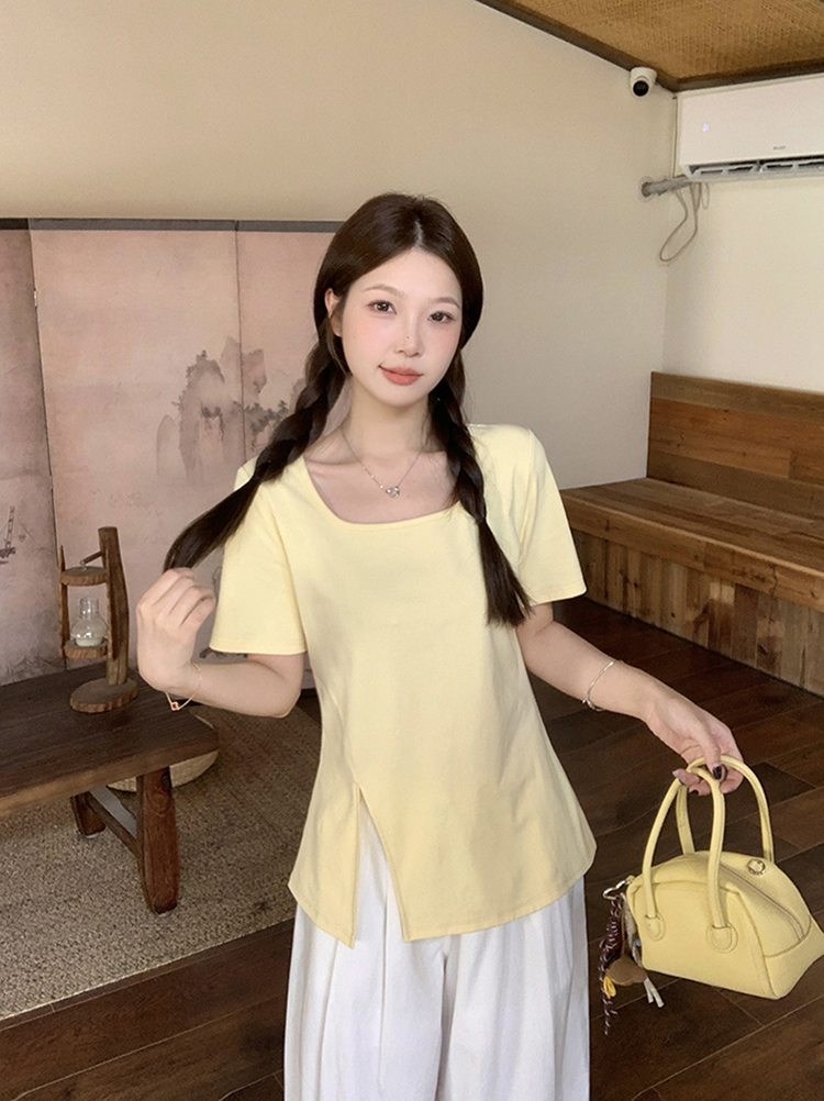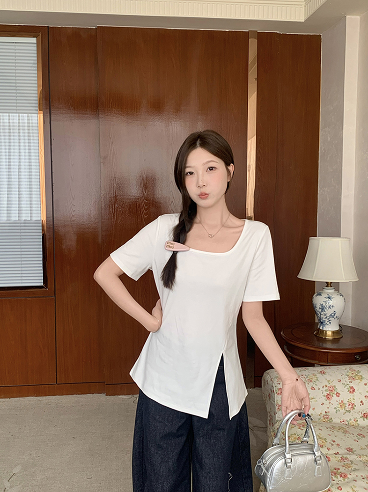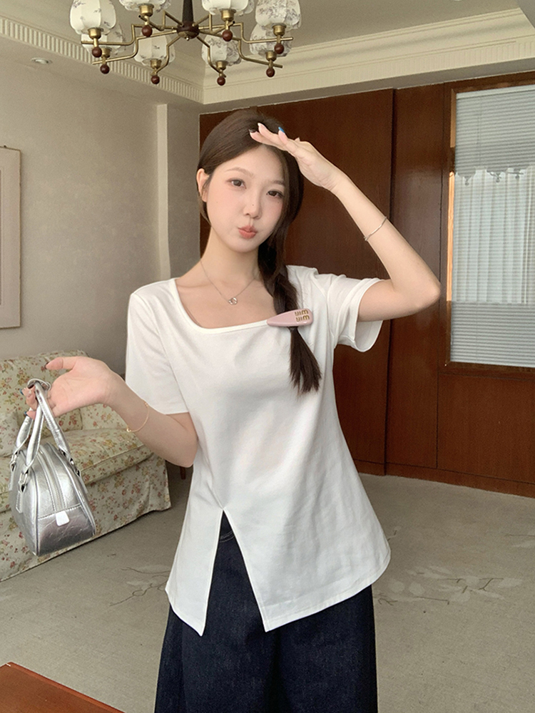 실사 2026 여름 드레스 새로운 지방 mm 빅 사이즈 여성 레저 품격 광장 칼라 불규칙 트임 반팔 티셔츠