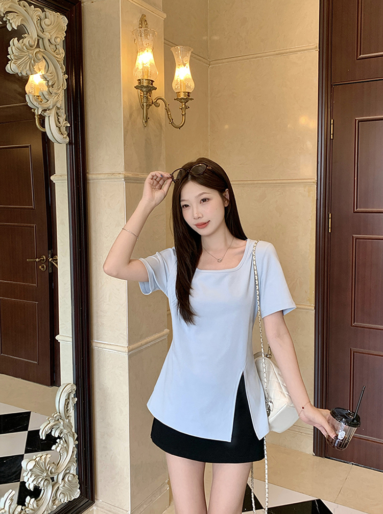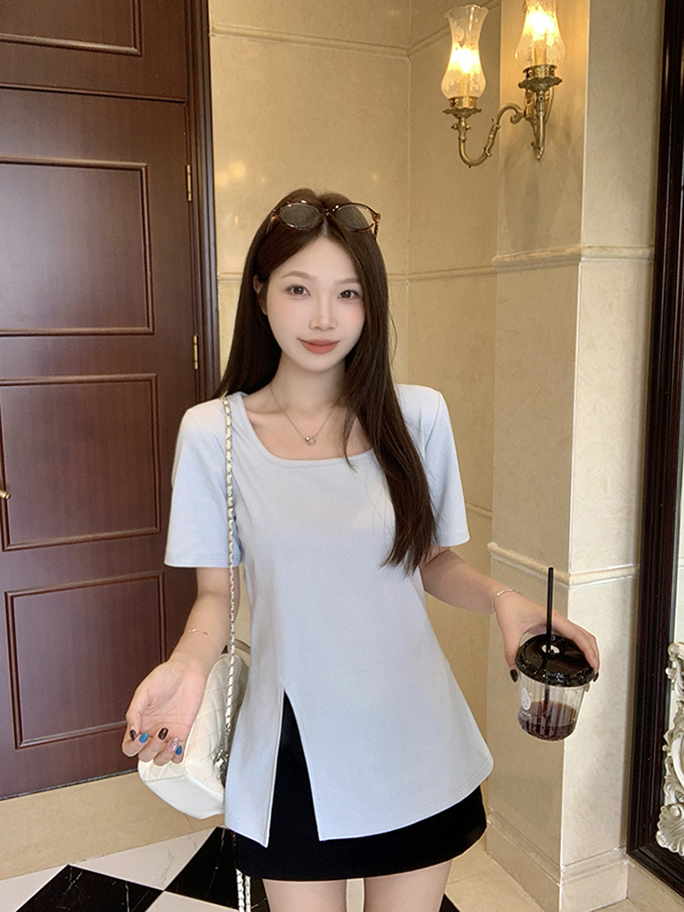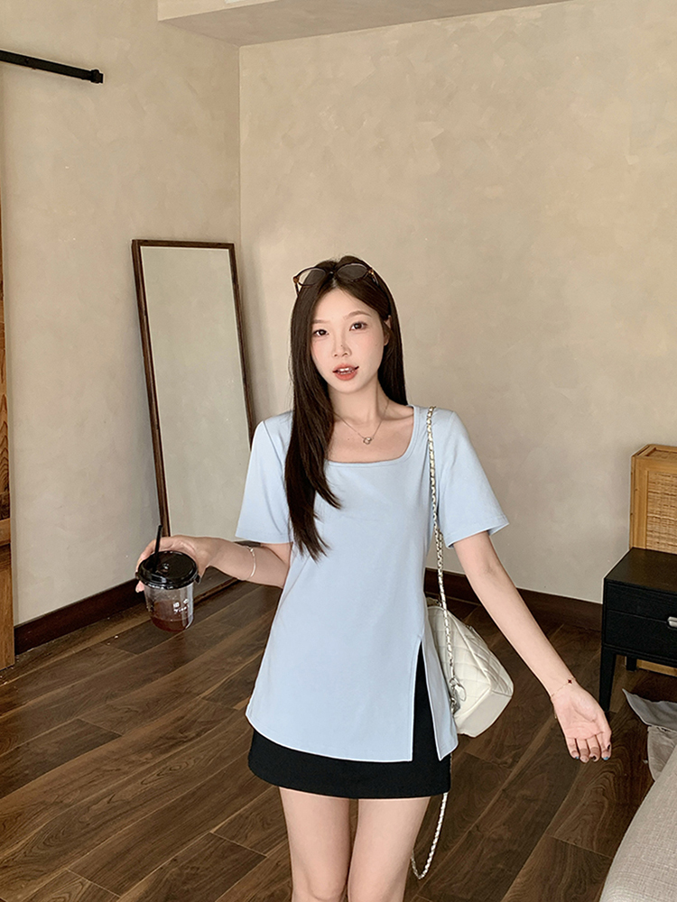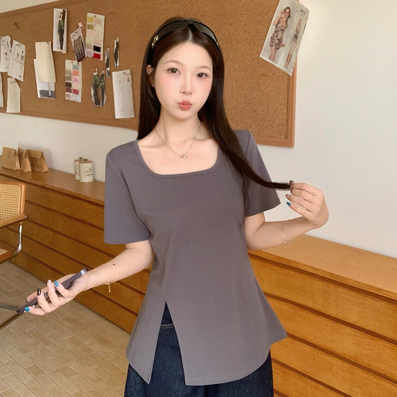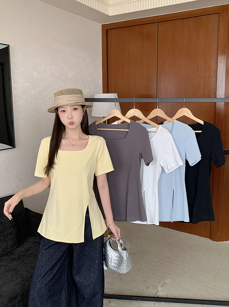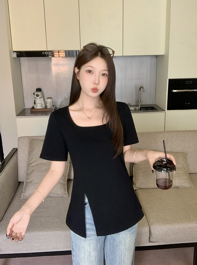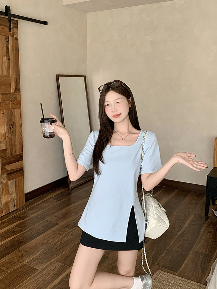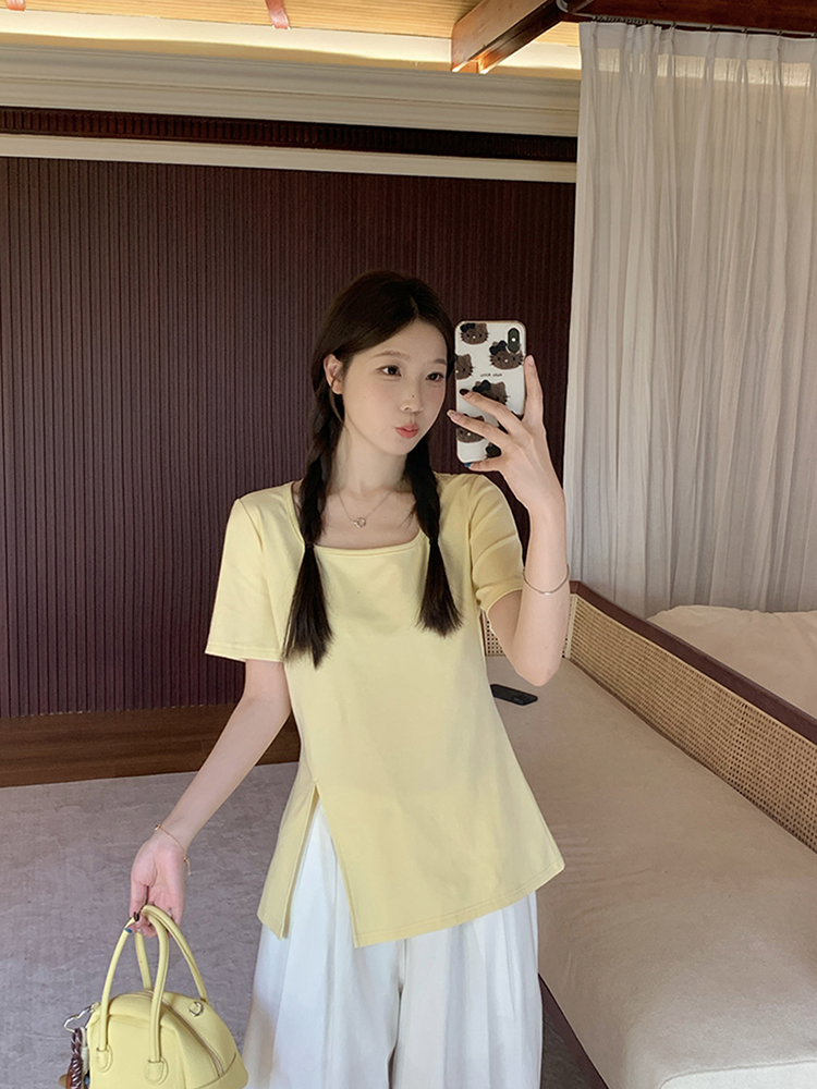 실사 2026 여름 드레스 새로운 지방 mm 빅 사이즈 여성 레저 품격 광장 칼라 불규칙 트임 반팔 티셔츠