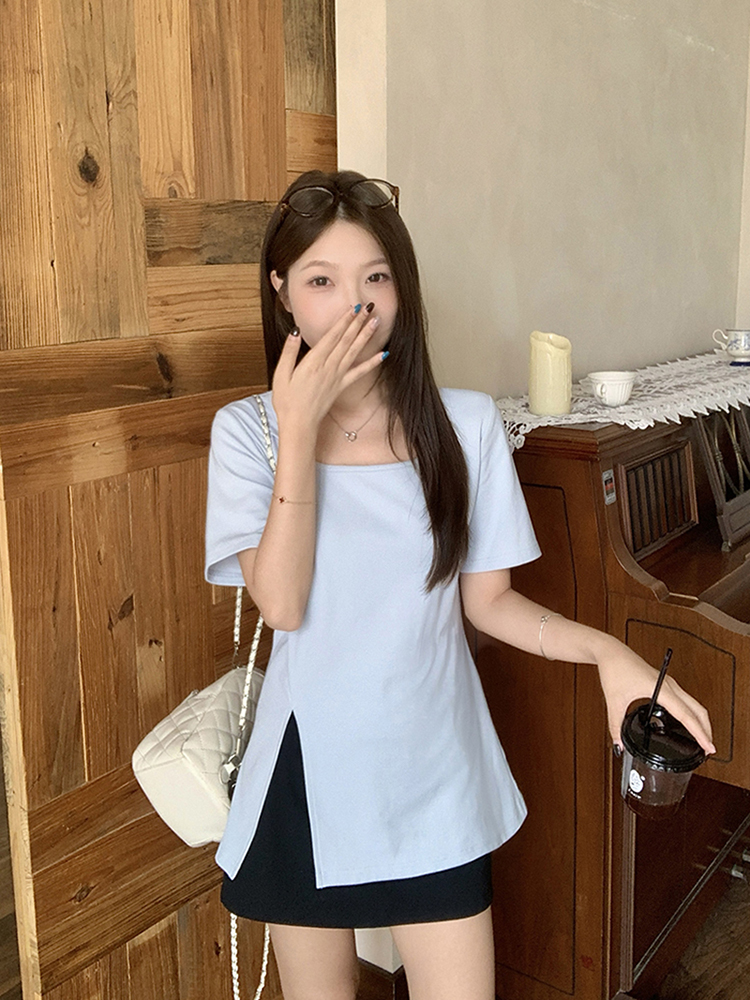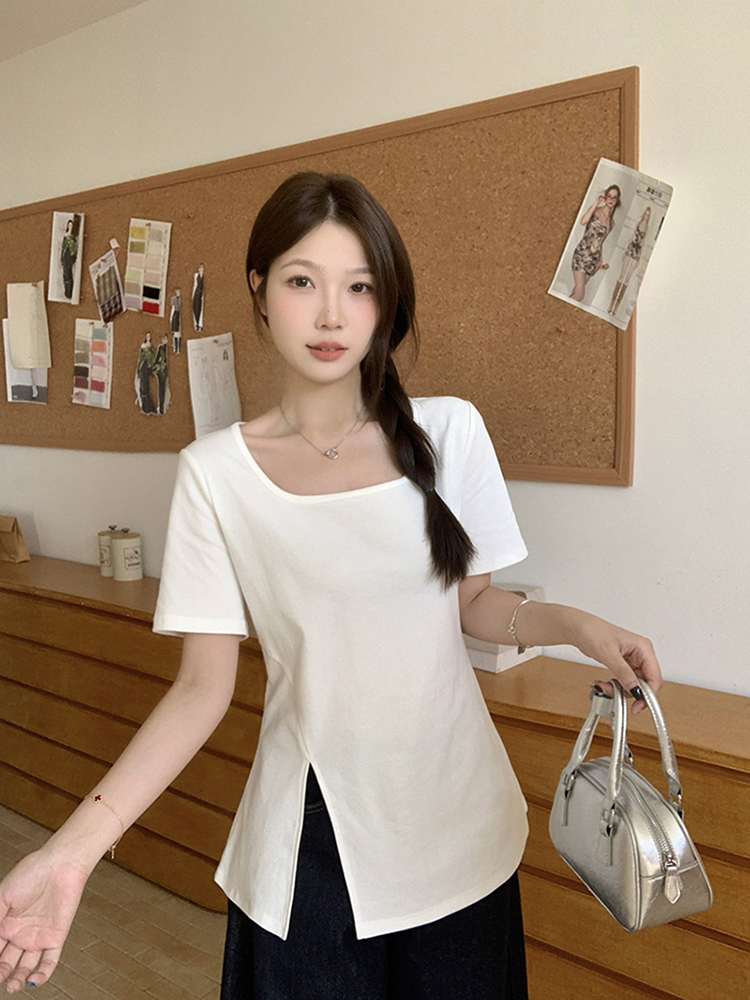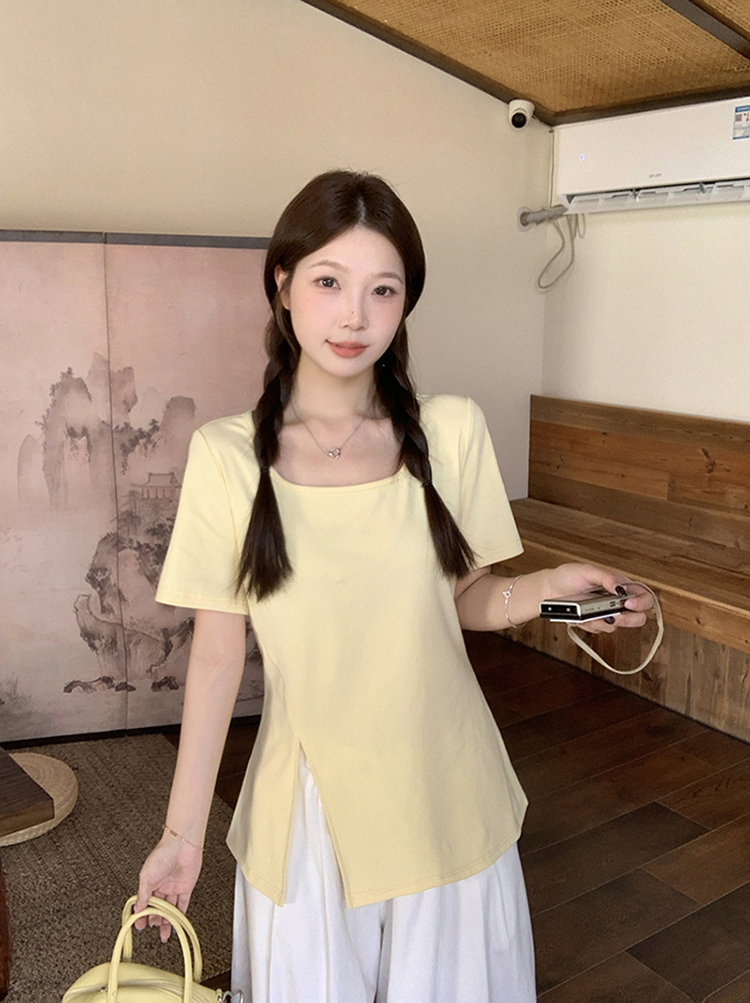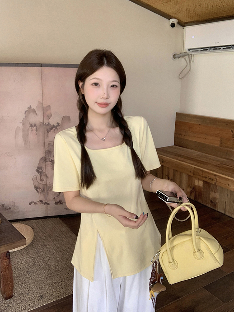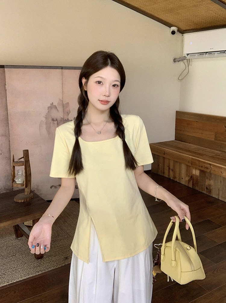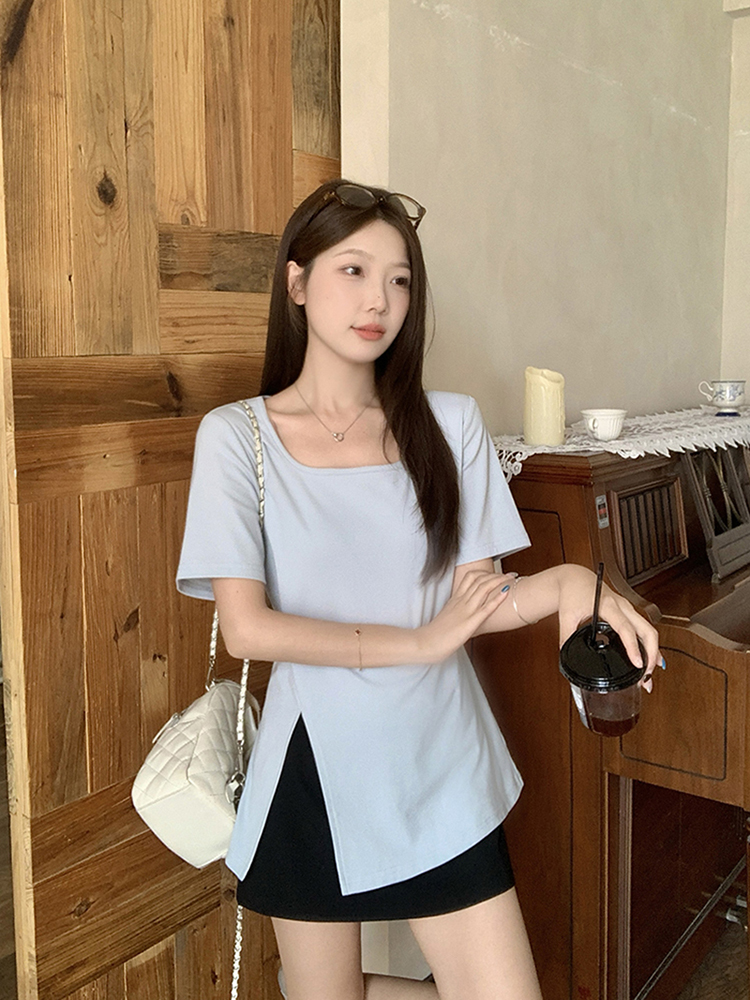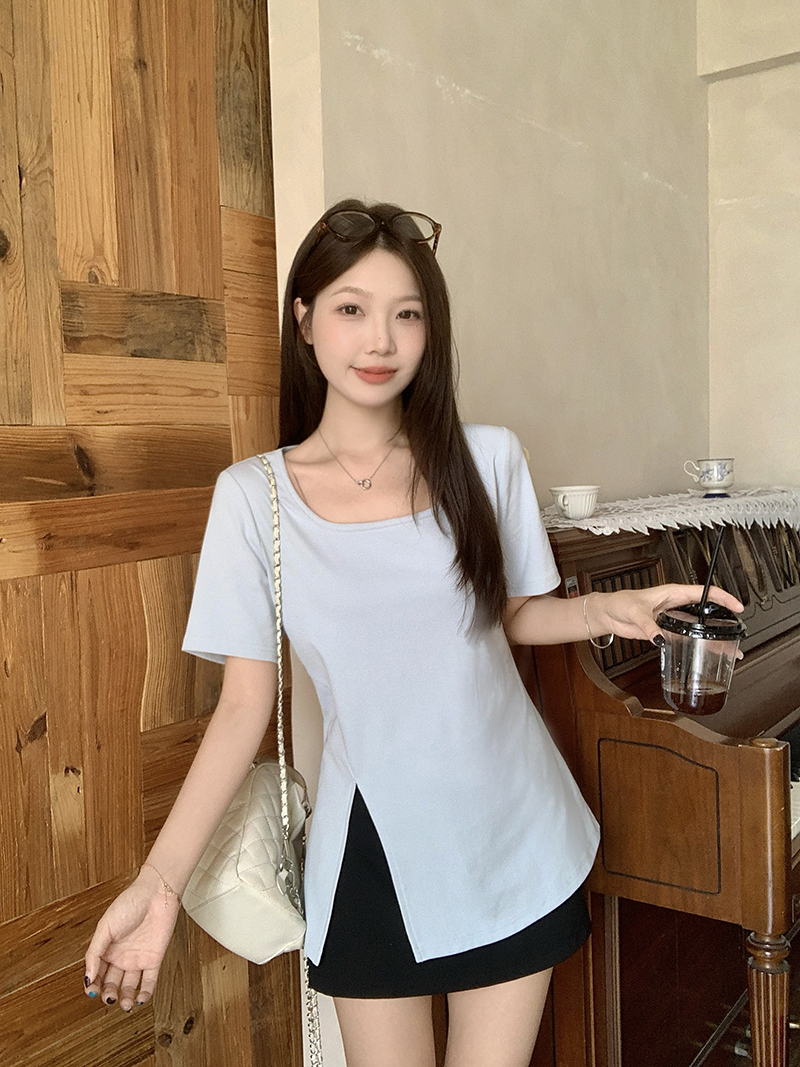 실사 2026 여름 드레스 새로운 지방 mm 빅 사이즈 여성 레저 품격 광장 칼라 불규칙 트임 반팔 티셔츠
