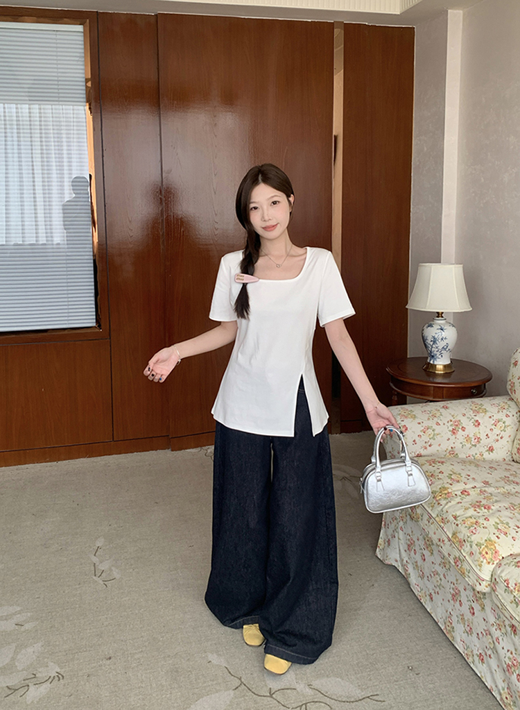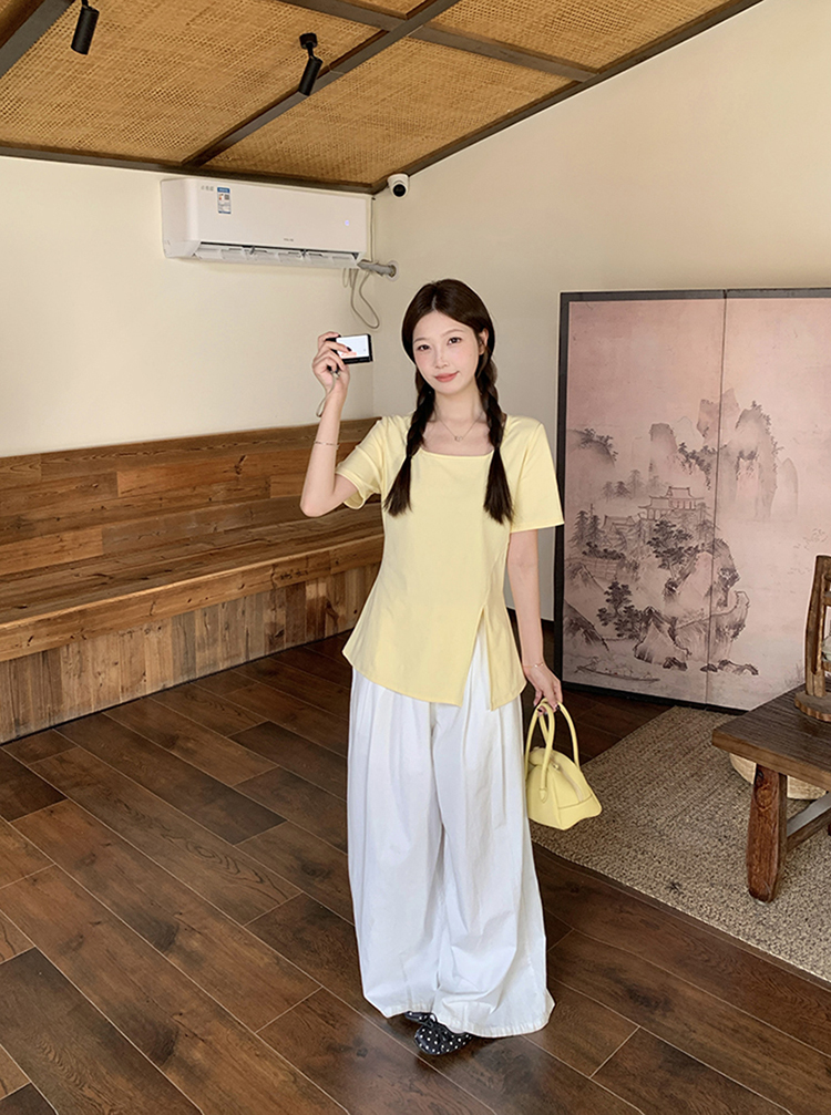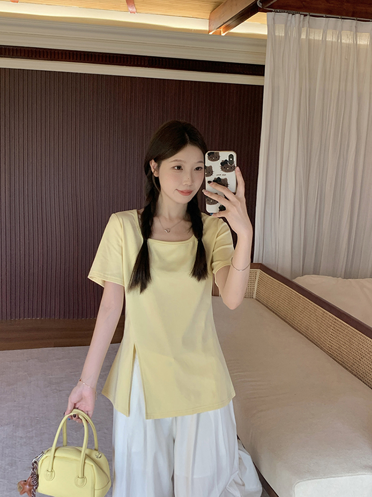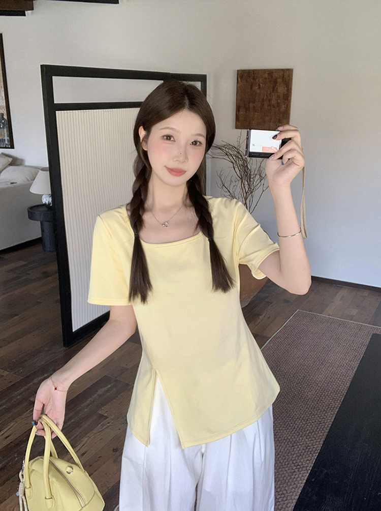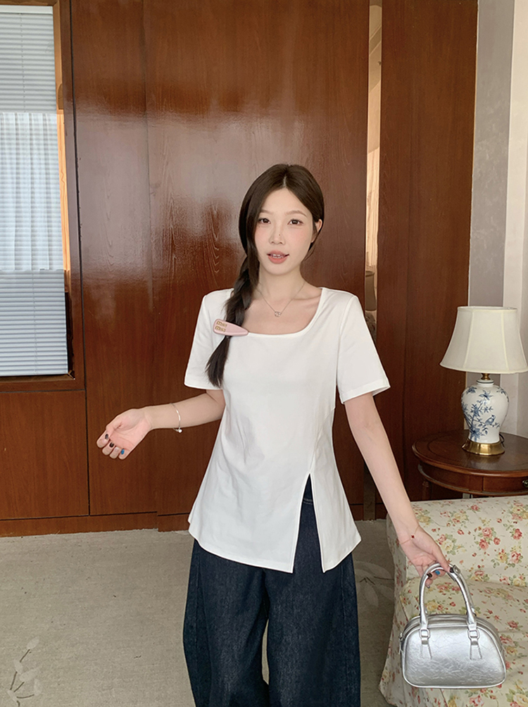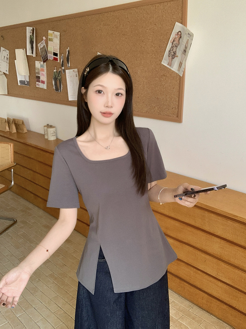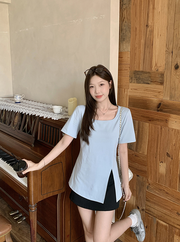 실사 2026 여름 드레스 새로운 지방 mm 빅 사이즈 여성 레저 품격 광장 칼라 불규칙 트임 반팔 티셔츠