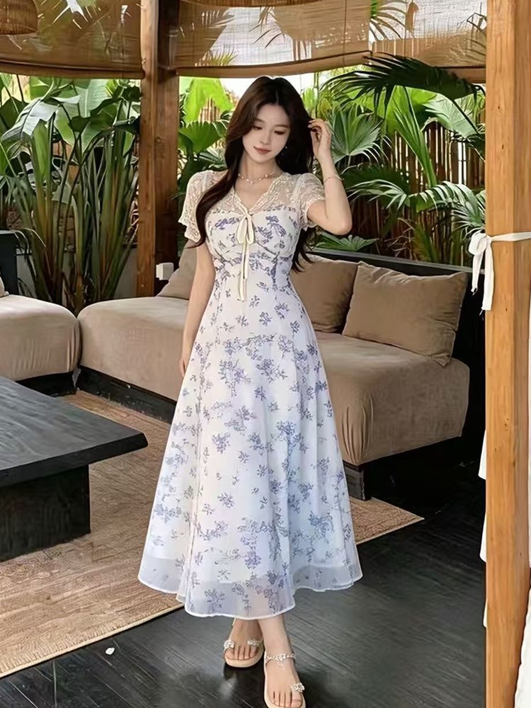 2026 여름 새로운 지방 mm 레이스 품격 롱 스커트 프랑스식 부드러운 바람 V넥 꽃무늬 허리 수축 슬림해 보이는 드레스