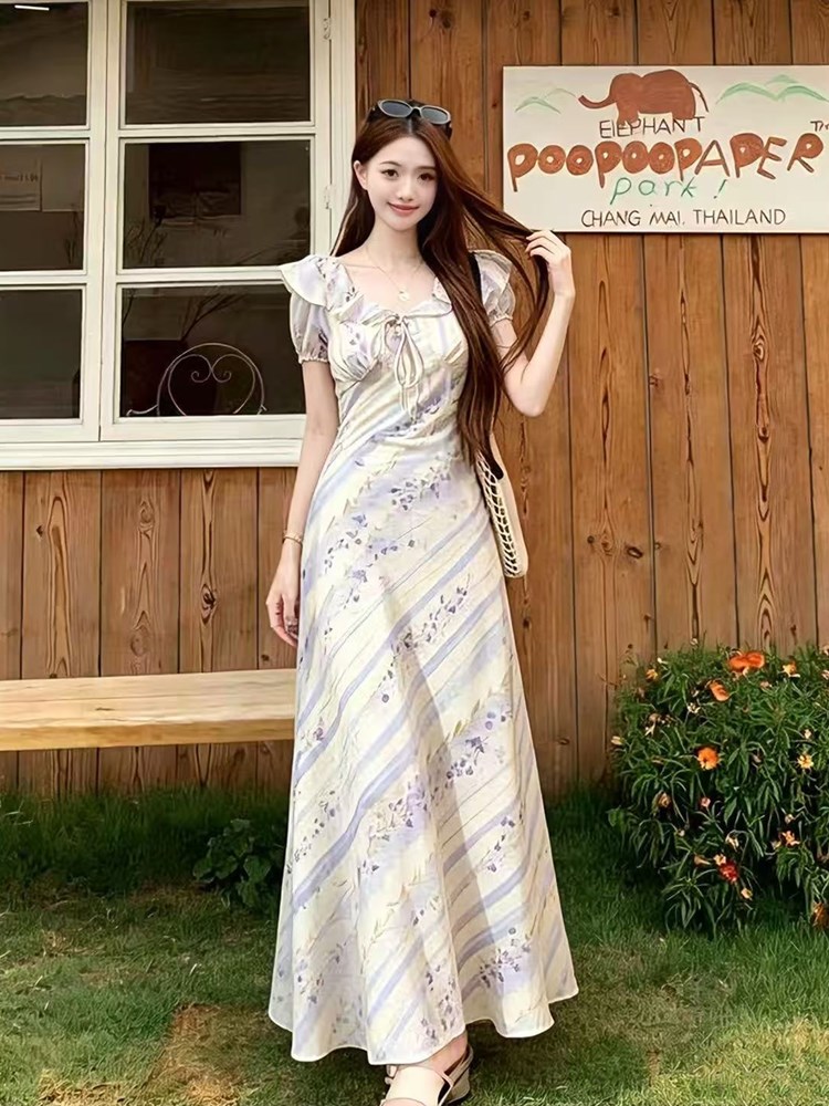 2026 여름 새로운 지방 mm 프랑스식 디자인 센스 등나무 꽃 프릴 칼라 프린트 품격 슬림해 보이는 롱 코트 드레스