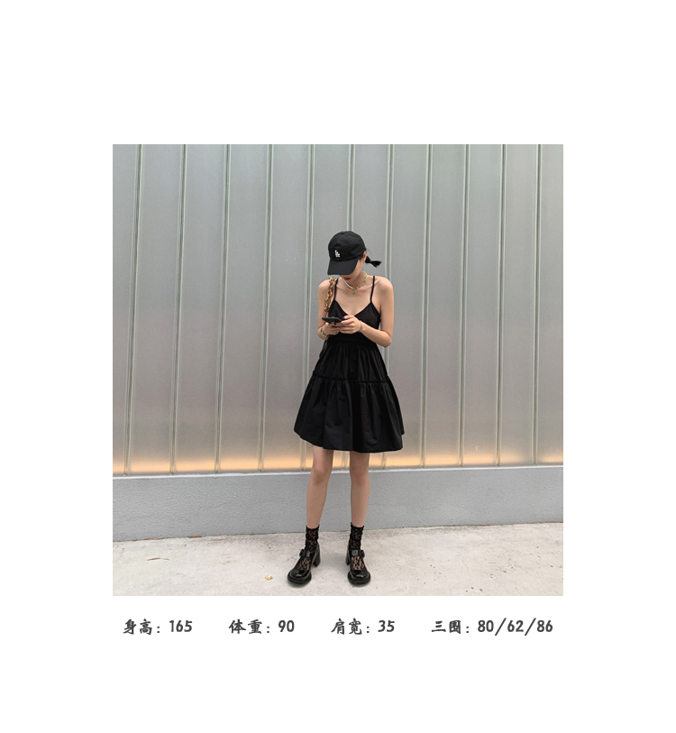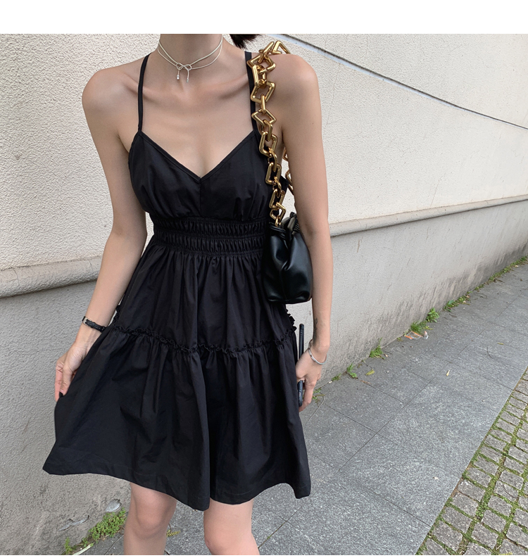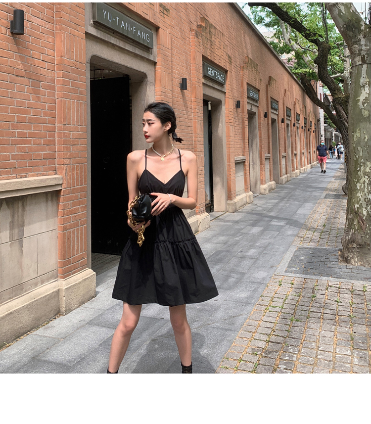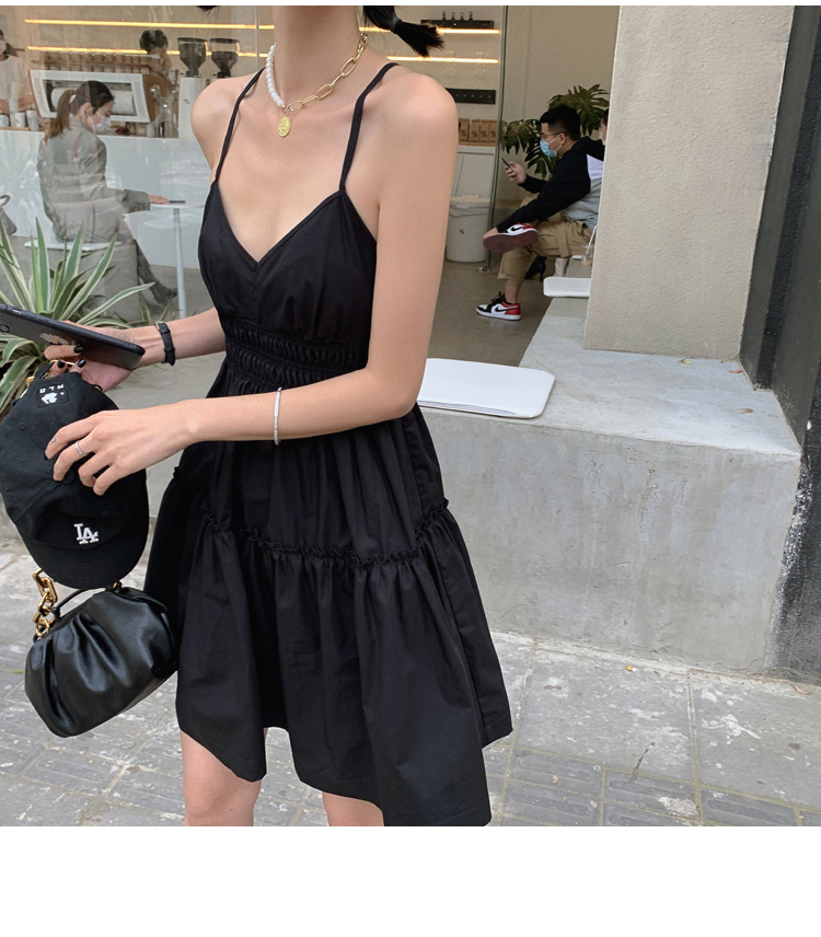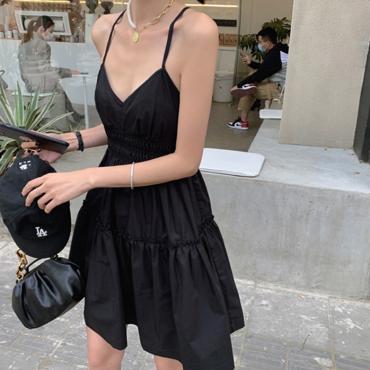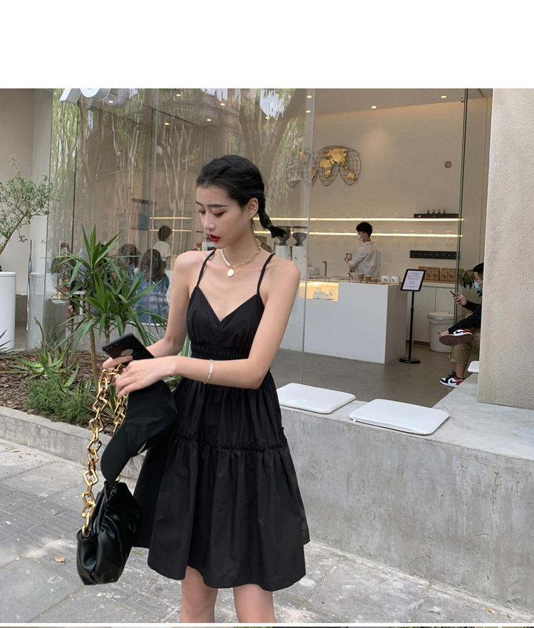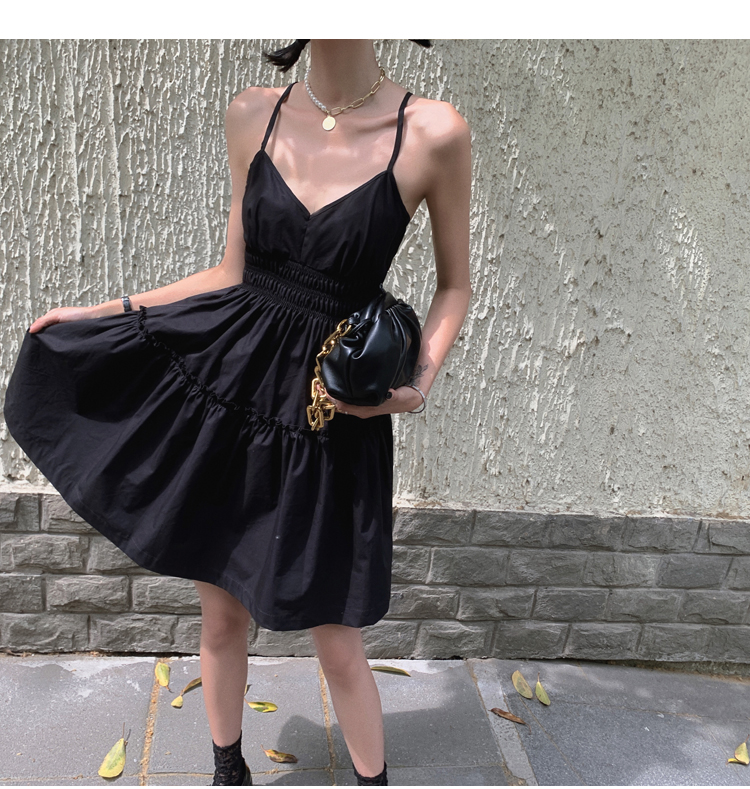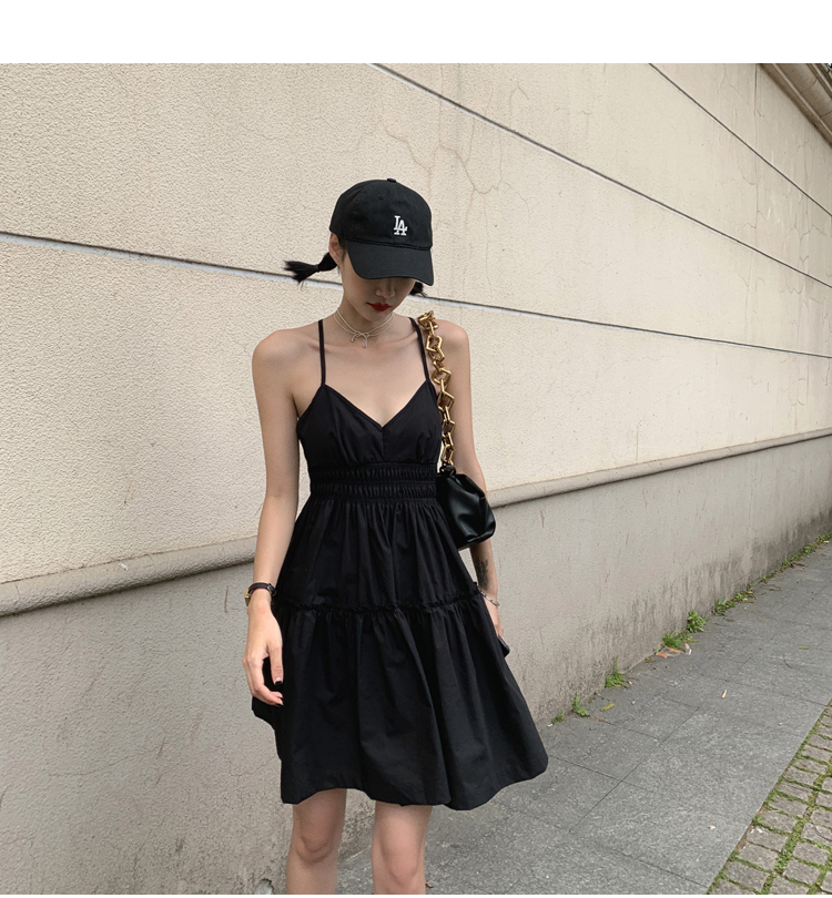 실사 2026 여름 드레스 새로운 검정색 슬립 드레스 섹시함 V넥 심장 기계 허리 수축 퍼프 큰 진자 작은 검은 드레스