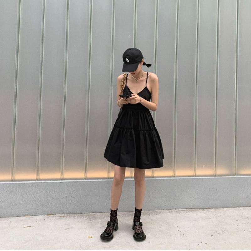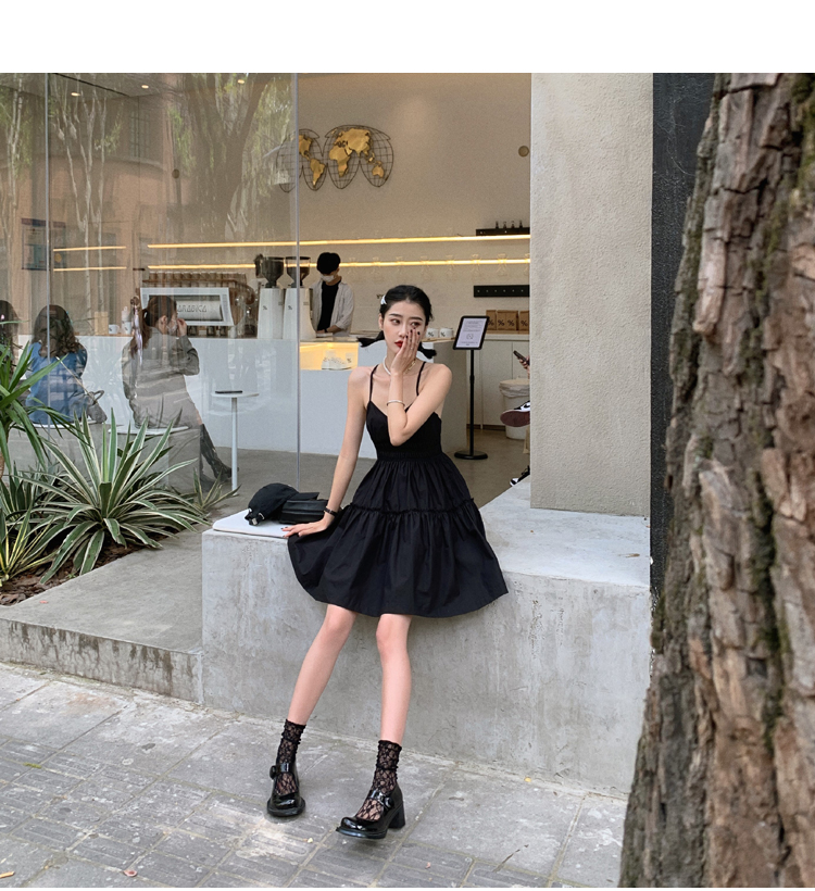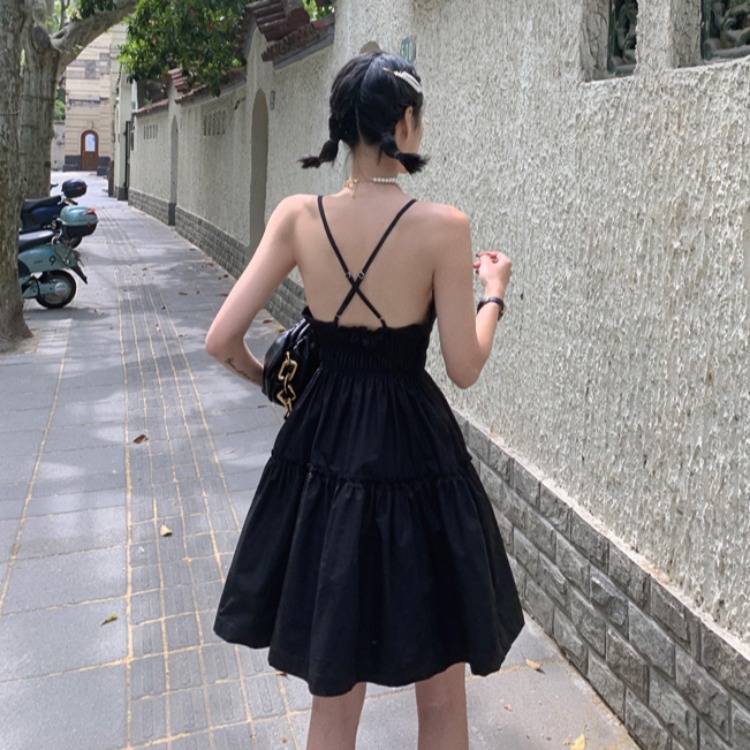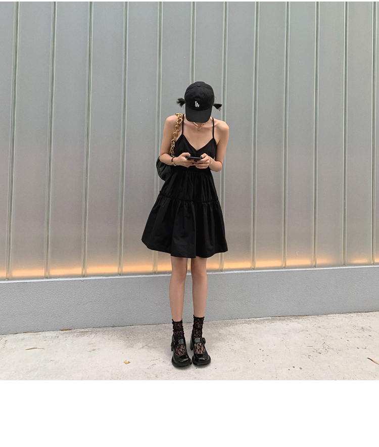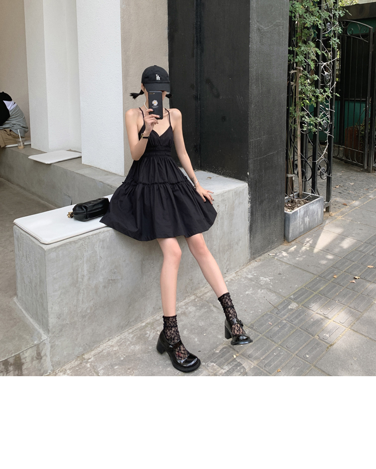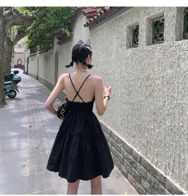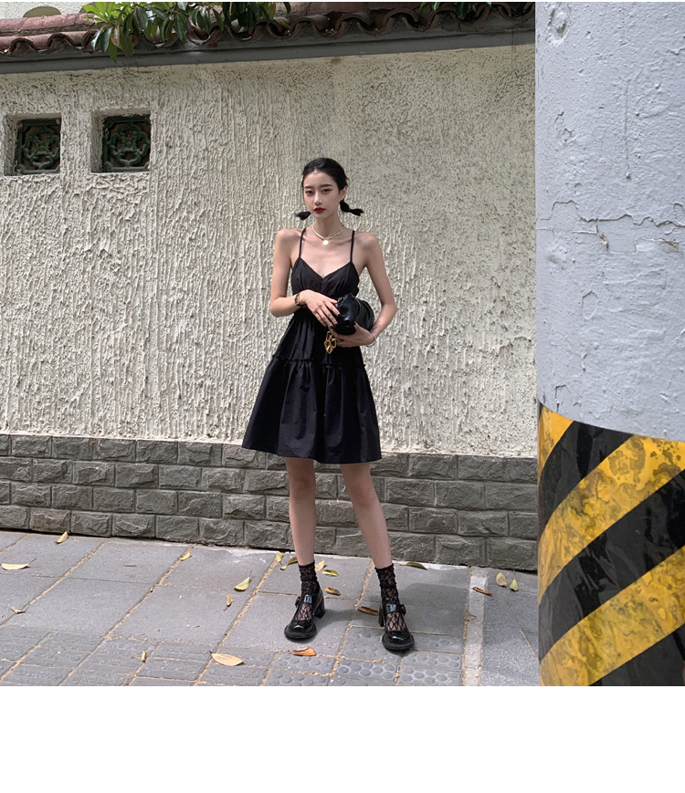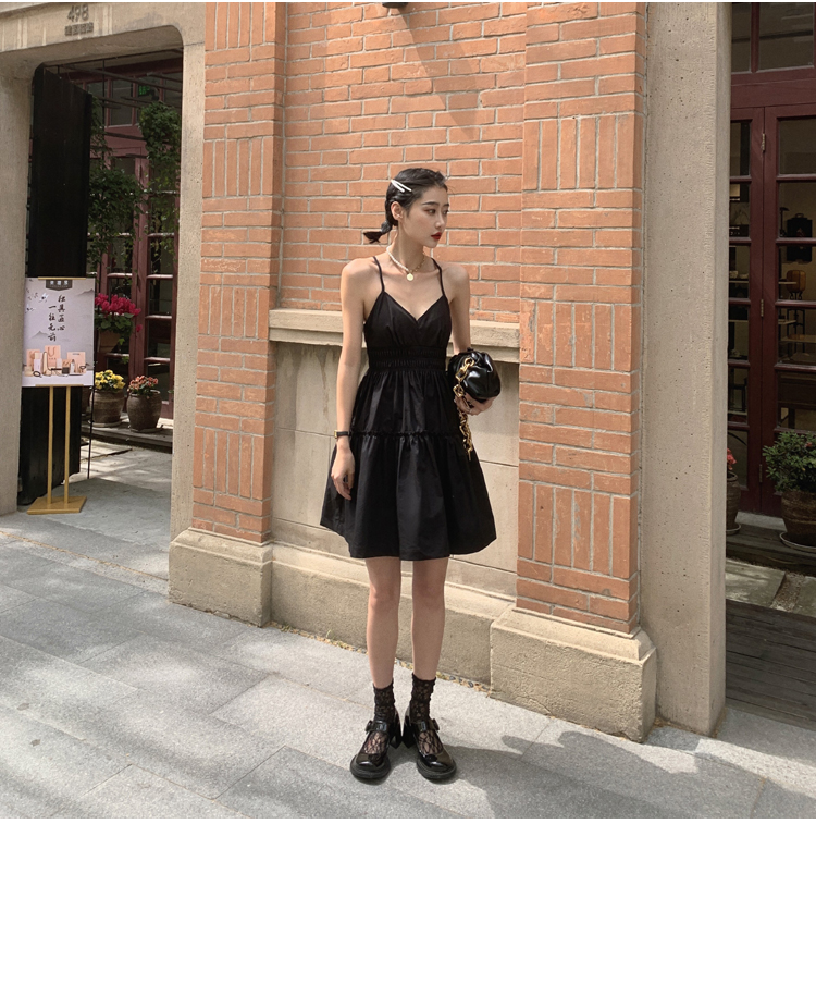 실사 2026 여름 드레스 새로운 검정색 슬립 드레스 섹시함 V넥 심장 기계 허리 수축 퍼프 큰 진자 작은 검은 드레스