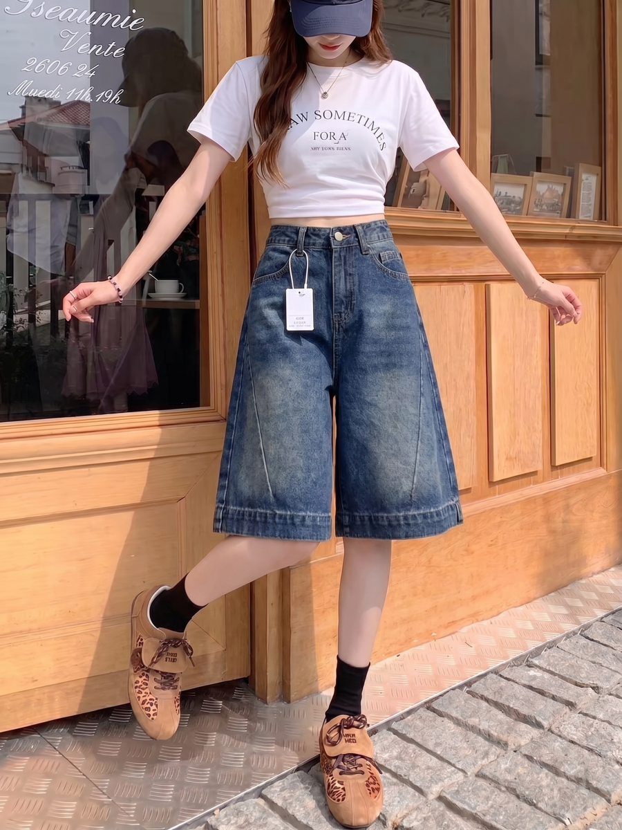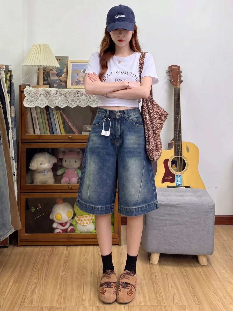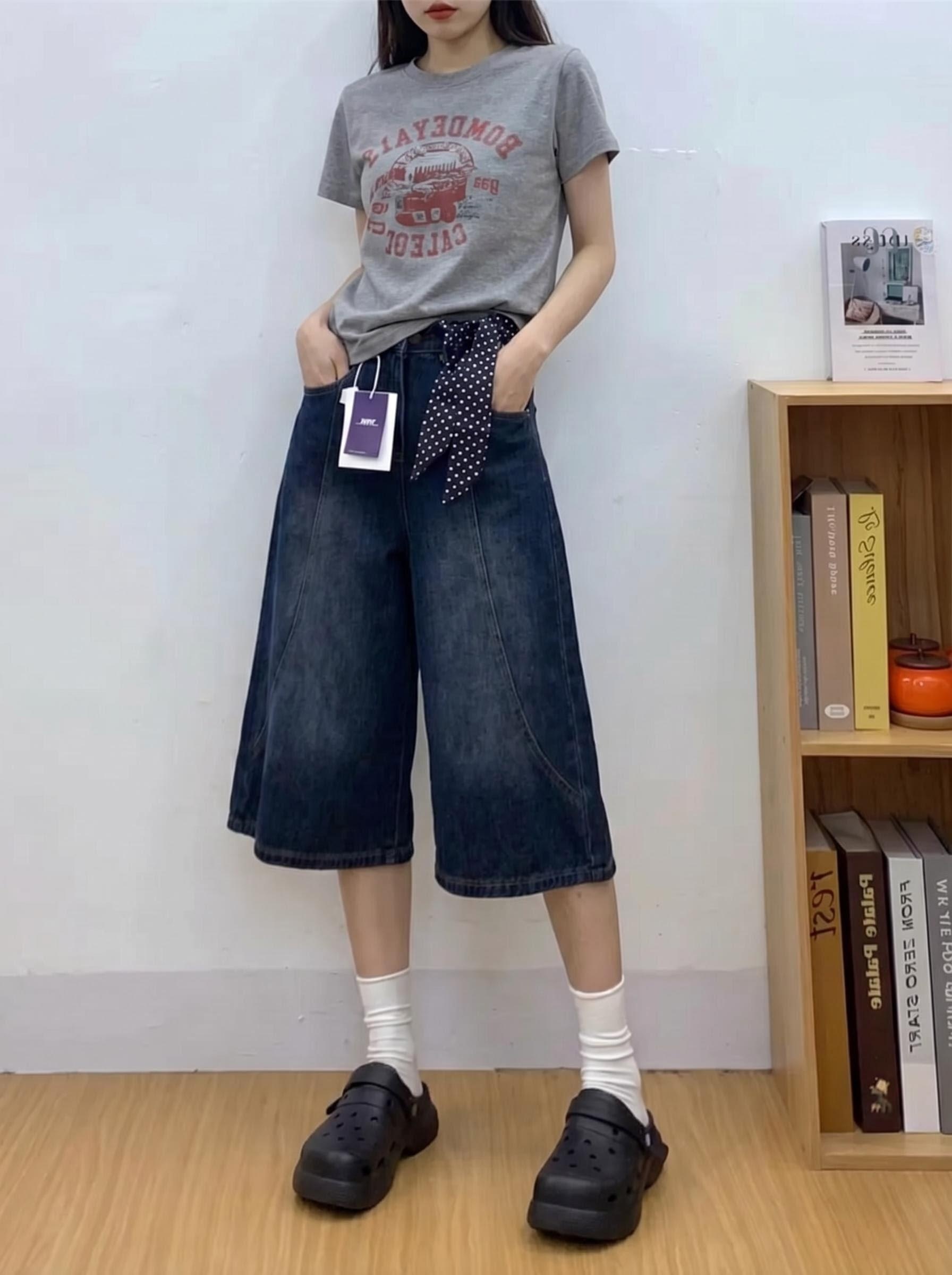 실사 빅 사이즈 디자인 센스 7 점 데님 반바지 여성 여름 지방 mm 루즈핏 슬림해 보이는 하이웨이스트 스트레이트 넓은 다리 바지