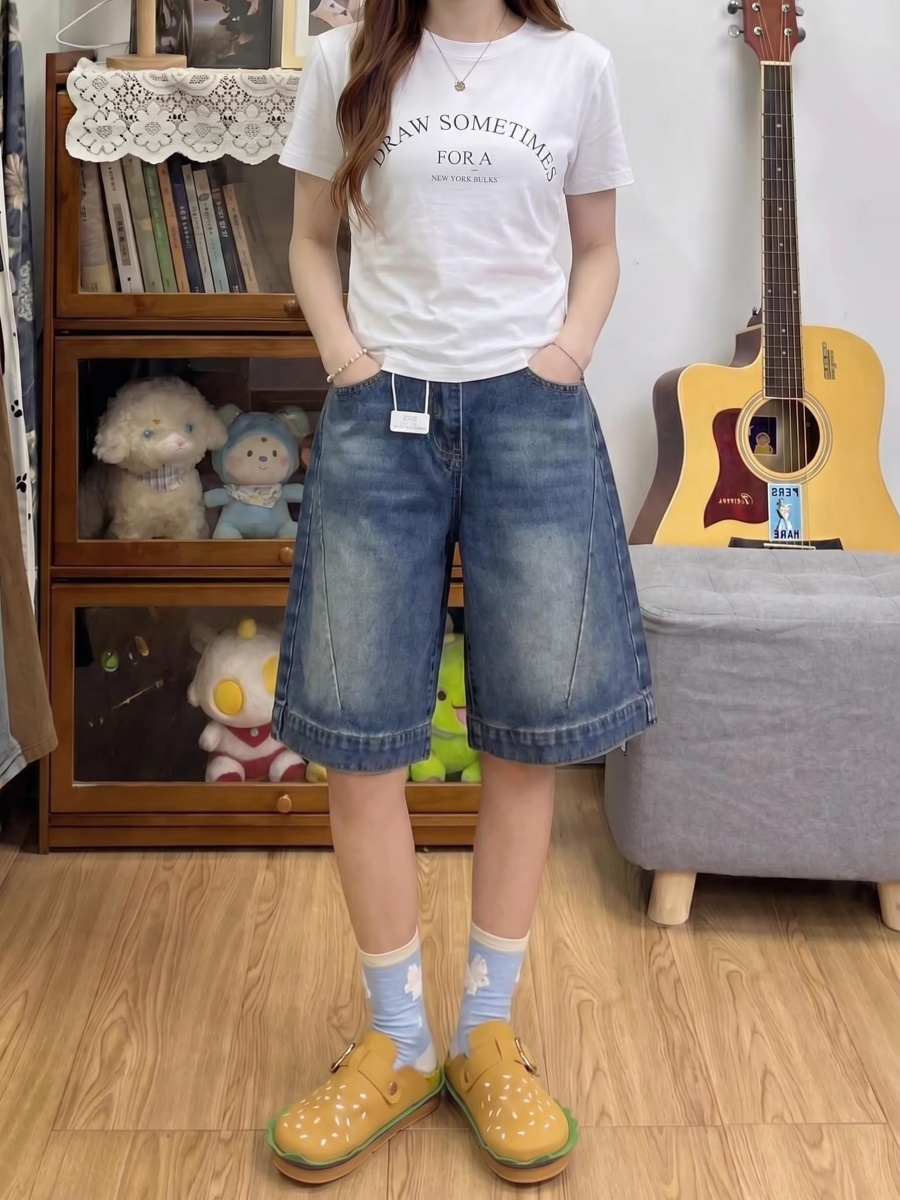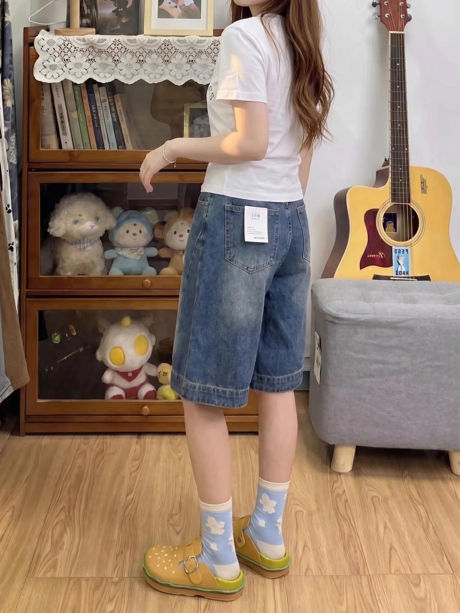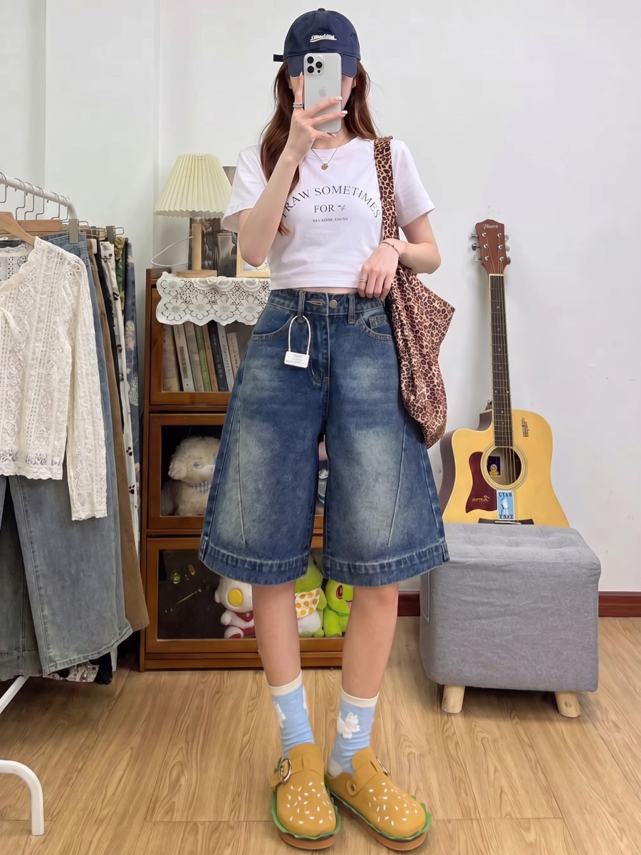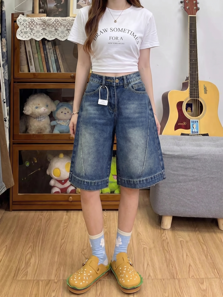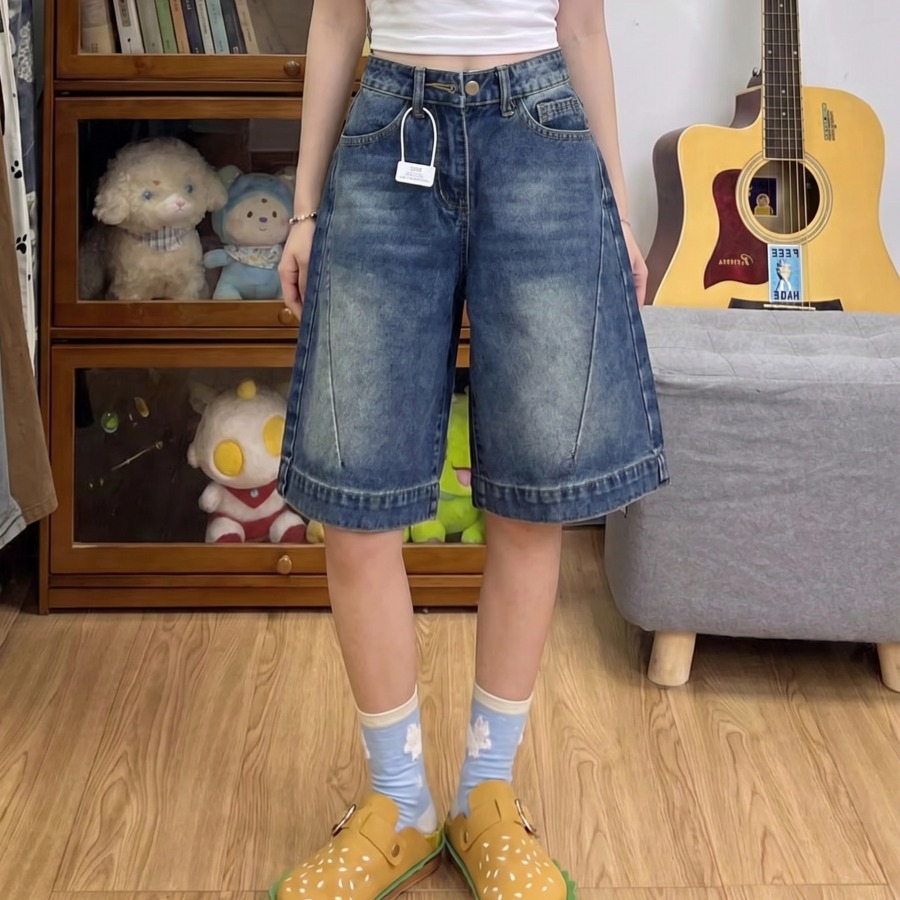 실사 빅 사이즈 여성 의류 5 점 청바지 여성 여름 새로운 루즈핏 슬림해 보이는 반바지 하이웨이스트 도루 센스 스트레이트 팬츠
