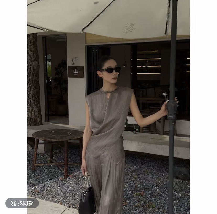 고급 센스 품격 아마 세트 여성 여름 새로운 품격 맨위 와이드 레그 팬츠 패션 슬림해 보이는 통기성 투피스 세트