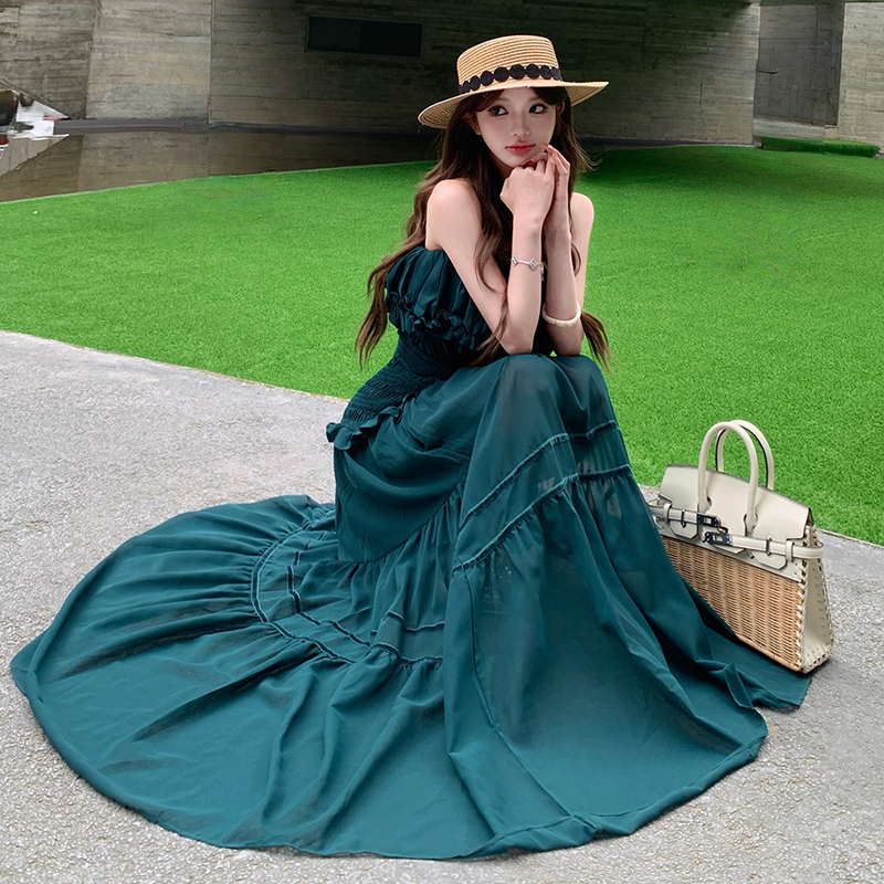 섬 여행 사진 찍기 휴가 해변 드레스 여성 여름 품격 한 단어 오프숄더 꽃무늬 쉬폰 튜브탑 점프 슈트 롱 스커트