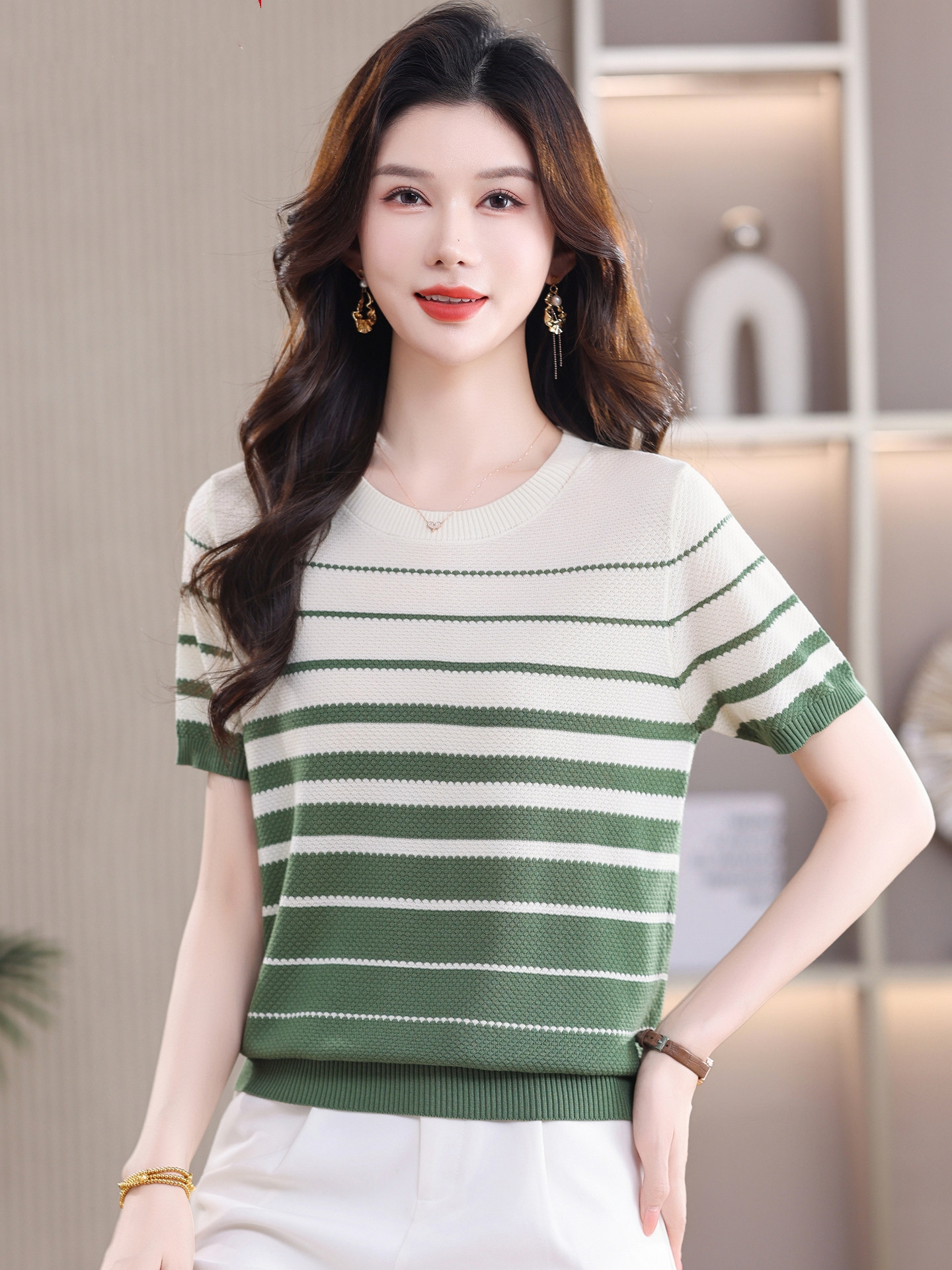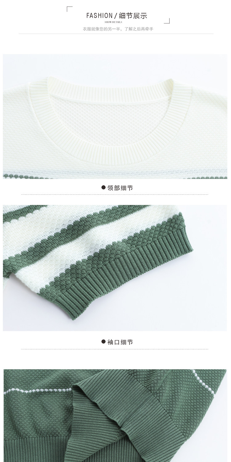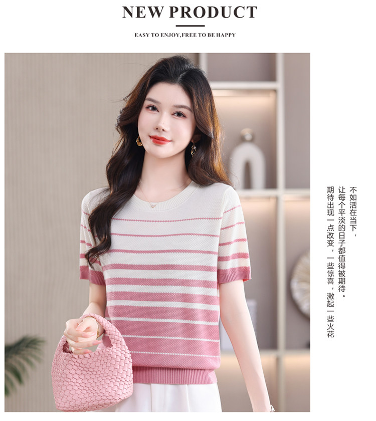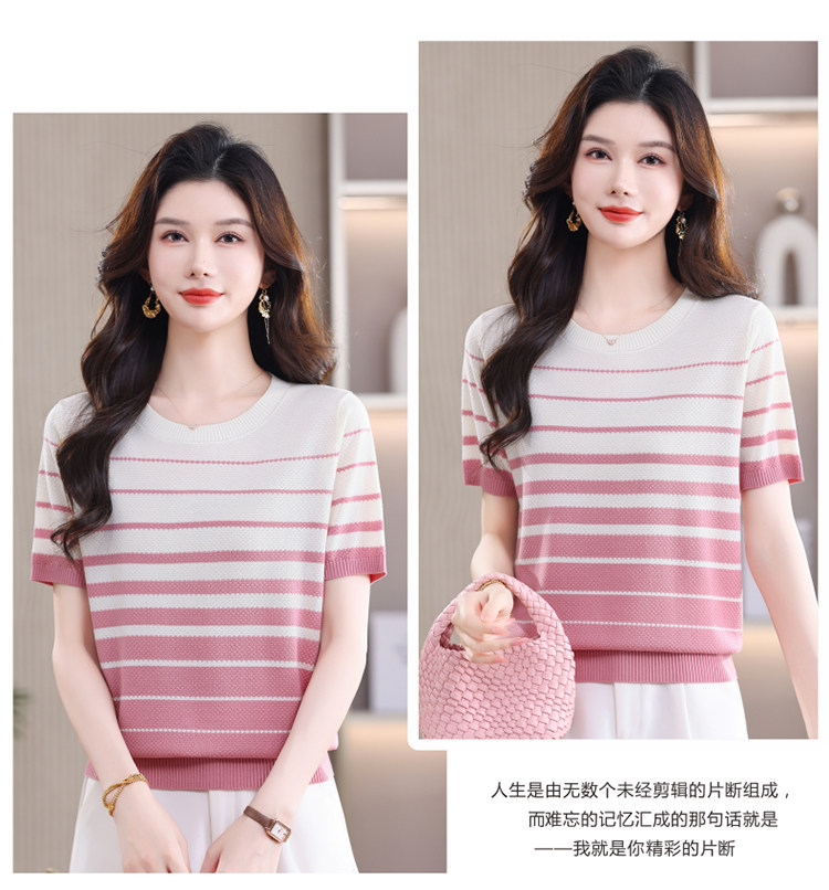 고급 센스 배색 스트라이프 라운드 넥 반팔 니트 스웨터 여성 2026 여름 섹션 긍정적 인 어깨 몸매 가꾸기 맨위