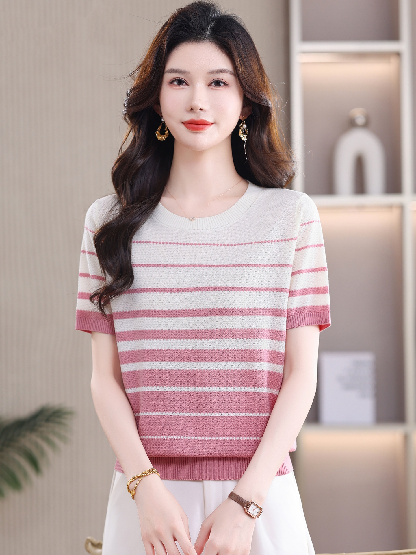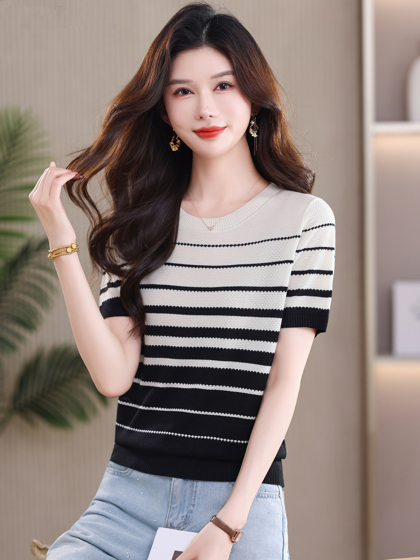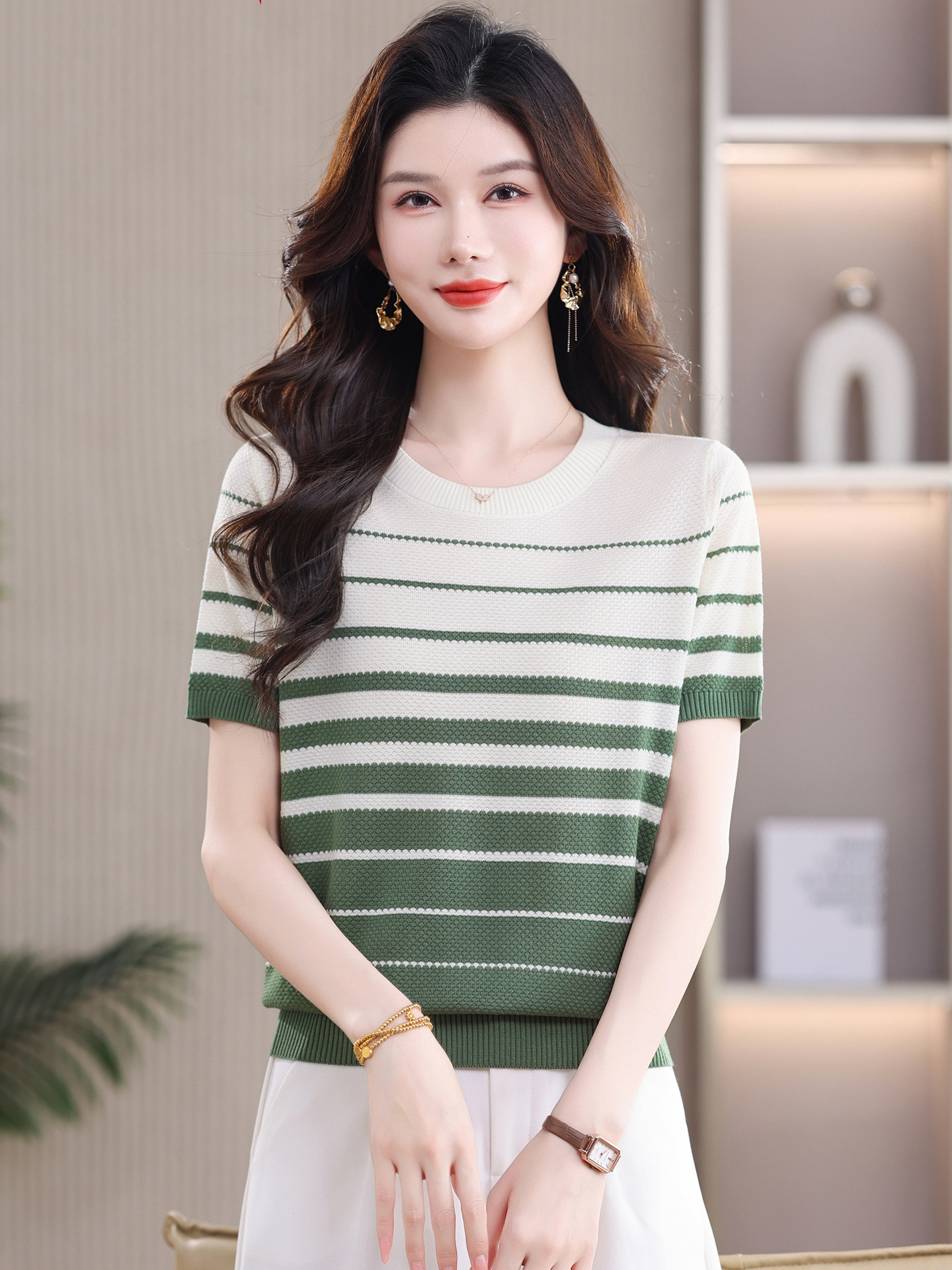 고급 센스 배색 스트라이프 라운드 넥 반팔 니트 스웨터 여성 2026 여름 섹션 긍정적 인 어깨 몸매 가꾸기 맨위