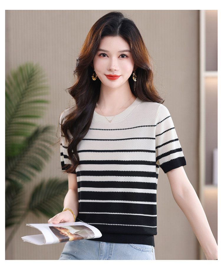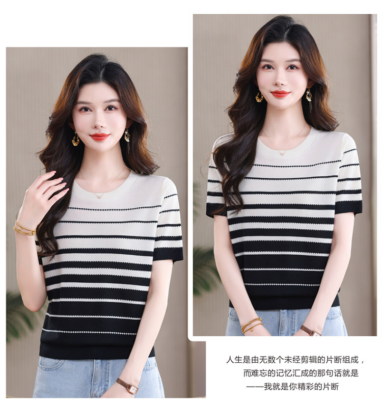 품격 긍정적 인 어깨 폴로 칼라 여름 얇은 스타일 스트라이프 니트 반팔 여성 검정색 슬림해 보이는 빅 사이즈 루즈핏 중간 소매 티셔츠 맨위