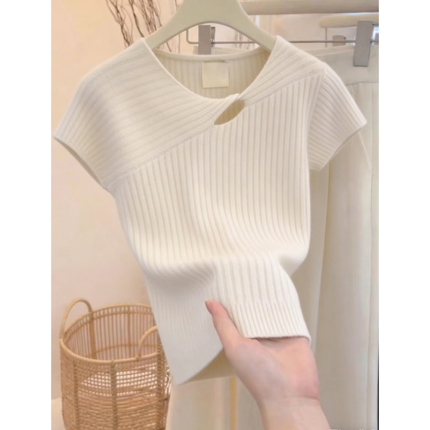 2026 여름 새로운 여성 한 부서 디자인 센스 패션 품격 캐주얼 반팔 슈퍼 잘 생긴 니트 티셔츠 맨위