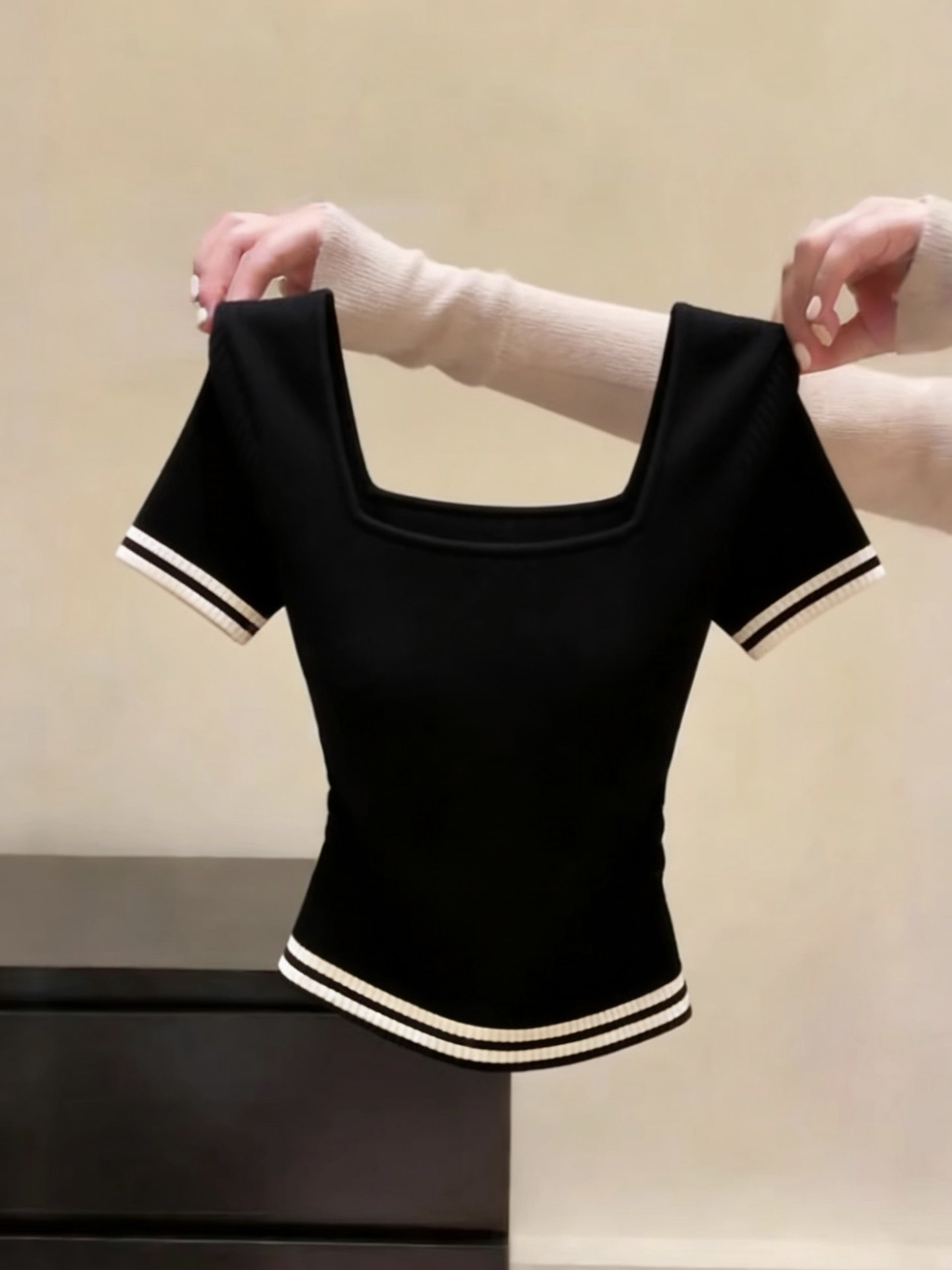 패션 고급 센스 검정색 광장 칼라 반팔 니트 스웨터 여성 여름 새로운 슈퍼 잘 생긴 다용도 슬림해 보이는 연령 감소 맨위