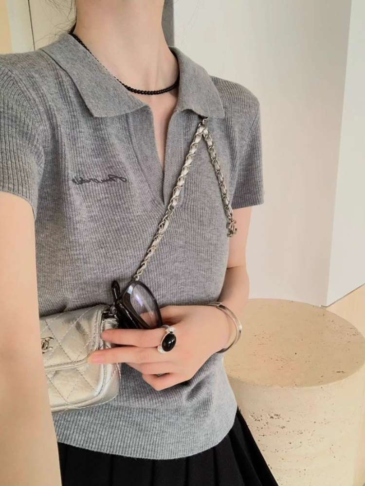 한 부서 회색 니트 얼음 실크 POLO 셔츠 반팔 티셔츠 여성 여름 작은 키 몸매 가꾸기 긍정적 인 어깨 폴로 칼라 맨위 얇은