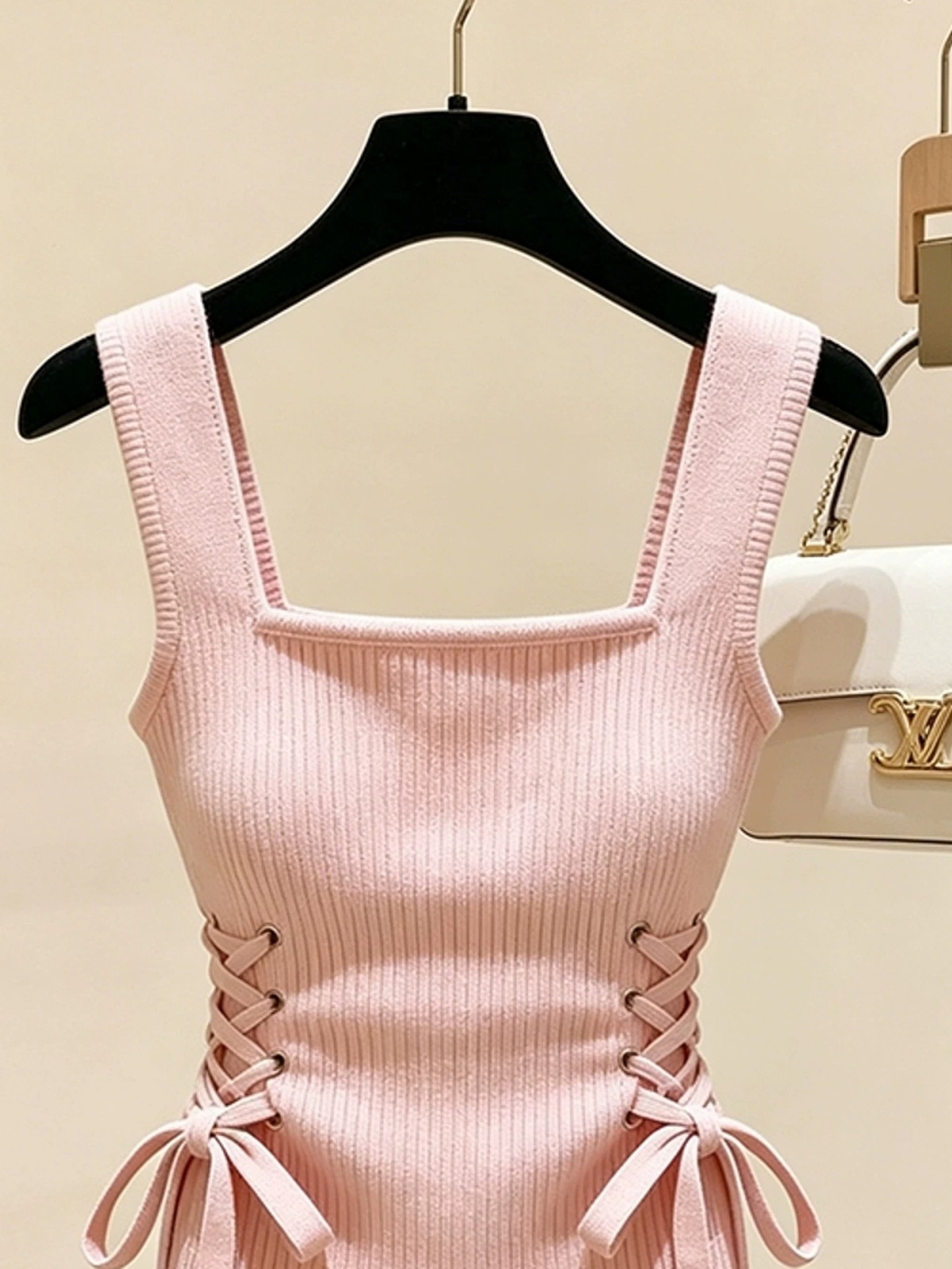 스트랩 디자인 니트 캐미솔 새로운 프랑스식 외국 가스 슬림해 보이는 다용도 작은 대중 허리 수축 민소매 맨위 서비스