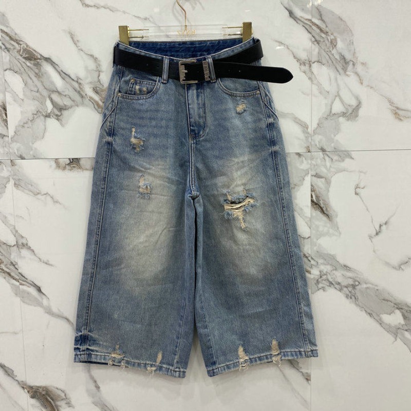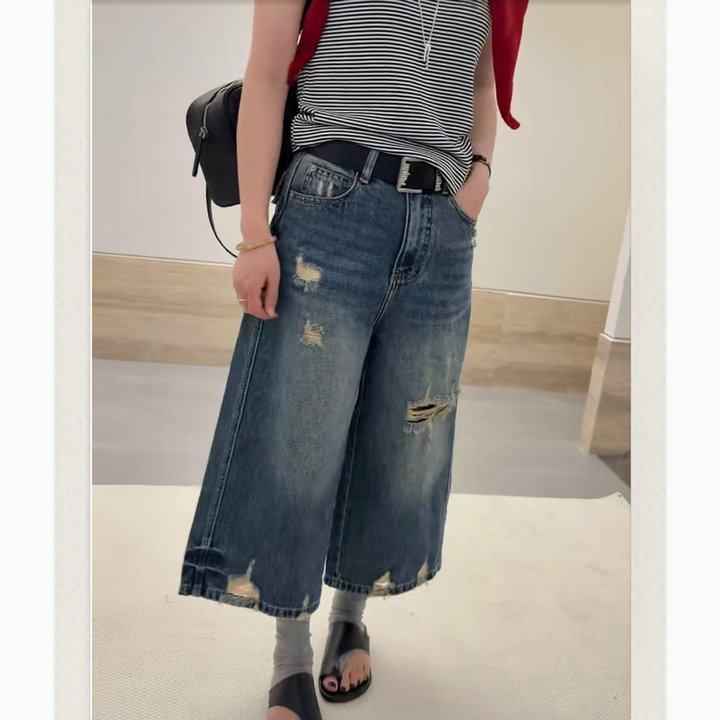 Annan 여름 새로운 개성 루즈핏 슬림해 보이는 와이드 레깅스 바지 작은 키 하이웨이스트 8 점 찢어진 부분 청바지
