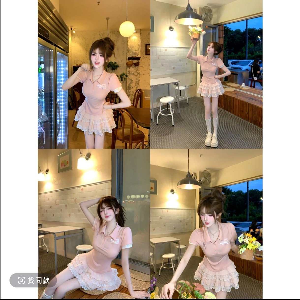 벚꽃 소녀 달콤한 스타일 봄 여름 여성 핑크색 레이스 꽃무늬 허리 수축 슬림해 보이는 점프 슈트 미니 스커트